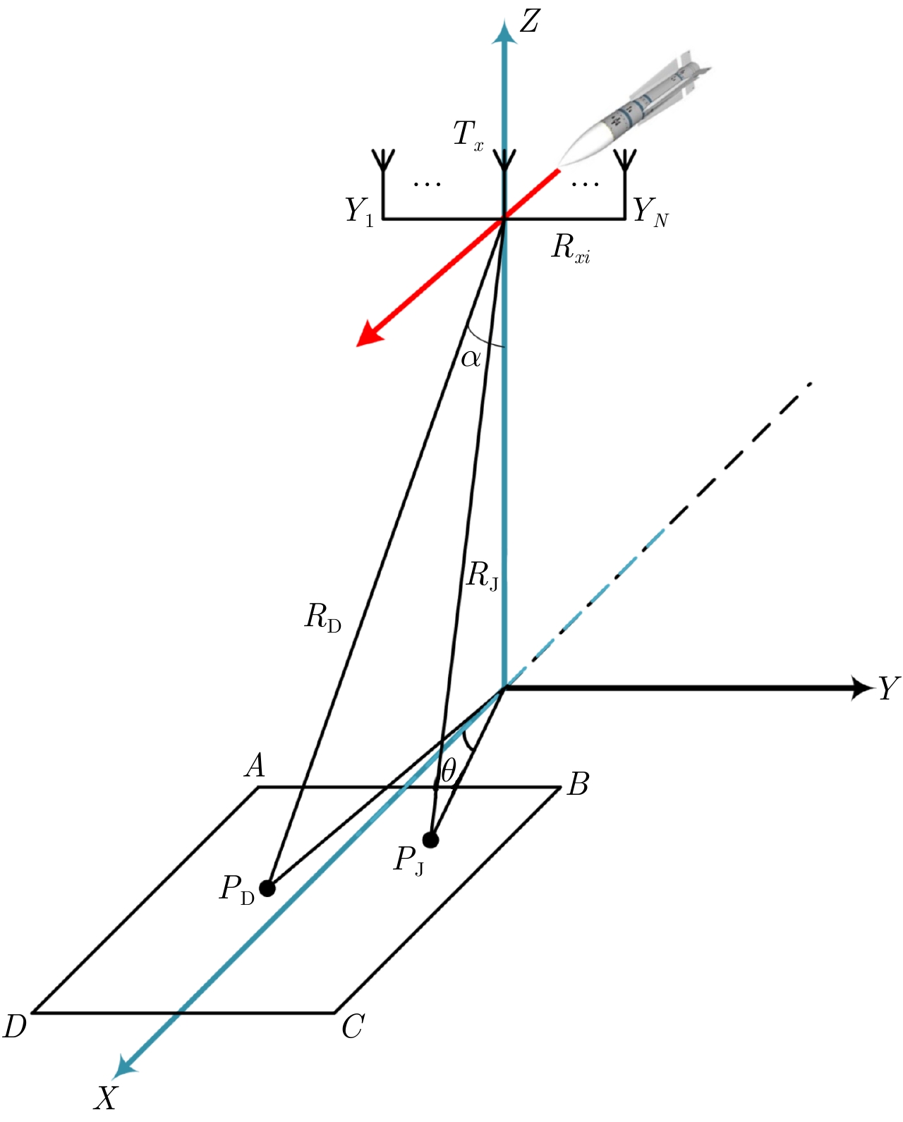 前视合成孔径雷达能够对平台正前方区域进行大范围、高分辨成像[1,2],在军用以及民用中具有良好的应用前景。在军事侦查中,前视SAR系统往往要面对复杂电磁环境。此时,SAR系统将受到一定程度的干扰,当干扰严重时系统将无法有效成像。在众多的干扰方法中,有源欺骗干扰是较难鉴别与抑制的干扰之一[3]。有源欺骗干扰能够在SAR图像上模拟出偏离干扰机位置的大面积虚假目标来掩盖真实目标,使得对真实目标的识别变得更为困难。由于前视SAR多用于弹载制导领域,虚假目标的出现将对弹载信号与信息处理机能否正确识别真实目标产生致命影响,因而鉴别并抑制有源欺骗干扰是前视SAR成像必不可少的处理步骤。