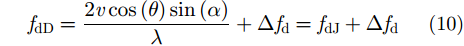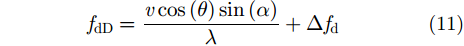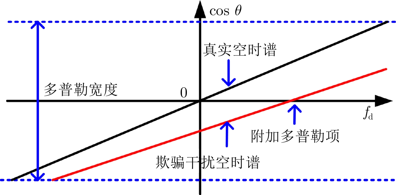 图2中,欺骗干扰空时谱由于附加了一个与实时斜距差有关的多普勒相位,导致欺骗干扰回波空时关系偏离真实空时谱并在多普勒轴上切出一个截距,这一截距正是附加的多普勒值。此时欺骗干扰的空时关系如下: