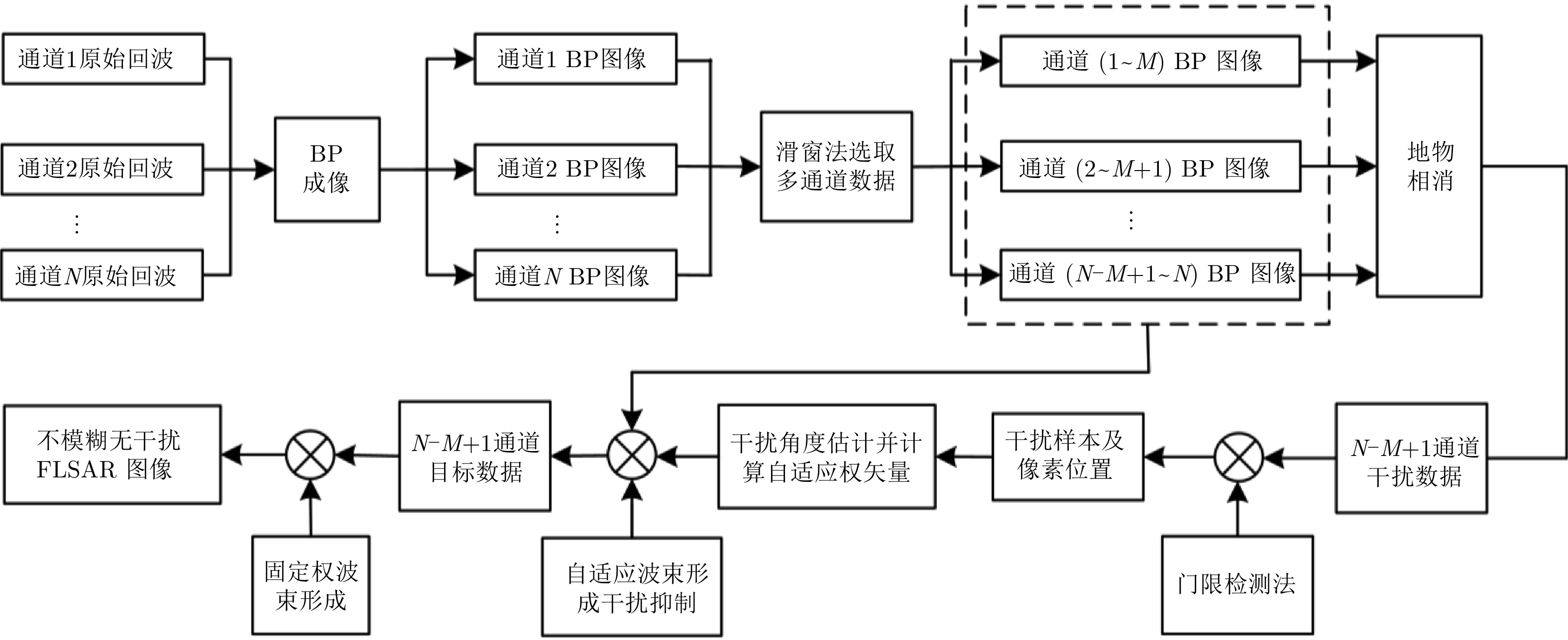 前视多通道合成孔径雷达成像的基本步骤为:回波距离脉压、BP成像[11]、解模糊成像[12,13]。由于干扰不能被解模糊,且解模糊之后将影响干扰样本的提取,所以干扰抑制需在解模糊之前进行。则前视多通道合成孔径雷达抗欺骗干扰成像的算法具体流程见图3。