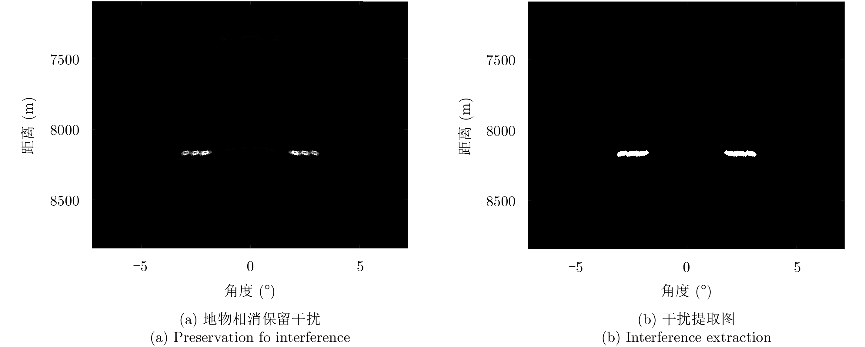 在利用上述地物相消法后,回波数据中的真实地物回波将被完全抑制,使得干信比大大提升。这时可利用门限检测法获得具有高干信比的干扰样本,利用高干信比的干扰样本将得到精确的干扰估计角度。最后,利用空域自适应波束形成对含干扰数据进行空域滤波便能够有效地抑制所有干扰,得到无干扰图像。