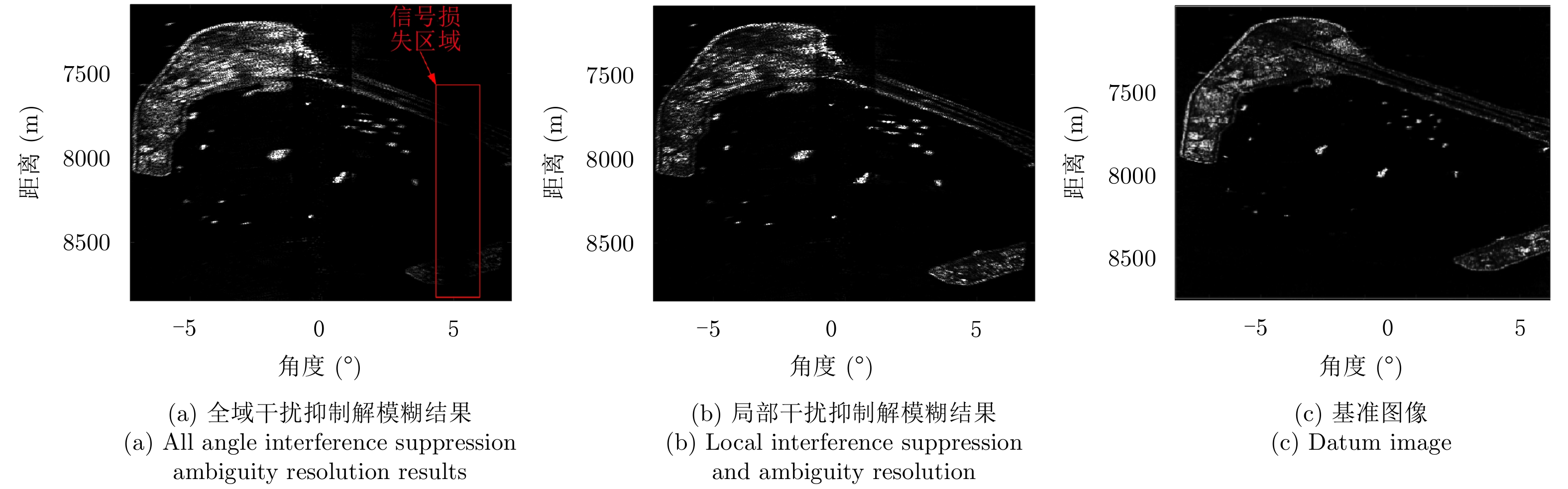 从结果图可以看出,传统的全空域干扰抑制法在去除干扰的同时,使得场景右边干扰机附近的图像被抑制,形成一条黑带区域,图像信息损失。这一点从表2也可以看出,其中信号与干扰都被抑制了30.75 dB。而本文所提的局部干扰抑制法几乎对图像无损失,图像信息被完整保留。且从表2可以看出,此时的干扰抑制性能良好。