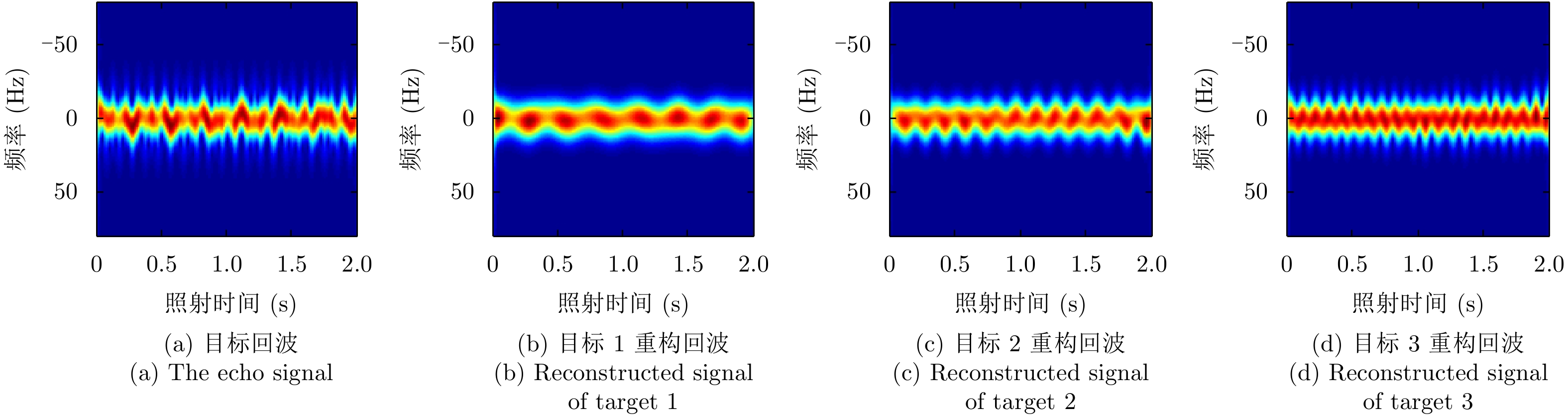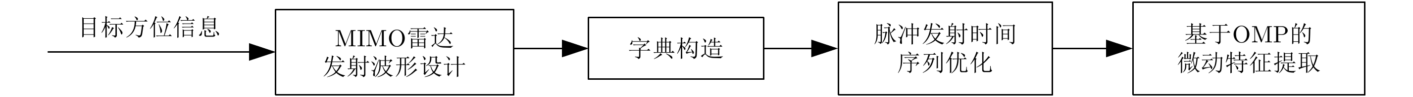 微动特征是空间目标识别的重要特征信息之一。然而,现有的多功能多输入多输出(Multi-Input Multi-Output, MIMO)雷达通常需要在完成目标搜索和跟踪任务之后为目标微动特征提取分配大量连续的时间资源,导致目标识别实时性能和雷达系统整体工作性能均不高。针对该问题,该文提出了一种基于跟踪脉冲的MIMO雷达多目标微动特征提取方法。首先依据各目标的方位信息对MIMO雷达发射波形进行设计,为不同方向目标同时发射跟踪脉冲;在此基础上,综合考虑目标微动特征提取性能以及目标跟踪性能的需求,对跟踪脉冲的发射时间序列进行优化设计;最后,直接利用窄带跟踪脉冲实现对不同方向目标微动特征的同时提取,无需再为目标微动特征提取分配额外的时间资源,有效提升目标识别实时性和雷达工作效率。仿真实验表明,在信噪比大于–10 dB时,所提方法能够实现多目标微动特征的准确提取,具有良好的有效性和鲁棒性。 微动特征是空间目标识别的重要特征信息之一。然而,现有的多功能多输入多输出(Multi-Input Multi-Output, MIMO)雷达通常需要在完成目标搜索和跟踪任务之后为目标微动特征提取分配大量连续的时间资源,导致目标识别实时性能和雷达系统整体工作性能均不高。针对该问题,该文提出了一种基于跟踪脉冲的MIMO雷达多目标微动特征提取方法。首先依据各目标的方位信息对MIMO雷达发射波形进行设计,为不同方向目标同时发射跟踪脉冲;在此基础上,综合考虑目标微动特征提取性能以及目标跟踪性能的需求,对跟踪脉冲的发射时间序列进行优化设计;最后,直接利用窄带跟踪脉冲实现对不同方向目标微动特征的同时提取,无需再为目标微动特征提取分配额外的时间资源,有效提升目标识别实时性和雷达工作效率。仿真实验表明,在信噪比大于–10 dB时,所提方法能够实现多目标微动特征的准确提取,具有良好的有效性和鲁棒性。