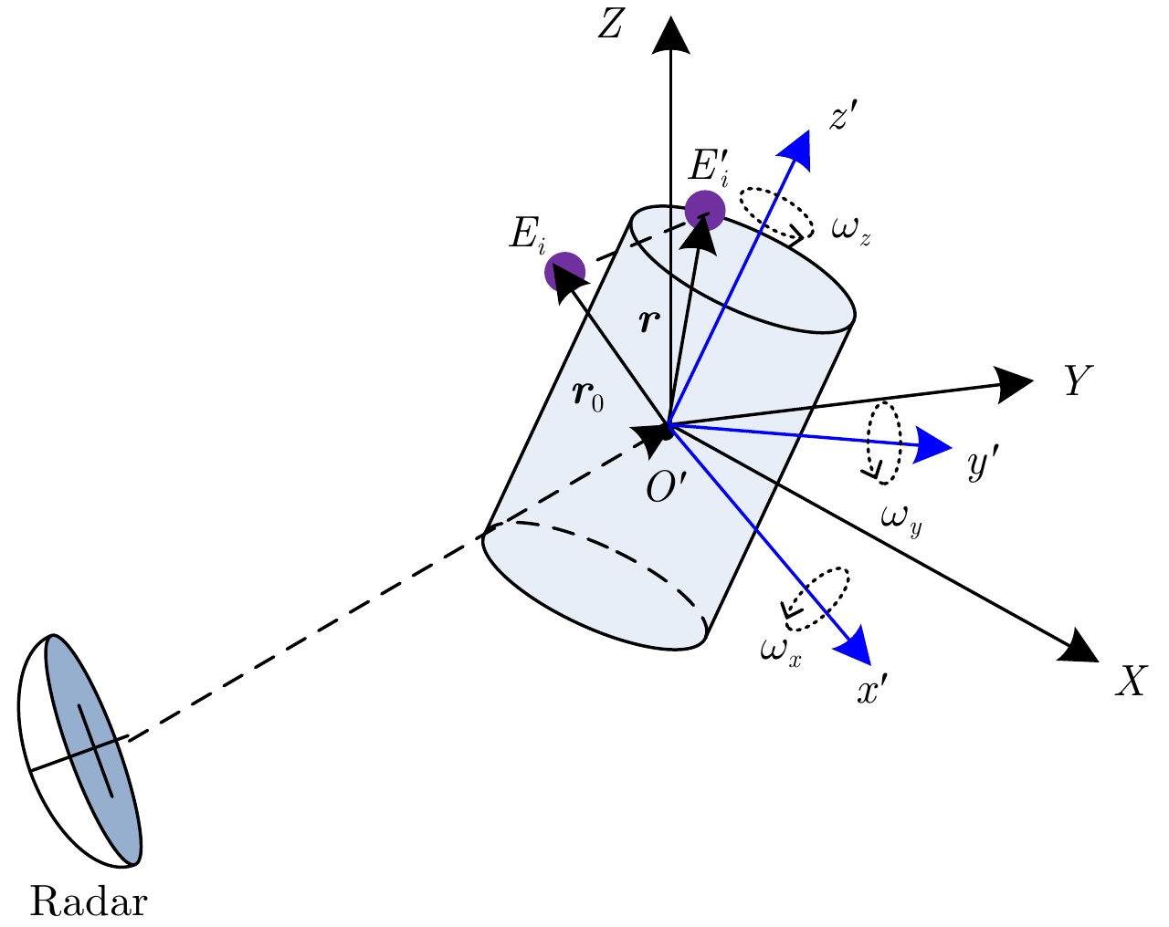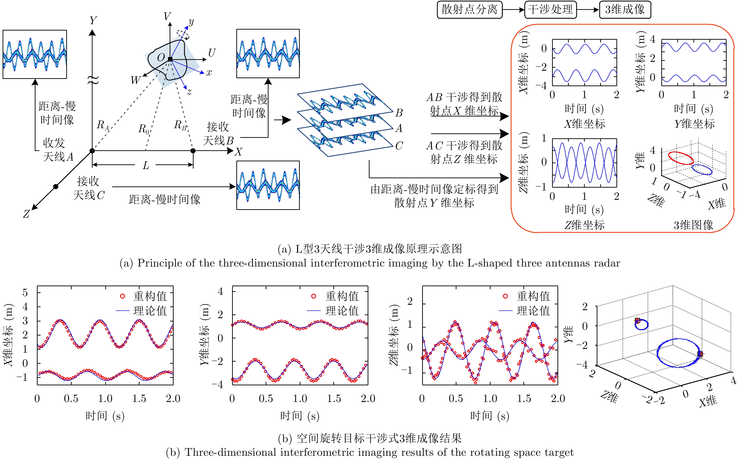 微动是指目标或目标上某些部件沿雷达视线方向的小幅、非匀速运动。通过对微动目标进行逆合成孔径雷达(ISAR)高分辨3维成像,能够获得其结构和运动信息,从而为微动目标检测、跟踪、分类与识别提供重要依据,并在空间态势感知与防空反导中发挥着重要作用。由于微动目标运动形式复杂、回波非平稳性强,现有的参数化ISAR成像方法已经不再适用。针对该问题,该文提出基于散射中心航迹矩阵分解的微动目标高分辨3维成像方法。该方法首先生成距离-瞬时多普勒(RID)像序列,利用watershed图像分割方法提取RID像的散射中心支撑域,并基于最小欧氏距离准则实现航迹关联。然后,针对散射中心航迹关联时瞬时斜距估计精度受距离分辨率影响等问题,进一步提出基于现代谱估计的散射中心航迹矩阵精估计方法。最后,通过带约束的航迹矩阵分解实现微动目标的高分辨3维成像。仿真结果表明,该文所提的成像方法能够有效实现章动等复杂微动目标的高分辨3维成像。 微动是指目标或目标上某些部件沿雷达视线方向的小幅、非匀速运动。通过对微动目标进行逆合成孔径雷达(ISAR)高分辨3维成像,能够获得其结构和运动信息,从而为微动目标检测、跟踪、分类与识别提供重要依据,并在空间态势感知与防空反导中发挥着重要作用。由于微动目标运动形式复杂、回波非平稳性强,现有的参数化ISAR成像方法已经不再适用。针对该问题,该文提出基于散射中心航迹矩阵分解的微动目标高分辨3维成像方法。该方法首先生成距离-瞬时多普勒(RID)像序列,利用watershed图像分割方法提取RID像的散射中心支撑域,并基于最小欧氏距离准则实现航迹关联。然后,针对散射中心航迹关联时瞬时斜距估计精度受距离分辨率影响等问题,进一步提出基于现代谱估计的散射中心航迹矩阵精估计方法。最后,通过带约束的航迹矩阵分解实现微动目标的高分辨3维成像。仿真结果表明,该文所提的成像方法能够有效实现章动等复杂微动目标的高分辨3维成像。