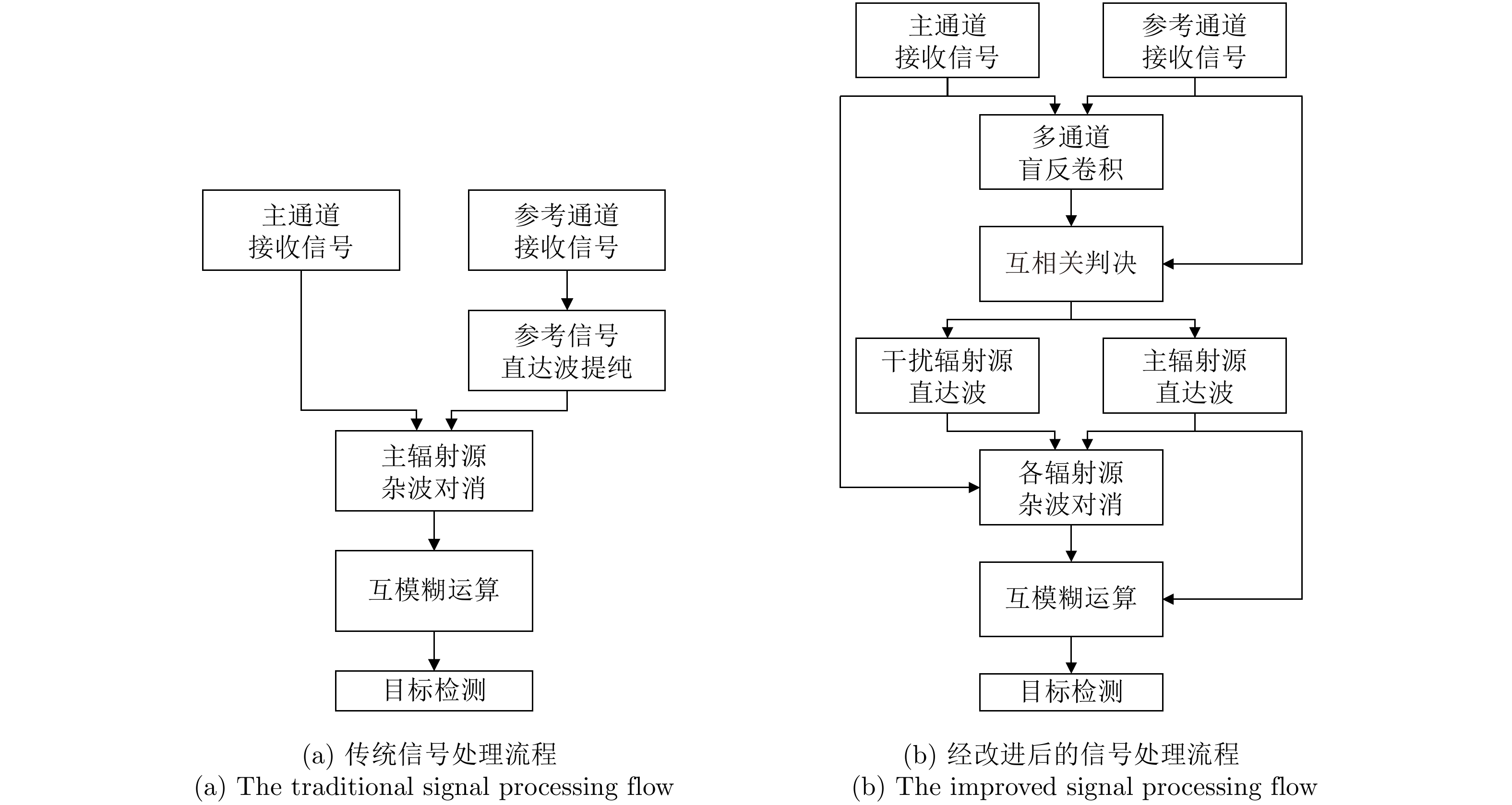 基于民用通信信号的无源雷达由于其辐射源分布密集,主通道与参考通道容易同时受同频辐射源干扰,严重影响检测效果。针对上述问题,该文提出了一种加入同频干扰抑制的信号处理流程。改进流程首先对所有通道接收信号联合处理,使用多通道盲反卷积算法估计各个辐射源直达波,再利用各通道主辐射源信号能量占比差异识别主辐射源直达波作为参考信号,然后对主通道中各辐射源杂波信号进行对消,最后用主辐射源直达波与对消剩余信号进行互模糊运算,完成目标检测。改进流程可以在不改变现有系统硬件条件的情况下有效抑制同频干扰,提升对消比,降低互模糊函数底噪,减少漏警。仿真分析与实测数据验证说明了该方法的正确性和有效性。 基于民用通信信号的无源雷达由于其辐射源分布密集,主通道与参考通道容易同时受同频辐射源干扰,严重影响检测效果。针对上述问题,该文提出了一种加入同频干扰抑制的信号处理流程。改进流程首先对所有通道接收信号联合处理,使用多通道盲反卷积算法估计各个辐射源直达波,再利用各通道主辐射源信号能量占比差异识别主辐射源直达波作为参考信号,然后对主通道中各辐射源杂波信号进行对消,最后用主辐射源直达波与对消剩余信号进行互模糊运算,完成目标检测。改进流程可以在不改变现有系统硬件条件的情况下有效抑制同频干扰,提升对消比,降低互模糊函数底噪,减少漏警。仿真分析与实测数据验证说明了该方法的正确性和有效性。