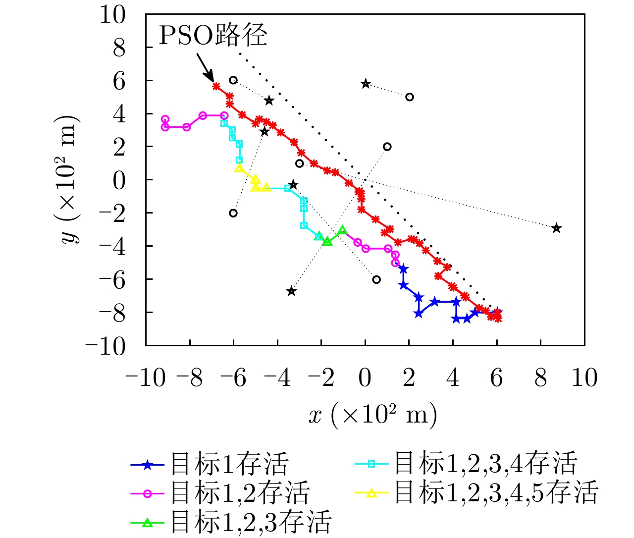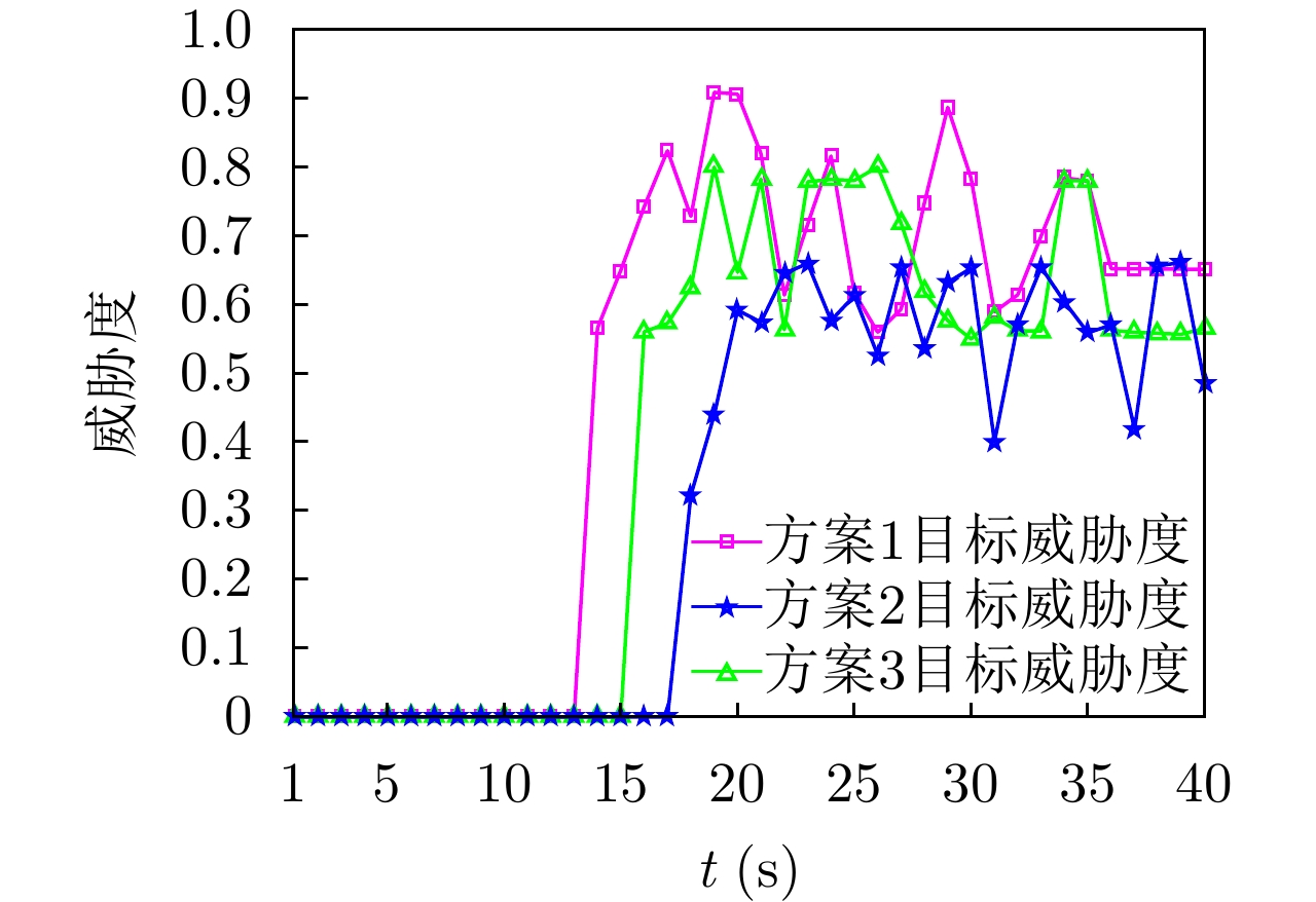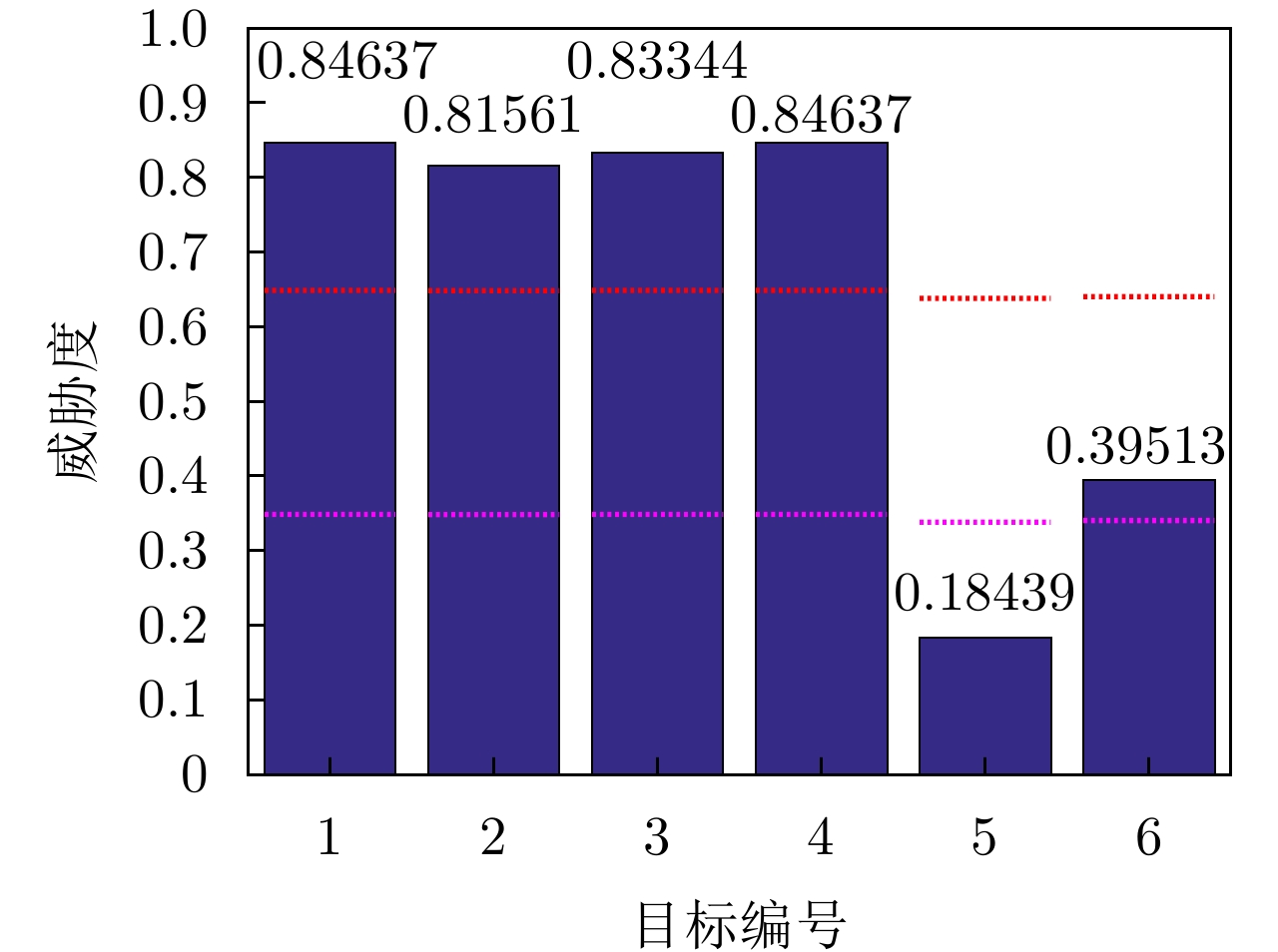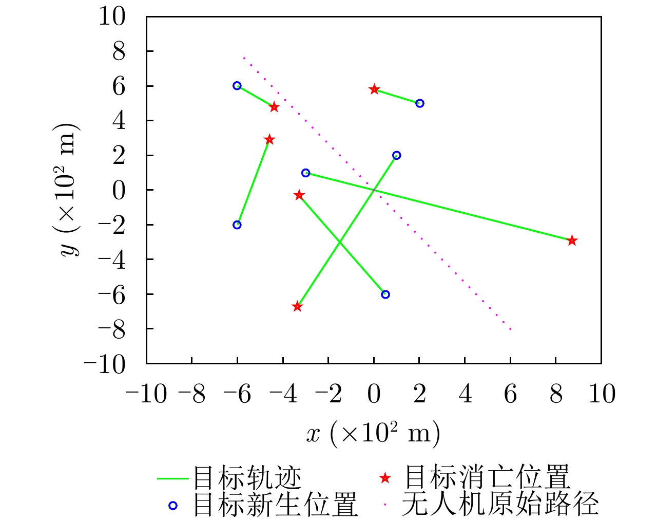 为了降低无人机执行侦察任务时被摧毁的概率,该文提出一种有效减少威胁的路径规划算法。首先利用高分辨率机载雷达对多扩展目标进行稳健的跟踪估计,然后根据三向决策规则对各目标按威胁进行分类,并利用模糊理想解相似性排序技术(TOPSIS)的方法计算目标威胁度,综合多任务决策联合优化(联合评估目标威胁度和目标跟踪质量)作为评价准则对无人机进行路径规划。仿真实验表明,模糊威胁度评估方法在多扩展目标跟踪环境下是有效的,所提无人机路径规划算法是合理的,在不损失目标跟踪精度的条件下有效降低了目标威胁度。 为了降低无人机执行侦察任务时被摧毁的概率,该文提出一种有效减少威胁的路径规划算法。首先利用高分辨率机载雷达对多扩展目标进行稳健的跟踪估计,然后根据三向决策规则对各目标按威胁进行分类,并利用模糊理想解相似性排序技术(TOPSIS)的方法计算目标威胁度,综合多任务决策联合优化(联合评估目标威胁度和目标跟踪质量)作为评价准则对无人机进行路径规划。仿真实验表明,模糊威胁度评估方法在多扩展目标跟踪环境下是有效的,所提无人机路径规划算法是合理的,在不损失目标跟踪精度的条件下有效降低了目标威胁度。