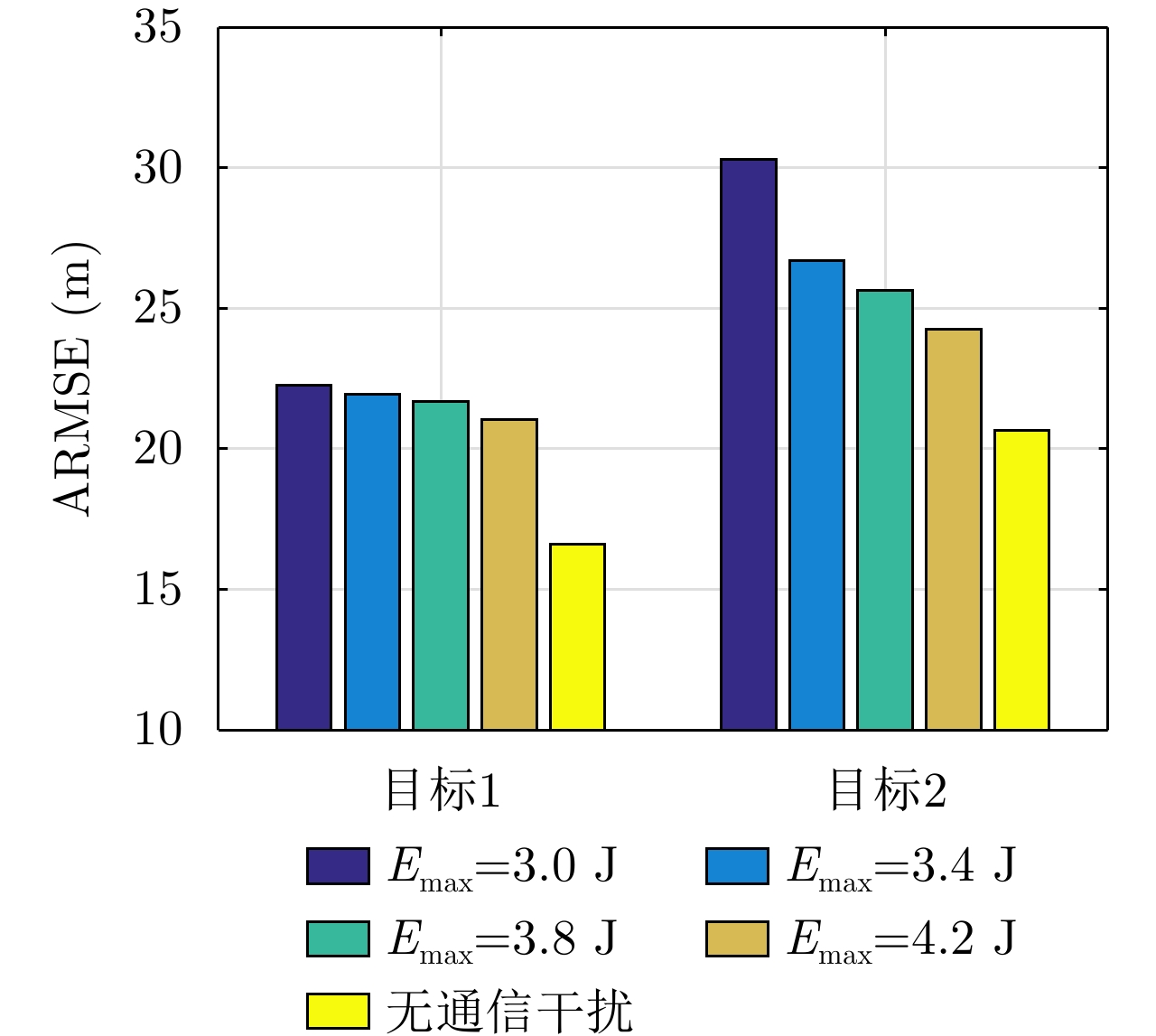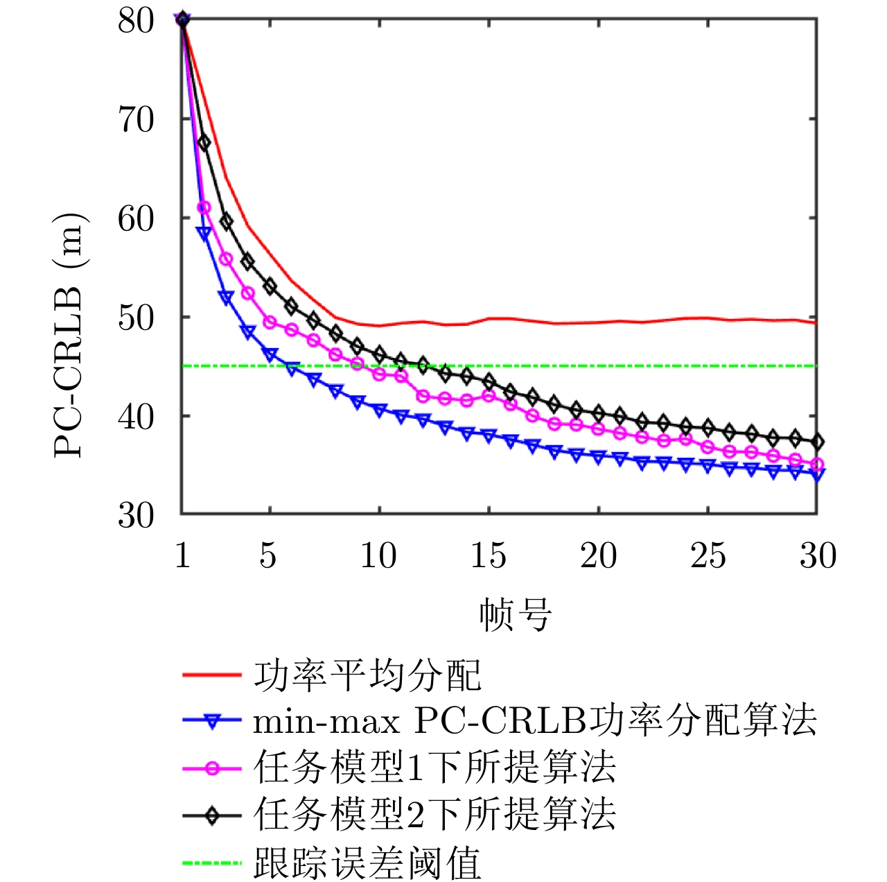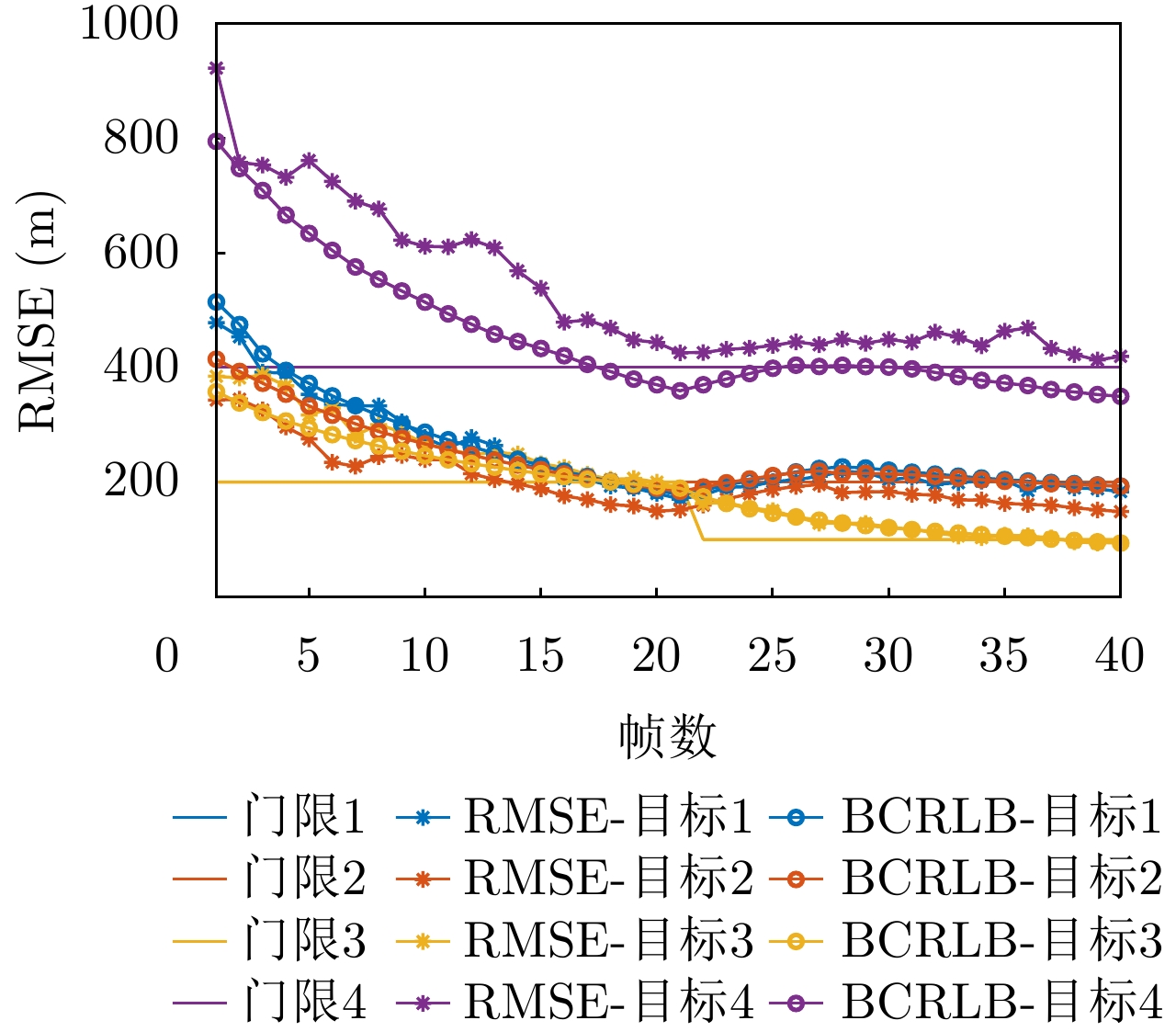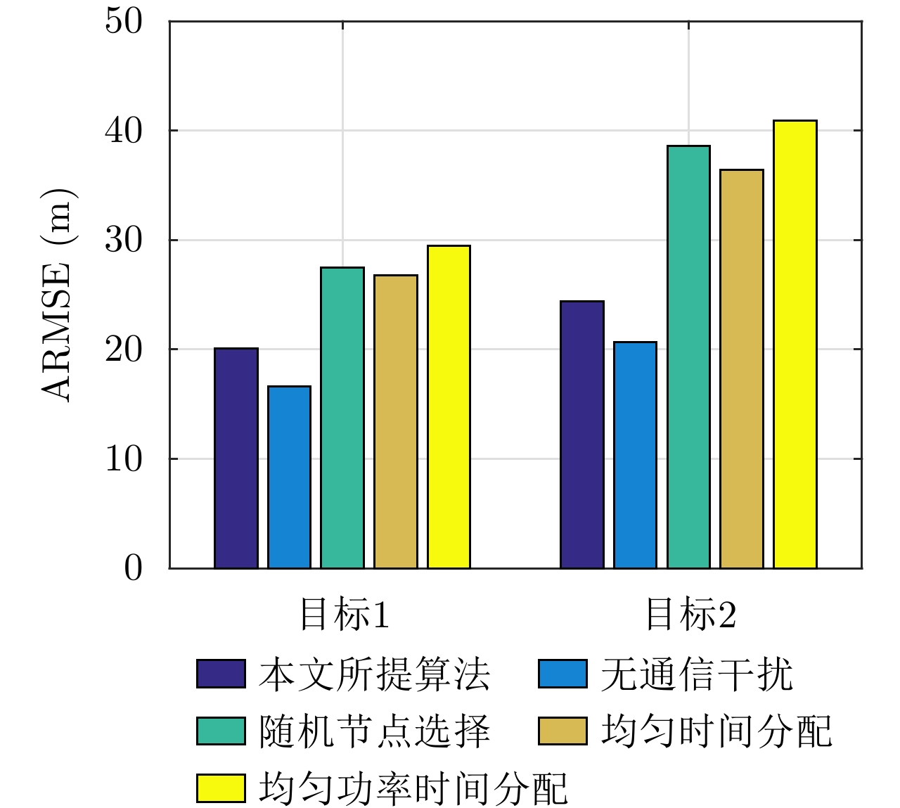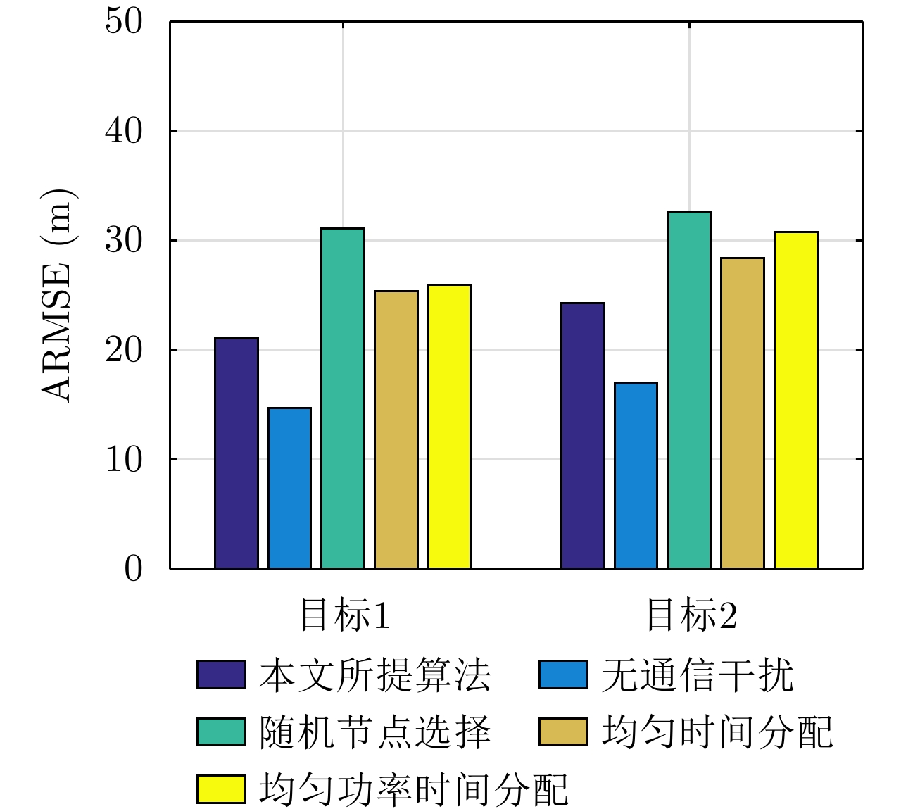 该文针对频谱共存环境下多目标跟踪资源分配问题,提出了组网雷达功率时间联合优化算法。首先,推导了包含雷达节点选择、发射功率和驻留时间等射频辐射参数的预测贝叶斯克拉默-拉奥下界(BCRLB),以此作为多目标跟踪精度的衡量指标;在此基础上,以最小化多目标跟踪BCRLB为优化目标,以满足给定的组网雷达射频资源和预先设定的通信基站最大可容忍干扰能量阈值为约束条件,建立了频谱共存下面向多目标跟踪的组网雷达功率时间联合优化分配模型,对雷达节点选择、发射功率和驻留时间进行自适应联合优化配置;然后,针对上述优化问题,采用两步分解法将其分解为多个子凸问题,并结合半正定规划(SDP)算法和循环最小化算法进行求解。仿真结果表明,与现有算法相比,所提算法能够在保证通信基站正常工作的条件下,有效提高组网雷达的多目标跟踪精度。 该文针对频谱共存环境下多目标跟踪资源分配问题,提出了组网雷达功率时间联合优化算法。首先,推导了包含雷达节点选择、发射功率和驻留时间等射频辐射参数的预测贝叶斯克拉默-拉奥下界(BCRLB),以此作为多目标跟踪精度的衡量指标;在此基础上,以最小化多目标跟踪BCRLB为优化目标,以满足给定的组网雷达射频资源和预先设定的通信基站最大可容忍干扰能量阈值为约束条件,建立了频谱共存下面向多目标跟踪的组网雷达功率时间联合优化分配模型,对雷达节点选择、发射功率和驻留时间进行自适应联合优化配置;然后,针对上述优化问题,采用两步分解法将其分解为多个子凸问题,并结合半正定规划(SDP)算法和循环最小化算法进行求解。仿真结果表明,与现有算法相比,所提算法能够在保证通信基站正常工作的条件下,有效提高组网雷达的多目标跟踪精度。