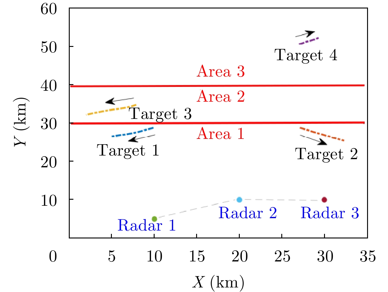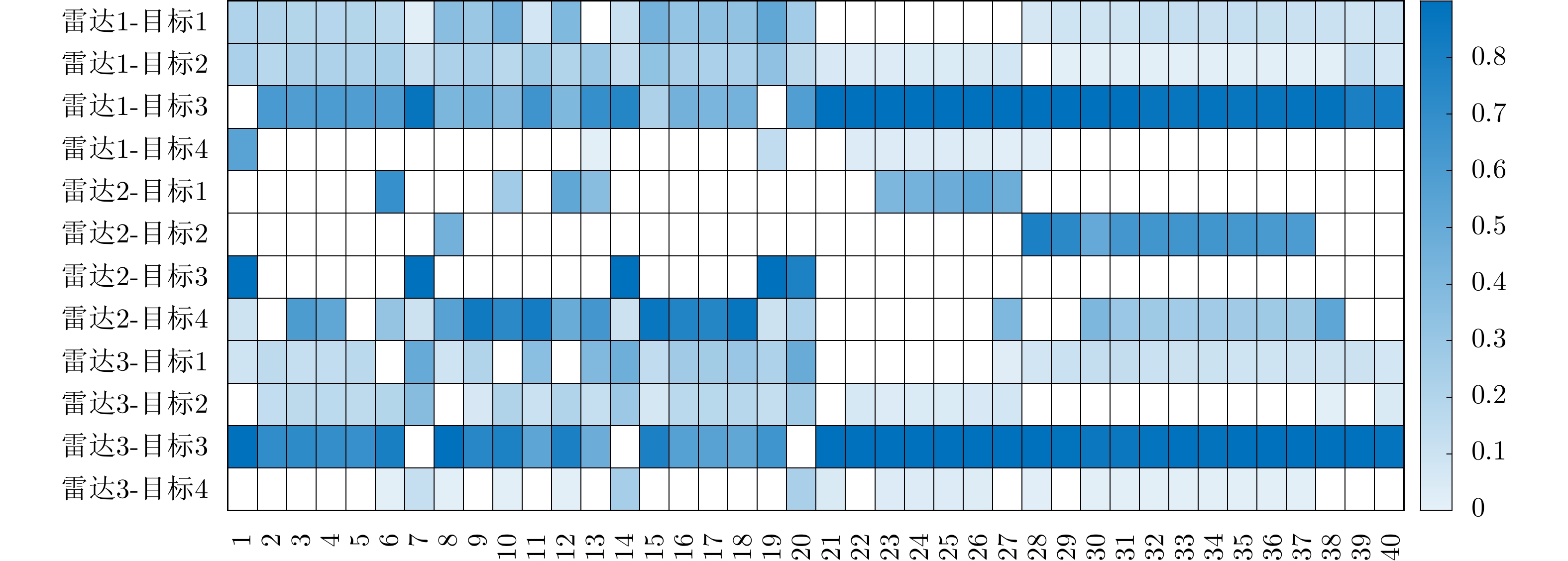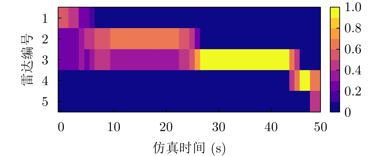 针对分布式组网相控阵雷达多目标跟踪(MTT)场景,该文提出一种目标动态威胁度驱动的波束分配与驻留时间联合优化算法。首先,在采用分布式组网架构的基础上,推导包含波束和驻留时间分配的贝叶斯克拉美罗界(BCRLB)。其次,基于目标实时运动状态构建综合威胁度评估尺度,按照威胁度为不同目标设计基于跟踪精度参考门限和贡献度的效用函数,以此衡量资源在多目标间的优先分配关系。随后,将该效用函数结合组网相控阵雷达系统资源,建立了目标动态威胁度驱动的波束分配与驻留时间联合优化模型。最后,采用一种基于奖励的迭代下降搜索算法进行求解。仿真结果表明,相较于平均资源分配方法,所提算法具备对若干差异性目标的跟踪精度需求感知能力,能够在基于多目标威胁度评估的基础上,有针对性地分配跟踪资源,从而有效提高组网相控阵雷达面对不同威胁度目标时的综合跟踪精度。 针对分布式组网相控阵雷达多目标跟踪(MTT)场景,该文提出一种目标动态威胁度驱动的波束分配与驻留时间联合优化算法。首先,在采用分布式组网架构的基础上,推导包含波束和驻留时间分配的贝叶斯克拉美罗界(BCRLB)。其次,基于目标实时运动状态构建综合威胁度评估尺度,按照威胁度为不同目标设计基于跟踪精度参考门限和贡献度的效用函数,以此衡量资源在多目标间的优先分配关系。随后,将该效用函数结合组网相控阵雷达系统资源,建立了目标动态威胁度驱动的波束分配与驻留时间联合优化模型。最后,采用一种基于奖励的迭代下降搜索算法进行求解。仿真结果表明,相较于平均资源分配方法,所提算法具备对若干差异性目标的跟踪精度需求感知能力,能够在基于多目标威胁度评估的基础上,有针对性地分配跟踪资源,从而有效提高组网相控阵雷达面对不同威胁度目标时的综合跟踪精度。