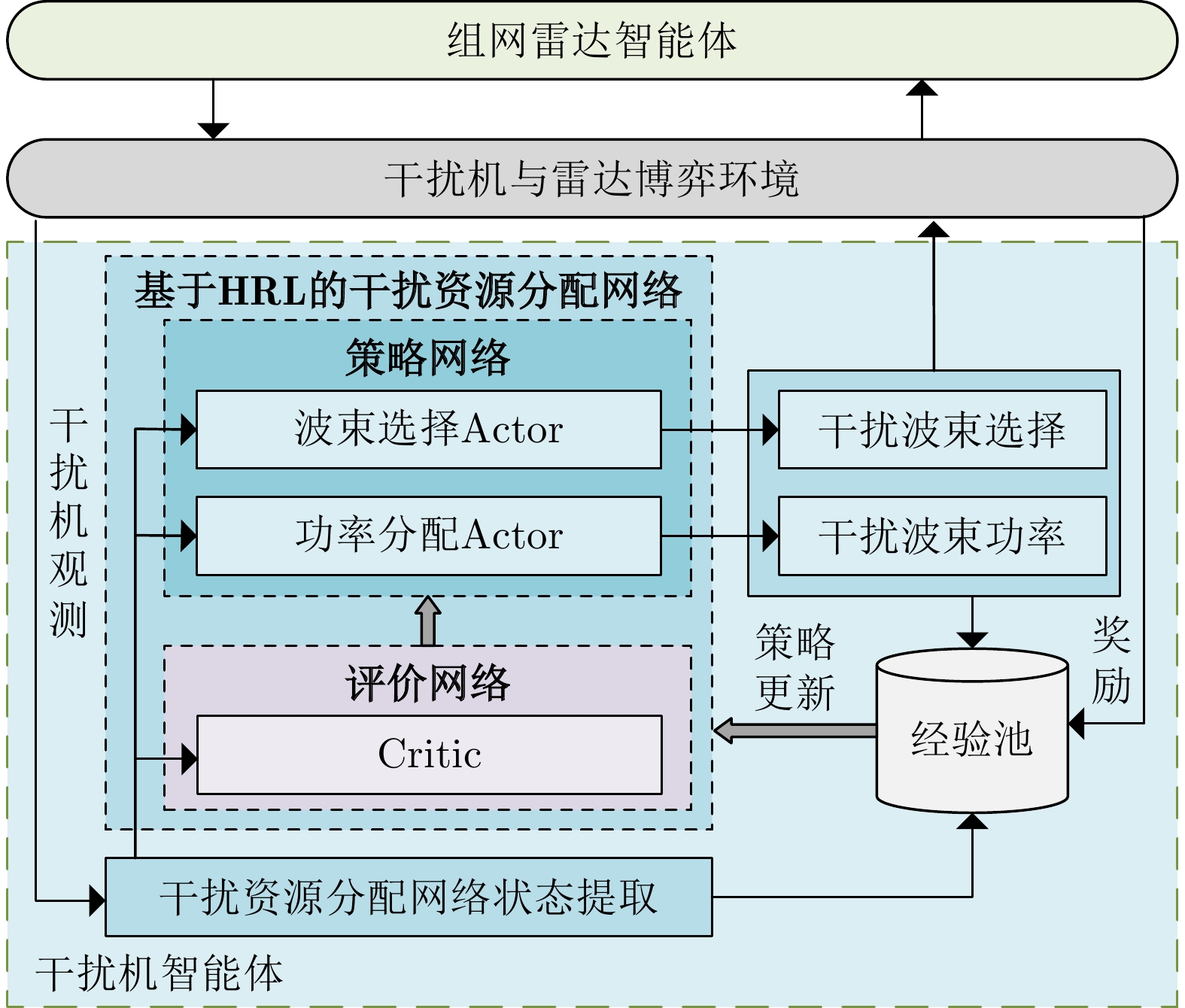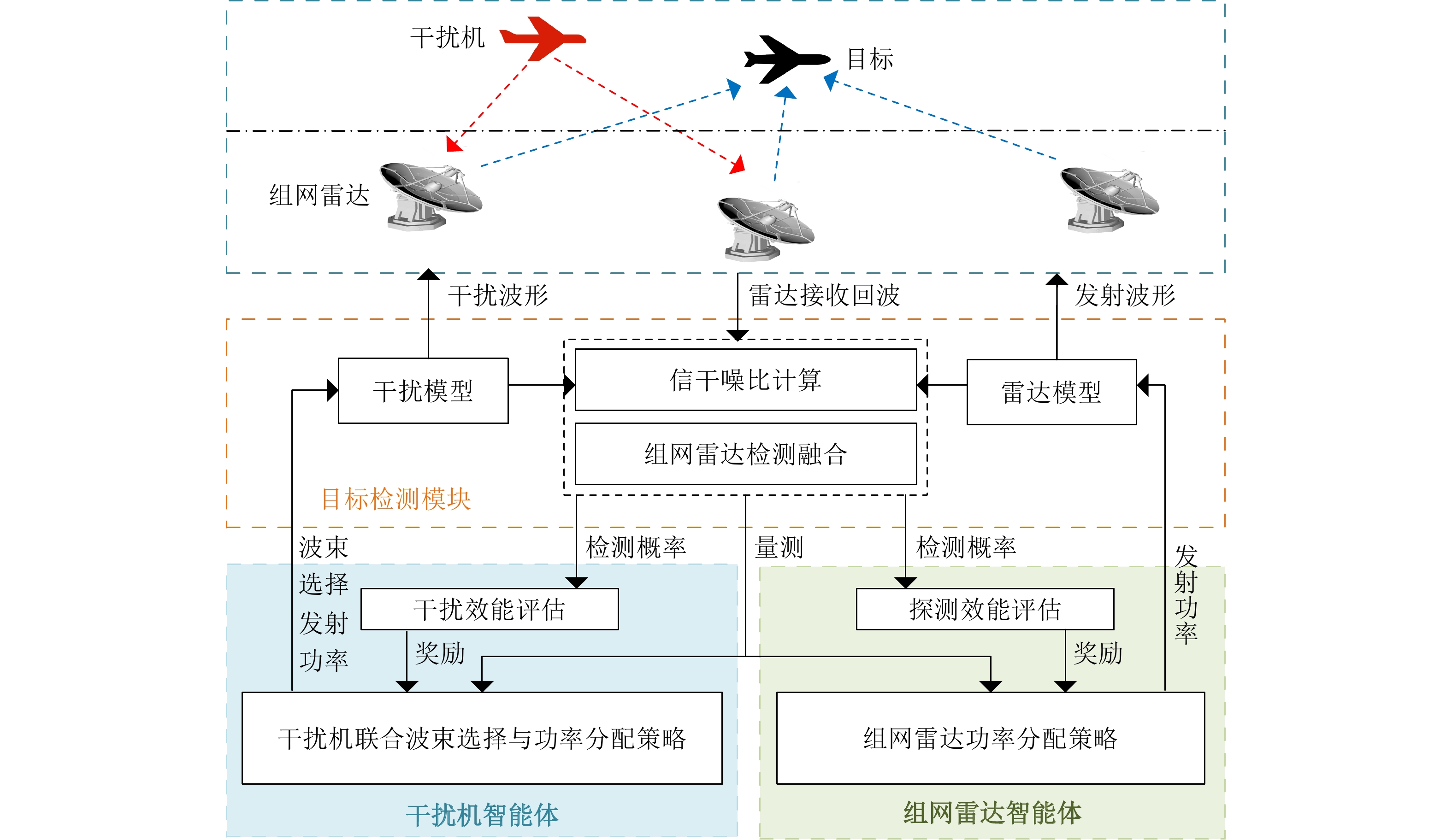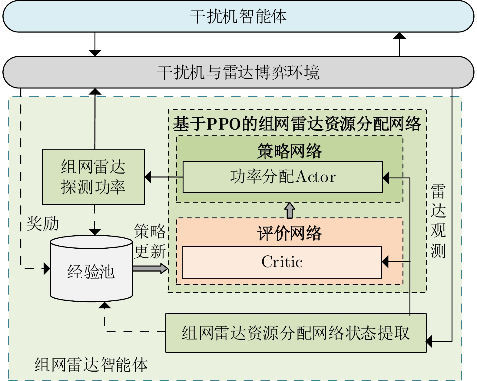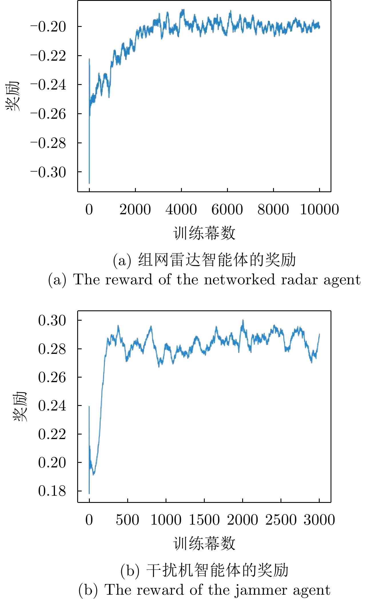 传统的组网雷达功率分配一般在干扰模型给定的情况下进行优化,而干扰机资源优化是在雷达功率分配方式给定情况下,这样的研究缺乏博弈和交互。考虑到日益严重的雷达和干扰机相互博弈的作战场景,该文提出了伴随压制干扰下组网雷达功率分配深度博弈问题,其中智能化的目标压制干扰采用深度强化学习(DRL)训练。首先在该问题中干扰机和组网雷达被映射为两个智能体,根据干扰模型和雷达检测模型建立了压制干扰下组网雷达的目标检测模型和最大化目标检测概率优化目标函数。在组网雷达智能体方面,由近端策略优化(PPO)策略网络生成雷达功率分配向量;在干扰机智能体方面,设计了混合策略网络来同时生成波束选择动作和功率分配动作;引入领域知识构建更加有效的奖励函数,目标检测模型、等功率分配策略和贪婪干扰功率分配策略3种领域知识分别用于生成组网雷达智能体和干扰机智能体的导向奖励,从而提高智能体的学习效率和性能。最后采用交替训练方法来学习两个智能体的策略网络参数。实验结果表明;当干扰机采用基于DRL的资源分配策略时,采用基于DRL的组网雷达功率分配在目标检测概率和运行速度两种指标上明显优于基于粒子群的组网雷达功率分配和基于人工鱼群的组网雷达功率分配。 传统的组网雷达功率分配一般在干扰模型给定的情况下进行优化,而干扰机资源优化是在雷达功率分配方式给定情况下,这样的研究缺乏博弈和交互。考虑到日益严重的雷达和干扰机相互博弈的作战场景,该文提出了伴随压制干扰下组网雷达功率分配深度博弈问题,其中智能化的目标压制干扰采用深度强化学习(DRL)训练。首先在该问题中干扰机和组网雷达被映射为两个智能体,根据干扰模型和雷达检测模型建立了压制干扰下组网雷达的目标检测模型和最大化目标检测概率优化目标函数。在组网雷达智能体方面,由近端策略优化(PPO)策略网络生成雷达功率分配向量;在干扰机智能体方面,设计了混合策略网络来同时生成波束选择动作和功率分配动作;引入领域知识构建更加有效的奖励函数,目标检测模型、等功率分配策略和贪婪干扰功率分配策略3种领域知识分别用于生成组网雷达智能体和干扰机智能体的导向奖励,从而提高智能体的学习效率和性能。最后采用交替训练方法来学习两个智能体的策略网络参数。实验结果表明;当干扰机采用基于DRL的资源分配策略时,采用基于DRL的组网雷达功率分配在目标检测概率和运行速度两种指标上明显优于基于粒子群的组网雷达功率分配和基于人工鱼群的组网雷达功率分配。