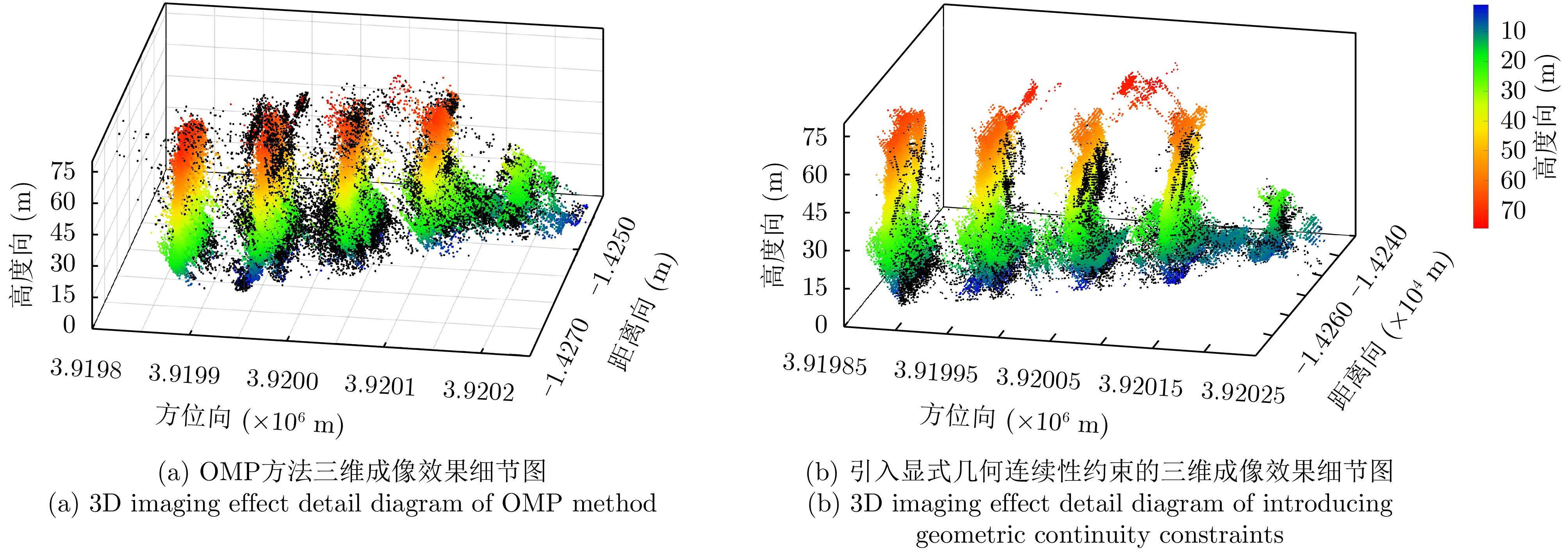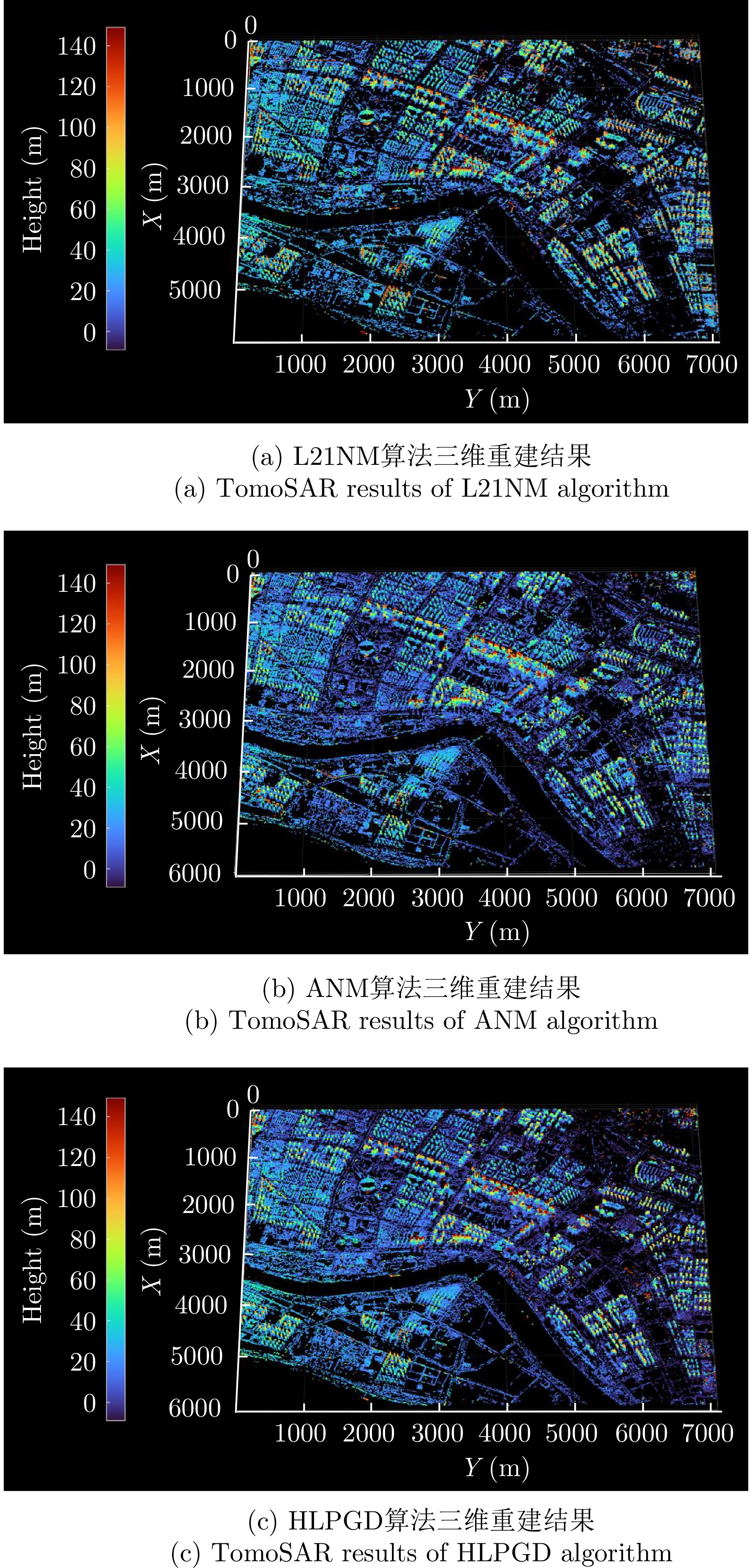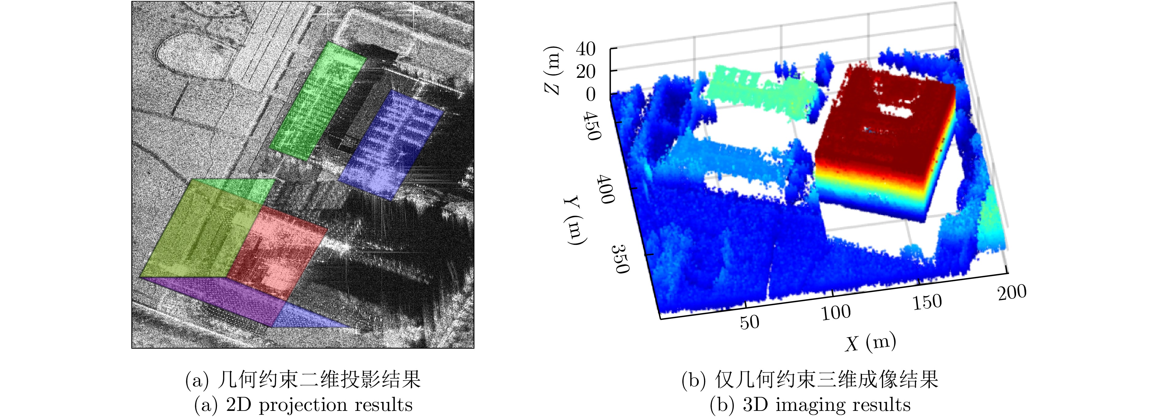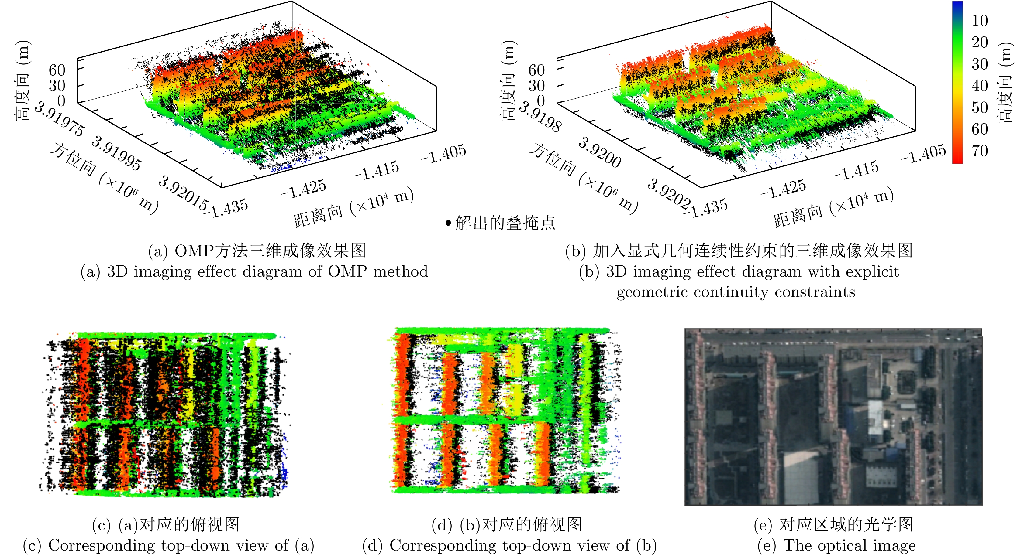 层析合成孔径雷达(TomoSAR)是城市建筑物三维重建的重要技术。现有方法虽通过引入几何约束提升了成像质量,并在多极化条件下发展为极化层析SAR (PolTomoSAR),但仍面临复杂建筑结构下几何信息依赖性强、极化模型不完善等问题。为此,该文提出一种几何与极化联合约束的TomoSAR三维成像方法,融合建筑几何结构与Pauli极化相似度信息,结合极化相干最优处理及概率密度约束,显著提升点云成像质量。实验基于机载Ku波段4通道阵列苏州实测数据,结果表明所提方法在成像精度与完整性方面均优于现有方法,验证了其有效性与优越性。