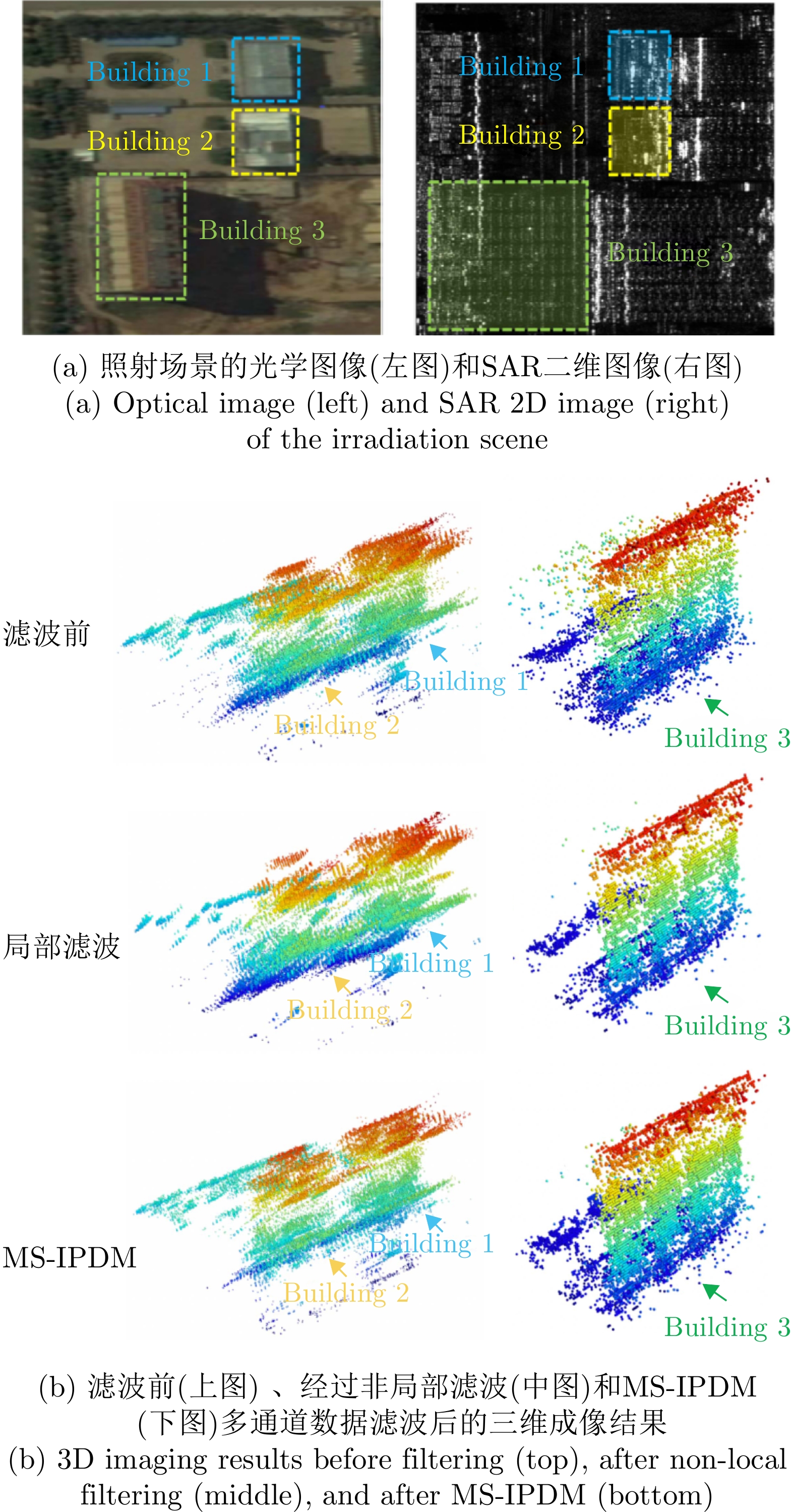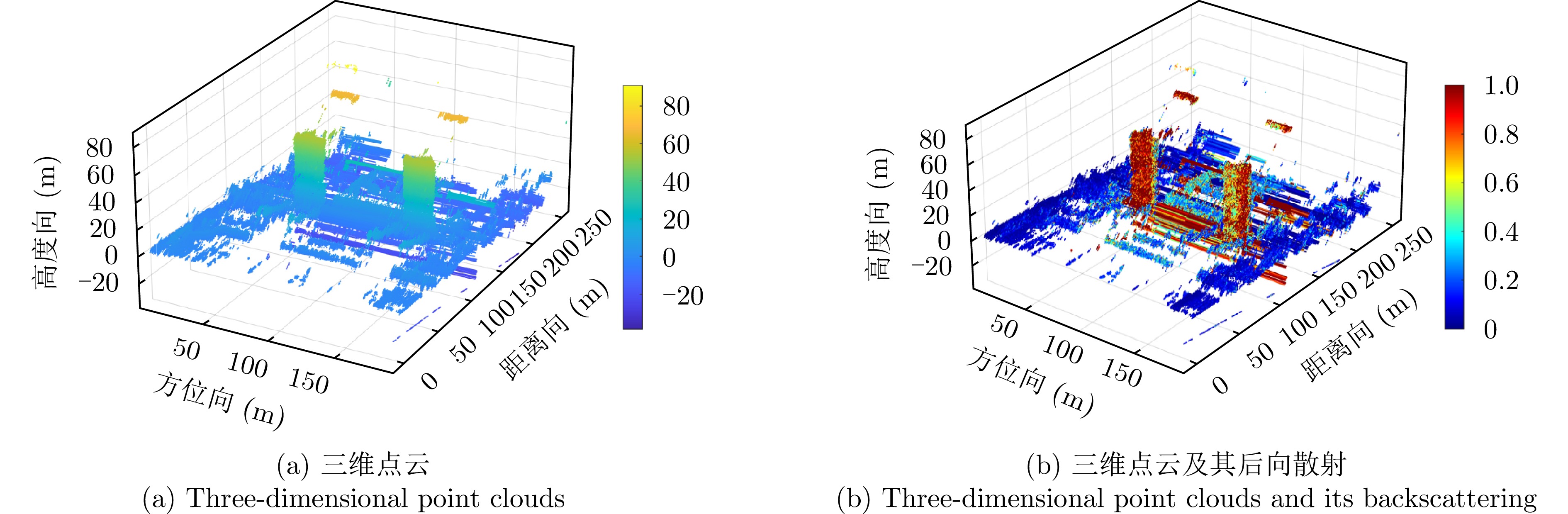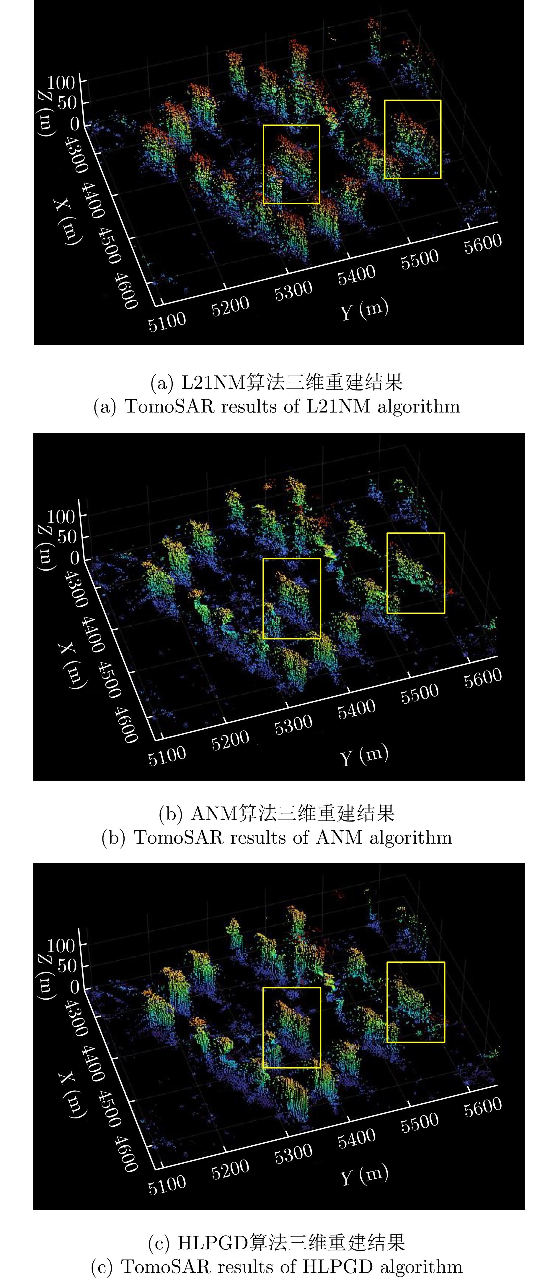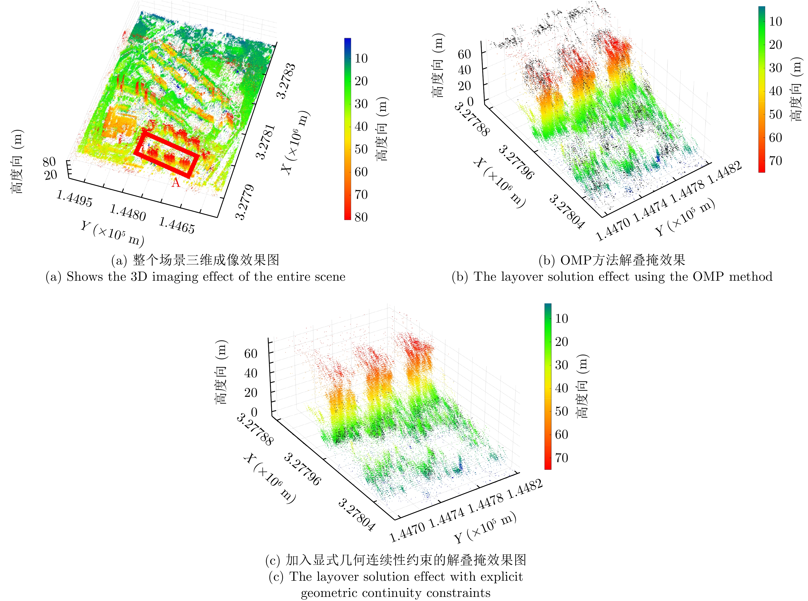 层析合成孔径雷达(TomoSAR)是城市建筑物三维重建的重要技术。现有方法虽通过引入几何约束提升了成像质量,并在多极化条件下发展为极化层析SAR (PolTomoSAR),但仍面临复杂建筑结构下几何信息依赖性强、极化模型不完善等问题。为此,该文提出一种几何与极化联合约束的TomoSAR三维成像方法,融合建筑几何结构与Pauli极化相似度信息,结合极化相干最优处理及概率密度约束,显著提升点云成像质量。实验基于机载Ku波段4通道阵列苏州实测数据,结果表明所提方法在成像精度与完整性方面均优于现有方法,验证了其有效性与优越性。