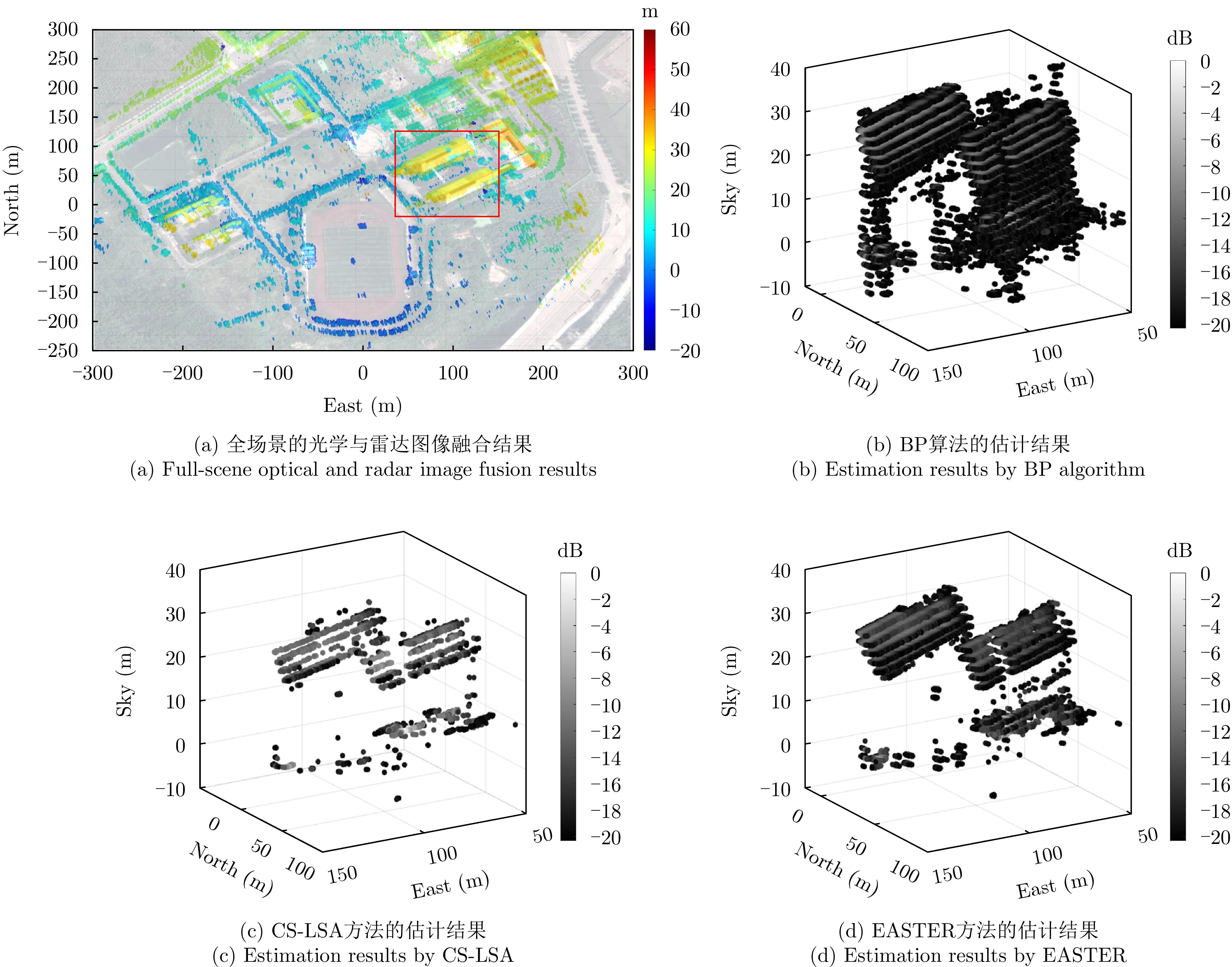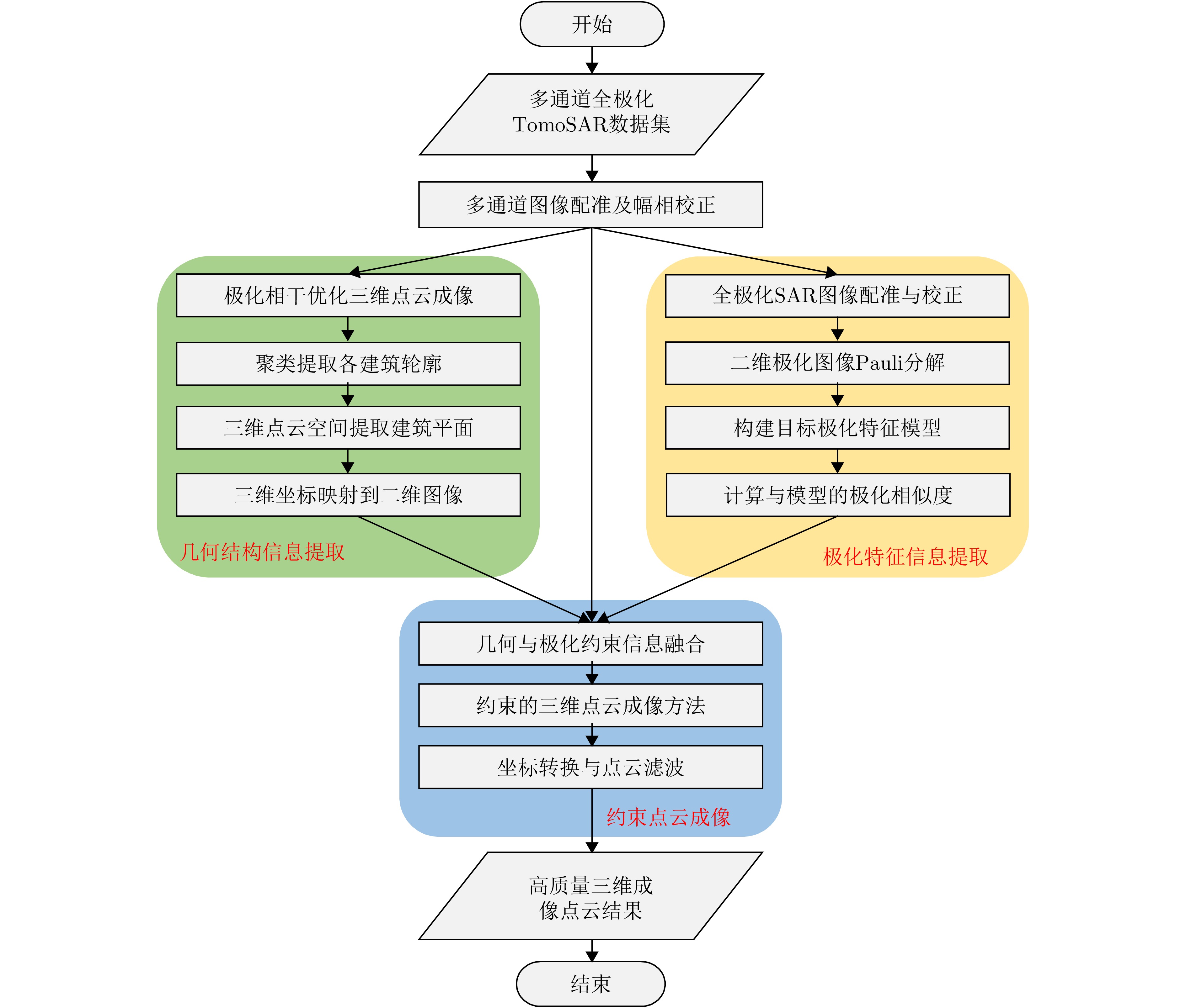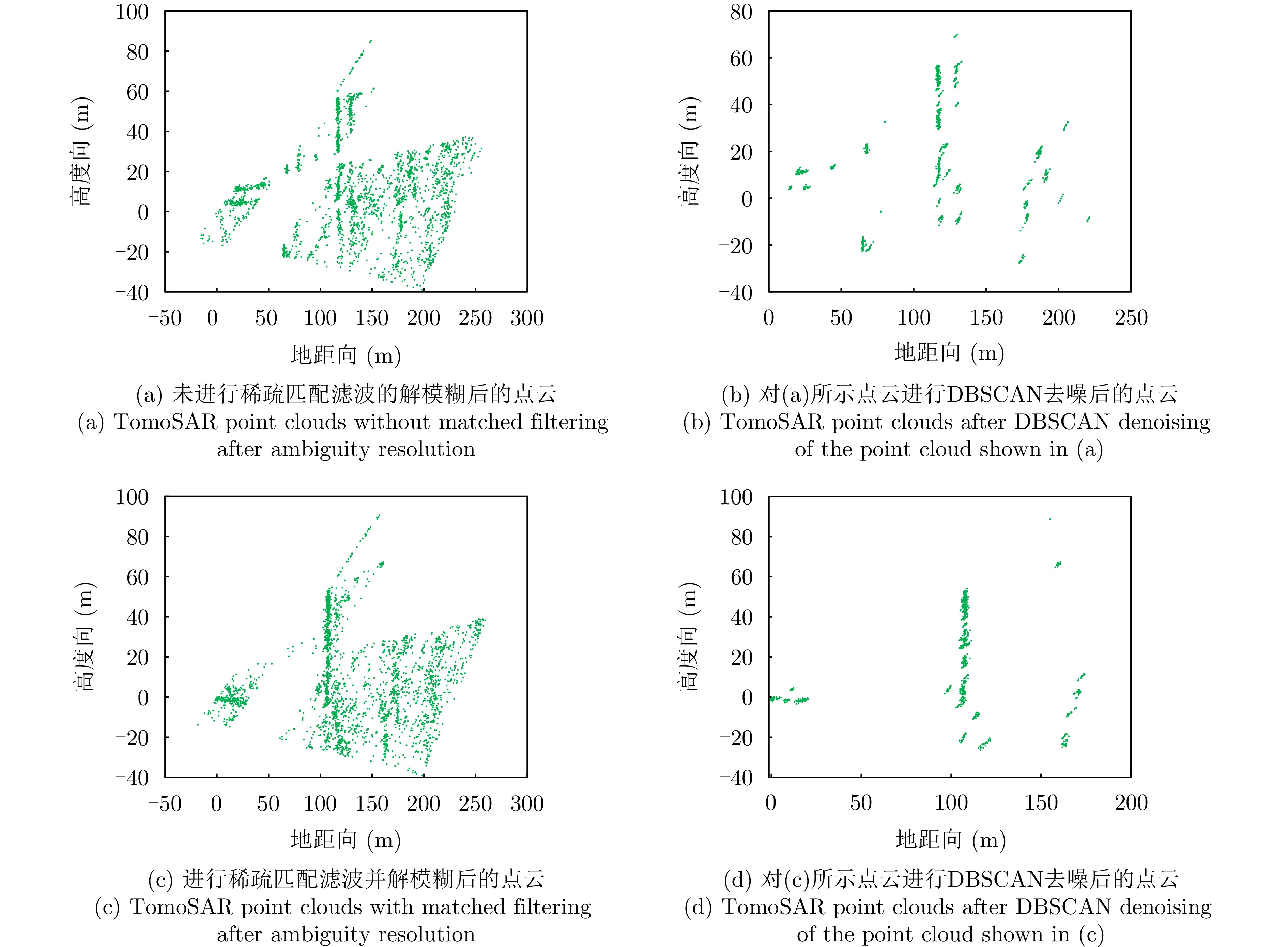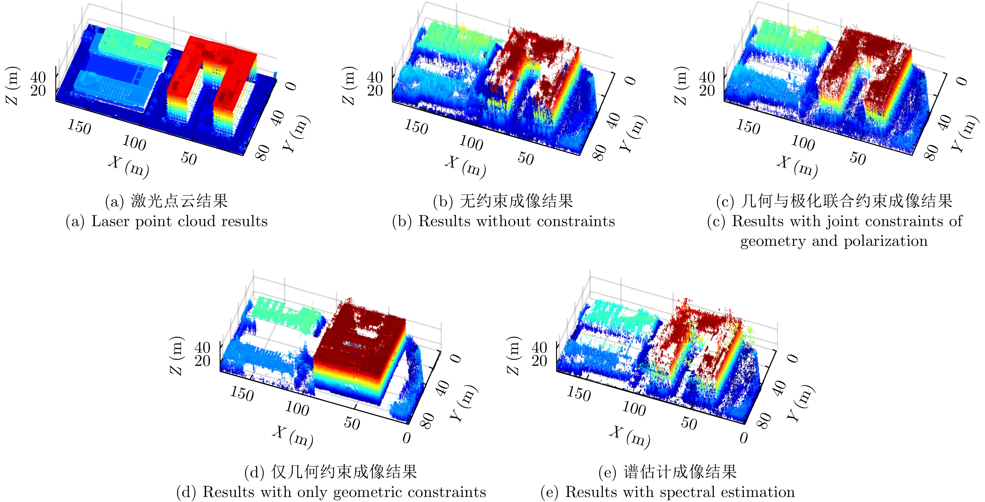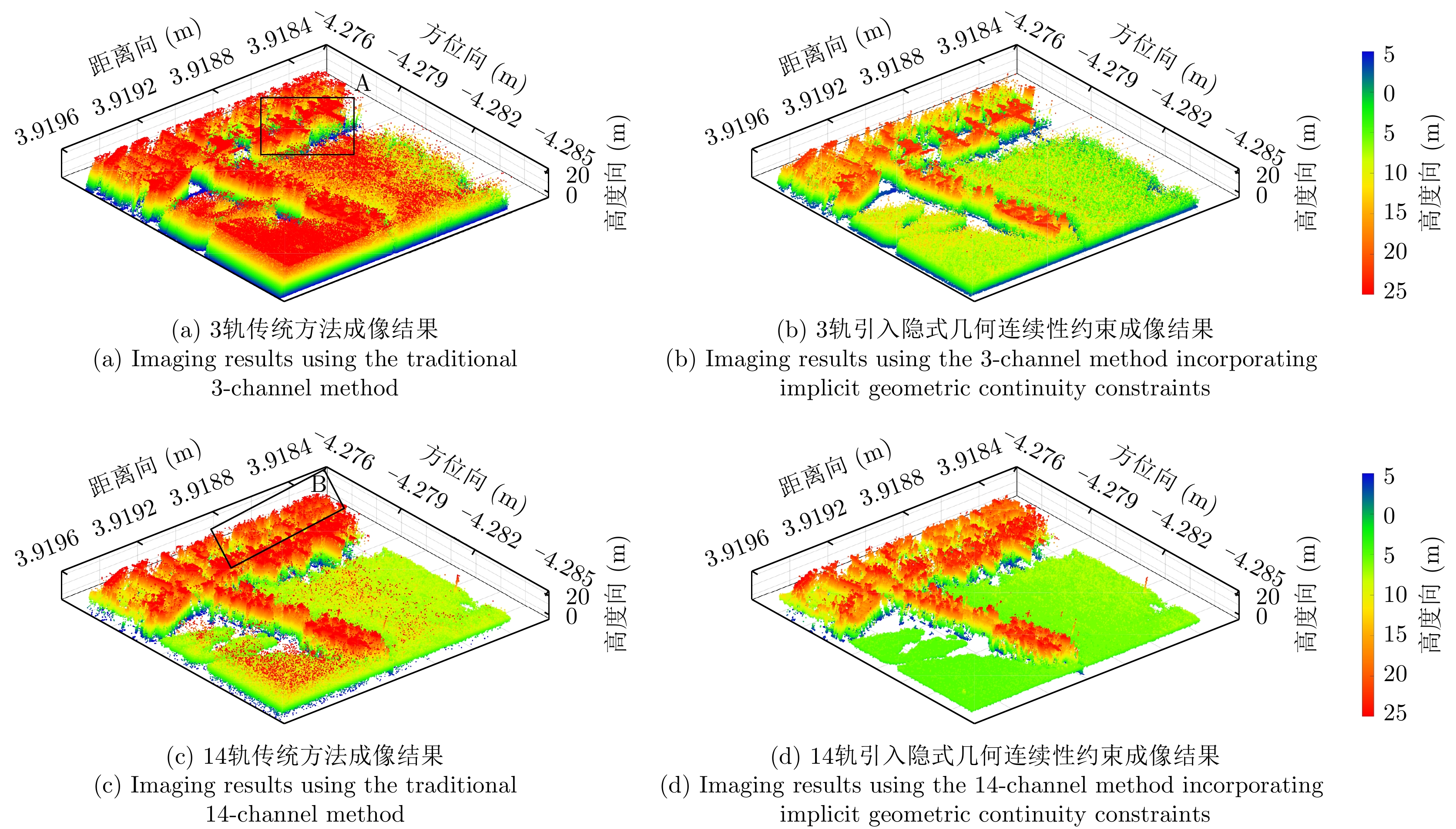 层析合成孔径雷达(TomoSAR)是城市建筑物三维重建的重要技术。现有方法虽通过引入几何约束提升了成像质量,并在多极化条件下发展为极化层析SAR (PolTomoSAR),但仍面临复杂建筑结构下几何信息依赖性强、极化模型不完善等问题。为此,该文提出一种几何与极化联合约束的TomoSAR三维成像方法,融合建筑几何结构与Pauli极化相似度信息,结合极化相干最优处理及概率密度约束,显著提升点云成像质量。实验基于机载Ku波段4通道阵列苏州实测数据,结果表明所提方法在成像精度与完整性方面均优于现有方法,验证了其有效性与优越性。