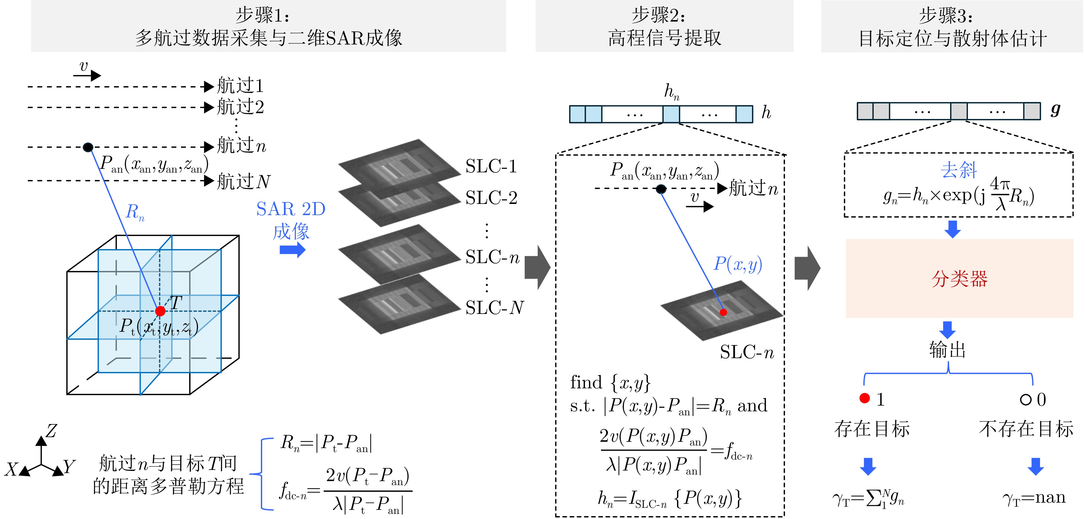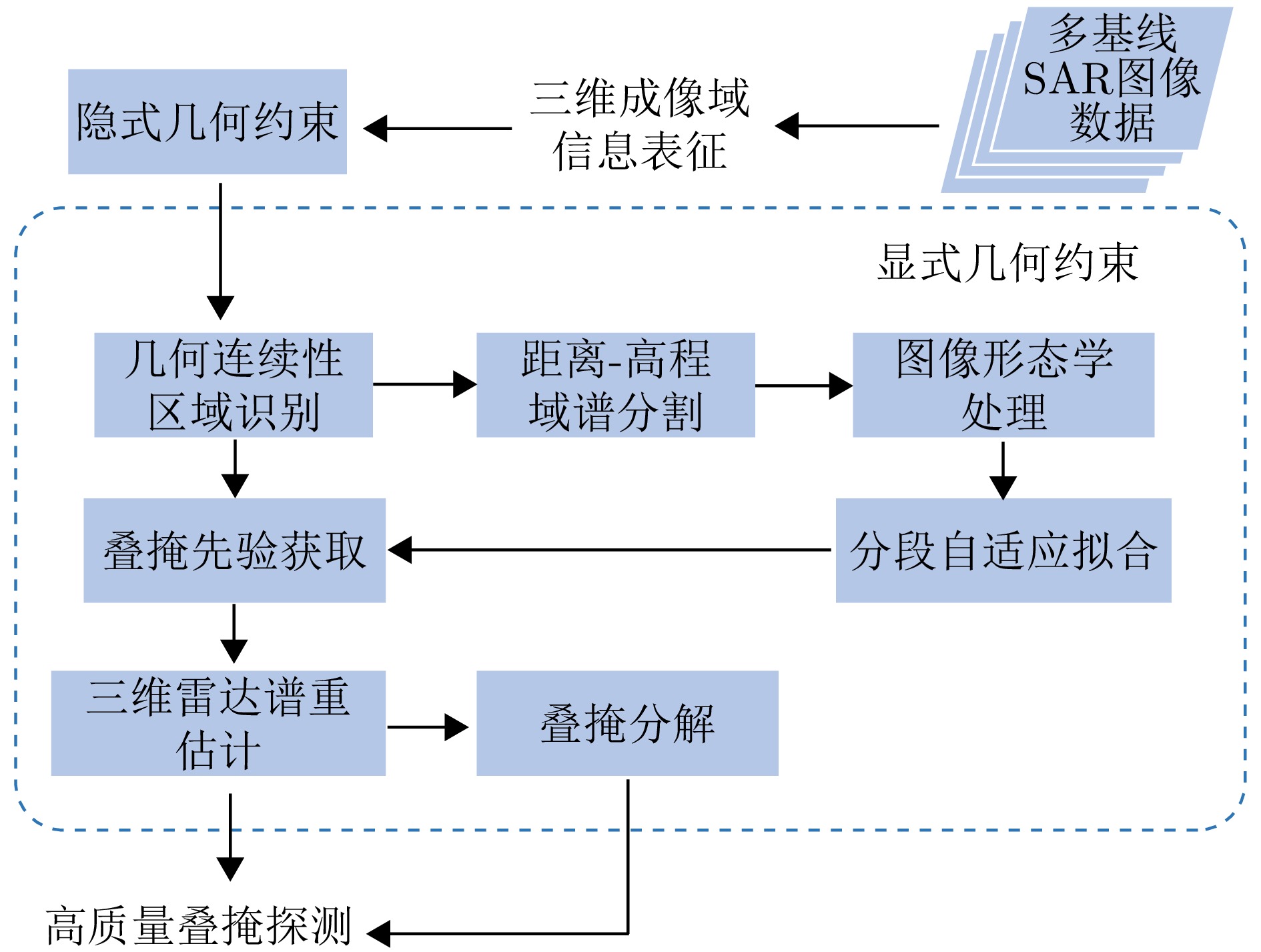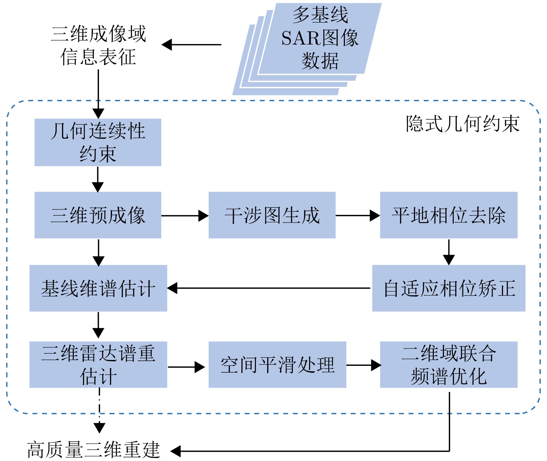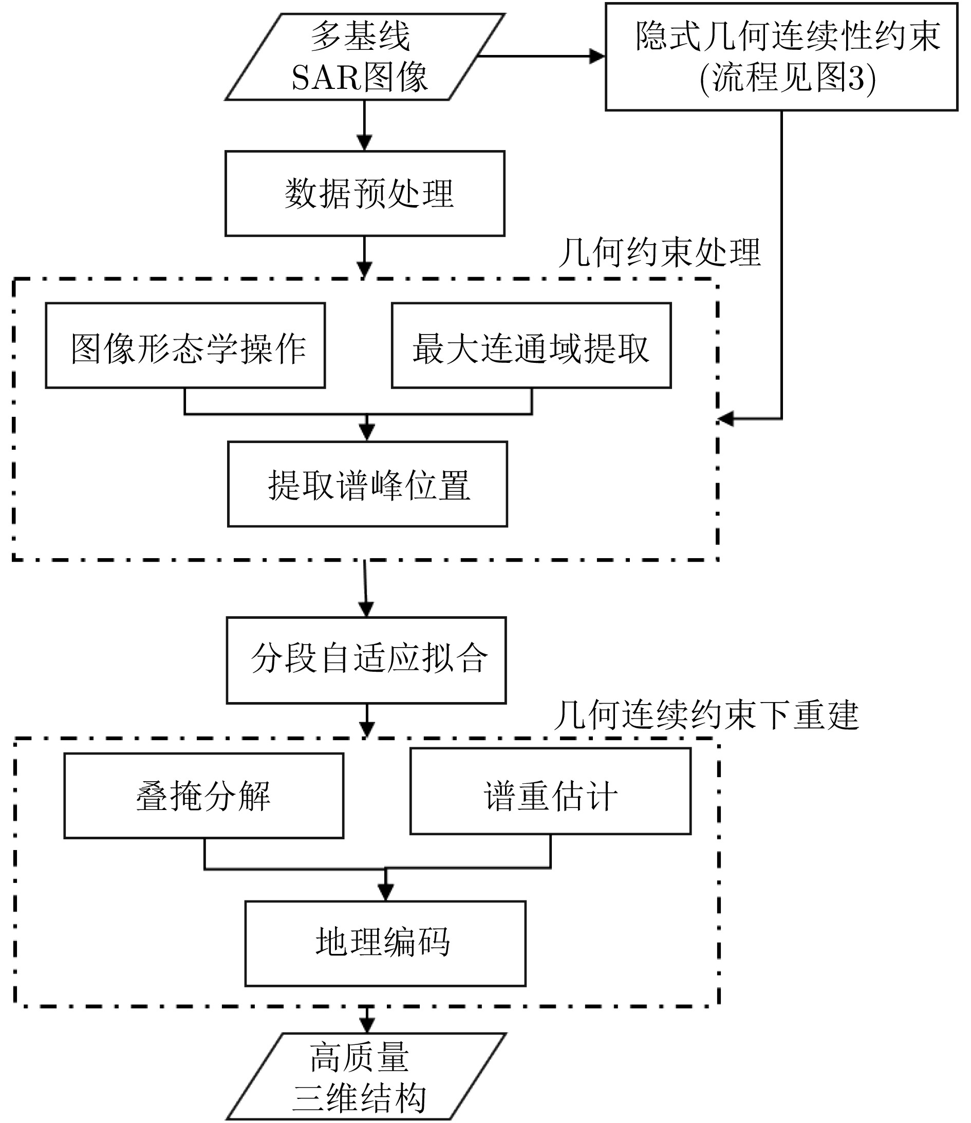 合成孔径雷达(SAR)是一种主动式微波传感器,具备全天时、全天候工作的能力,是重要的对地观测数据源。二维SAR图像回波混叠影响其在目标识别等方面的应用,利用多基线观测的SAR三维成像技术能够解决目标叠掩问题,但受限于系统复杂度,当前机载或星载单航过SAR系统仅能获得稀疏采样,无法满足算法对数据量的需求。由此发展的微波视觉三维成像新理论通过挖掘微波视觉语义信息来弥补采样的不足,其关键技术包括视觉信息获取以及信息融合处理。然而,SAR图像的几何连续性表征和应用方式缺乏相关性研究,该文分析了典型目标在SAR三维成像域内几何连续性的表征形式,并分别提出了隐式和显式几何连续性约束的少轨数三维成像方法。最后采用实测机载阵列InSAR数据进行算法验证,表明利用几何连续性约束能够有效提升稀疏采样下的三维成像性能。该文提出的几何连续性表征方法为微波视觉三维成像的具体实现提供了一种有效途径。