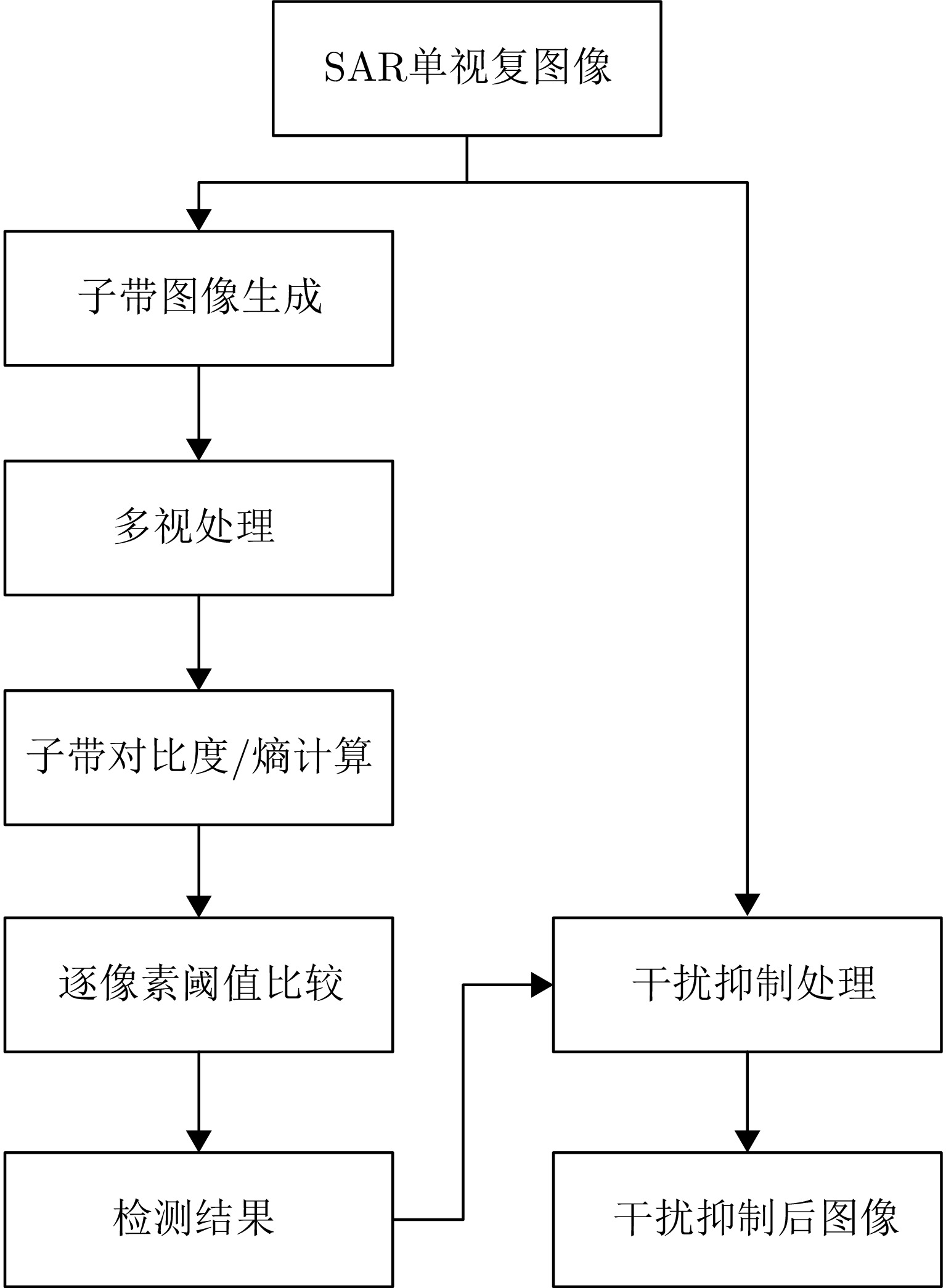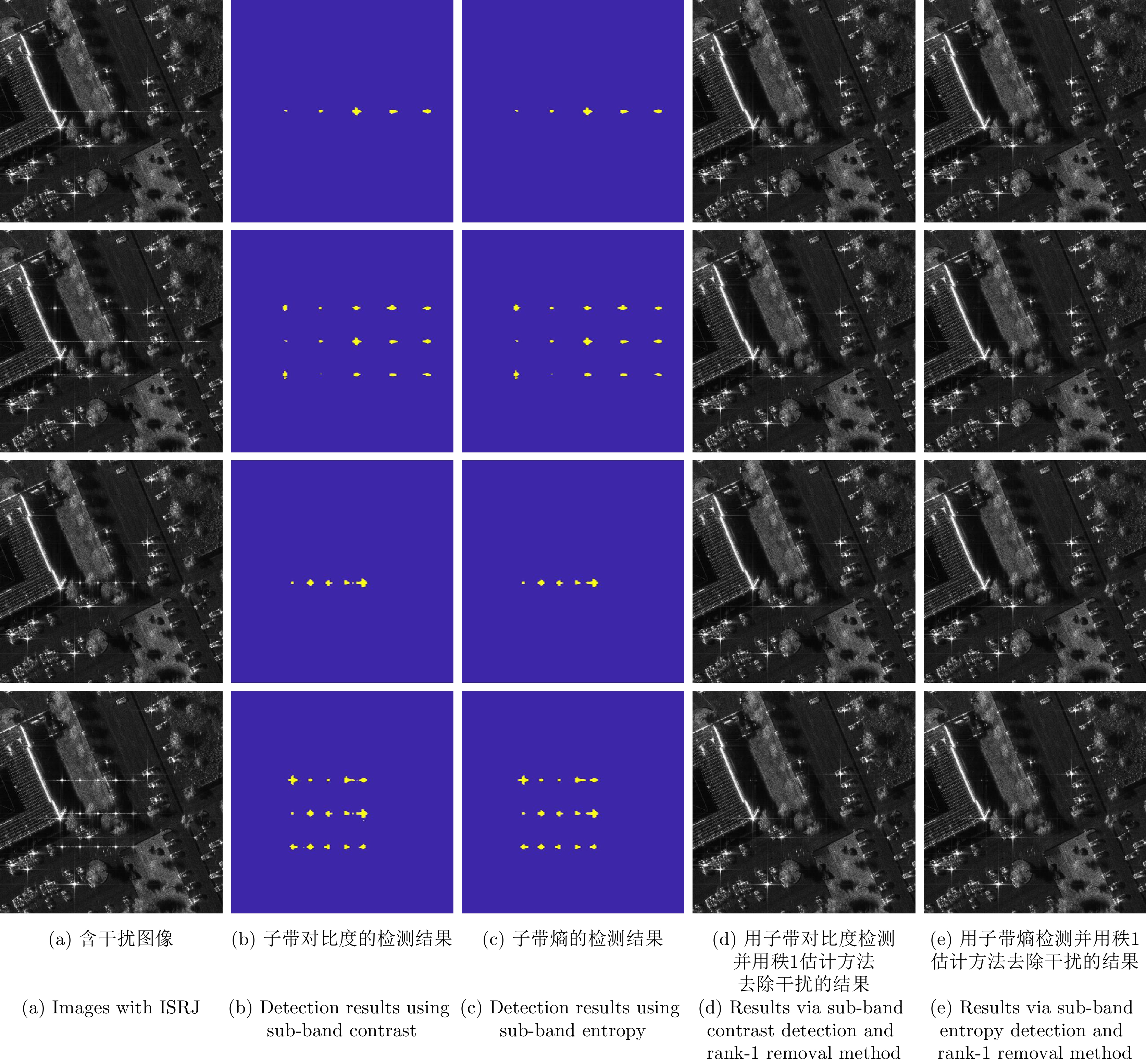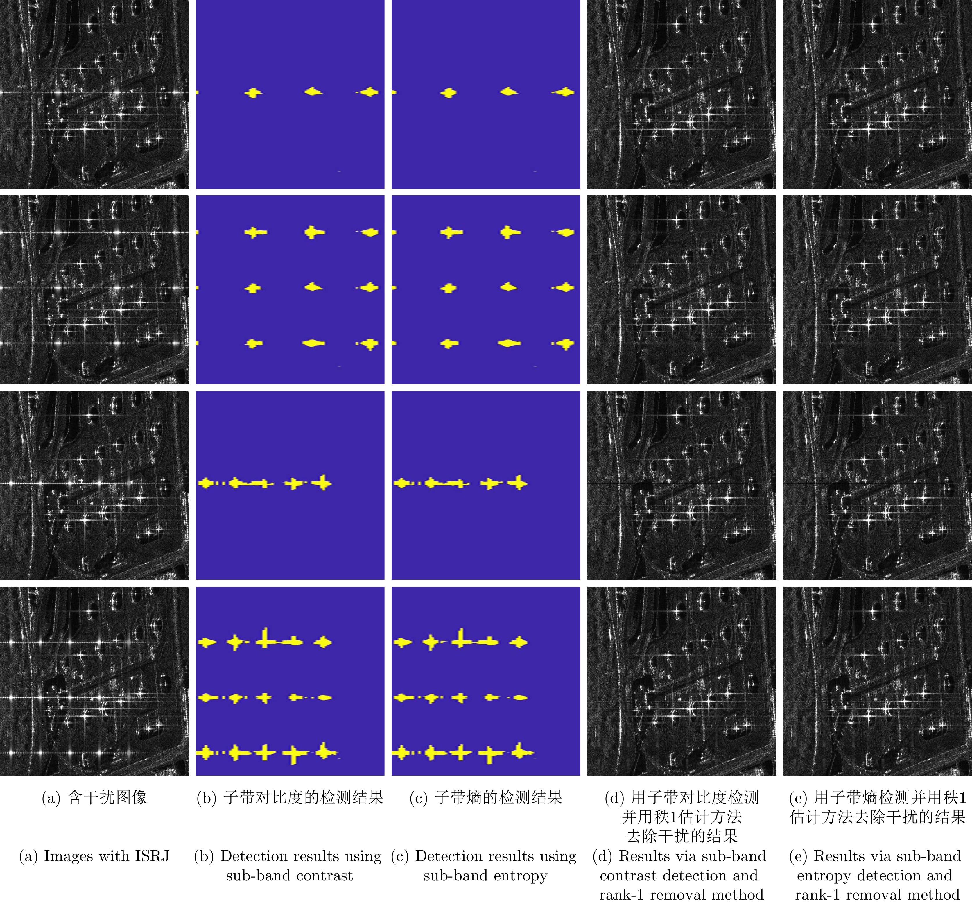 该文提出一种从单视复数合成孔径雷达(SAR)图像中检测干扰的方法,并将该方法用于自适应干扰抑制处理。所提方法不仅适用于间歇采样转发干扰,还适用于星载SAR中常见的线性调频脉冲等无意干扰。首先将一幅单视复数SAR图像在距离频域按照等带宽划分为多个子带图像,然后对子带图像的像素强度进行建模,并分析干扰像素和非干扰像素在子带域的起伏机制。干扰像素在不同子带中的能量分布不均匀,导致其强度在子带域具有显著的起伏,而非干扰像素的强度在子带域则较为稳定。基于上述发现,该文定义子带对比度和子带熵作为统计量以衡量像素强度在子带域的起伏特征,然后把两者与设定的阈值进行比较以得到干扰检测结果。经过统计分析,在无干扰情况下上述两个统计量近似服从Beta分布。基于这一发现,该文用Beta分布拟合这两者的分布,并在恒虚警准则下给出了检测阈值的确定方法。实验结果表明,所提方法不仅能有效检测间歇采样转发干扰,还能检测常见的无意干扰。该文还研究了干信比对检测性能的影响,并通过蒙特卡罗仿真验证了方法的可靠性和稳定性。此外,该文还提出了一种基于秩1模型的干扰抑制方法,能够对被检测到含有干扰的图像区域进行自适应干扰抑制,从而降低干扰对下游任务的不利影响。