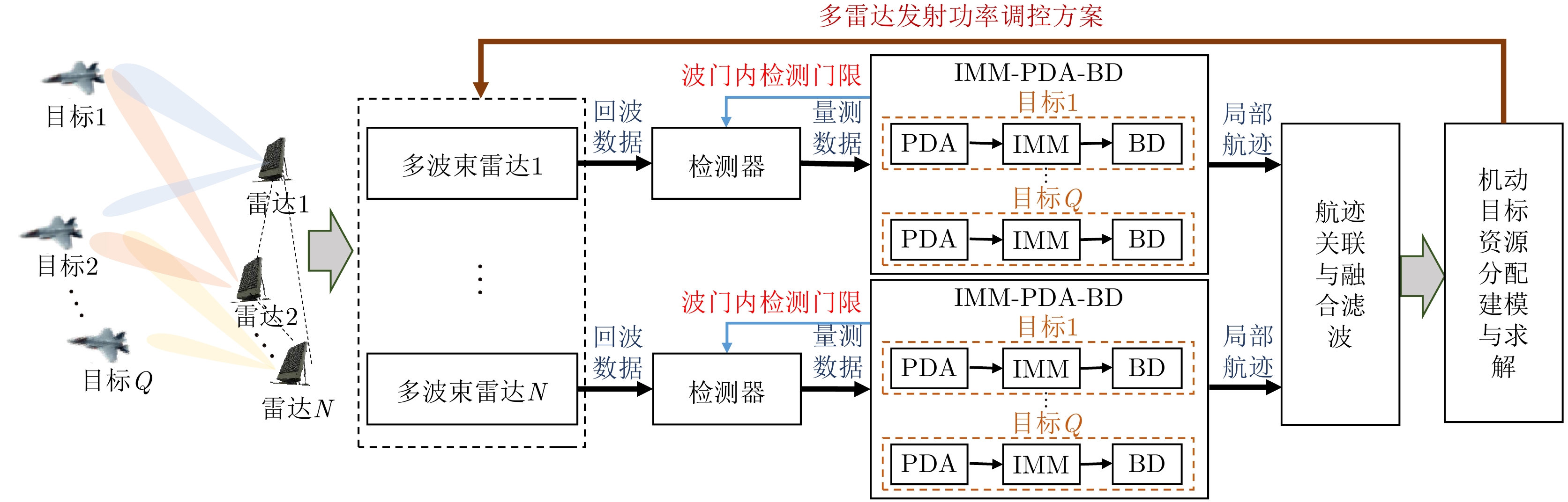 雷达系统在对多机动目标进行跟踪时,跟踪性能会因为多雷达发射资源的非匹配预设和先验信息的不充分利用而下降。针对该问题,提出了一种面向多机动目标的资源分配与精细化跟踪算法,以期在同等资源消耗条件下获取更高的目标跟踪性能。首先,该文结合跟踪器反馈的目标预测信息,利用多模型交互的思想对目标预测位置分布函数进行拟合,建立了基于多模型交互的检测跟踪一体化方法,实现了系统对机动目标的精细化跟踪。而后,分析了多雷达发射资源和机动目标跟踪性能的耦合机理,结合机动目标贝叶斯克拉美罗下界的推导,建立了跟踪性能驱动的多模型加权资源分配框架。最后通过仿真验证了所提方法在相同资源消耗条件下,能够显著提升多机动目标的综合跟踪精度。
