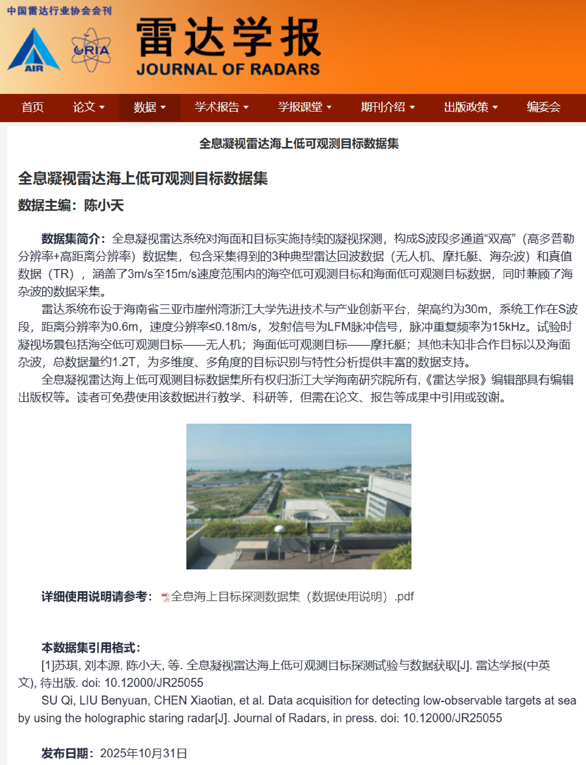海杂波背景下目标检测在很多方面均发挥着至关重要的作用,但复杂海洋环境中海杂波存在类目标尖峰与宽谱特性,导致海用雷达面临检测低慢小目标虚警率增高的严峻挑战。该文利用S波段高多普勒和高距离分辨体制(“双高”体制)全息凝视雷达开展对海探测试验,获取海面、海空低慢小目标与海杂波数据,并附有目标位置与轨迹真值以及风、浪相关数据,构建S波段全息凝视雷达海上低可观测目标数据集,并分析其时域特性、频域特性与时间-多普勒特性,分析结果为数据使用提供参考。后续将持续开展试验,拓展海洋试验环境(如海况、区域)及目标类型,以提升数据的多样性,为支撑海上低可观测目标新体制雷达系统能力提升与海上目标检测识别性能提升提供开放数据集。