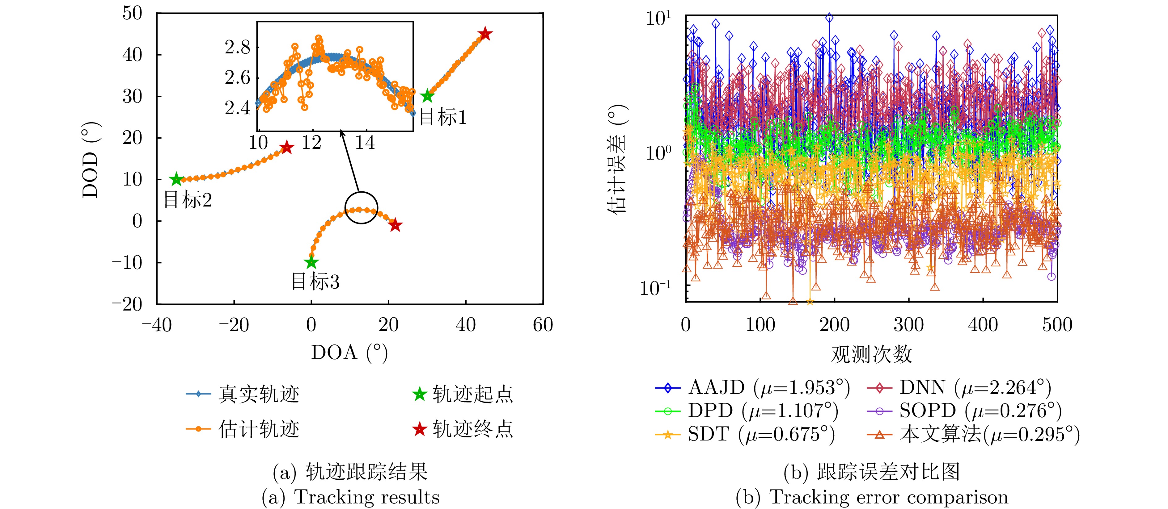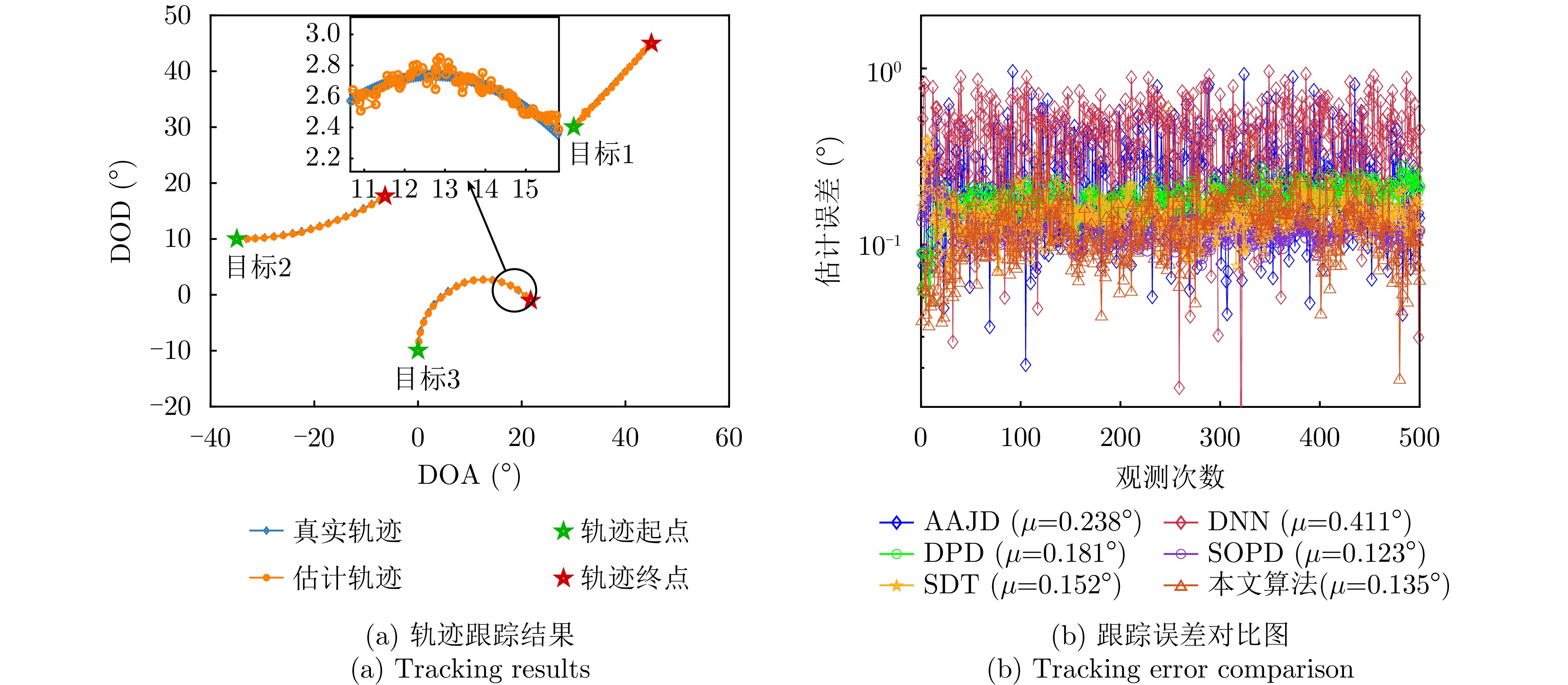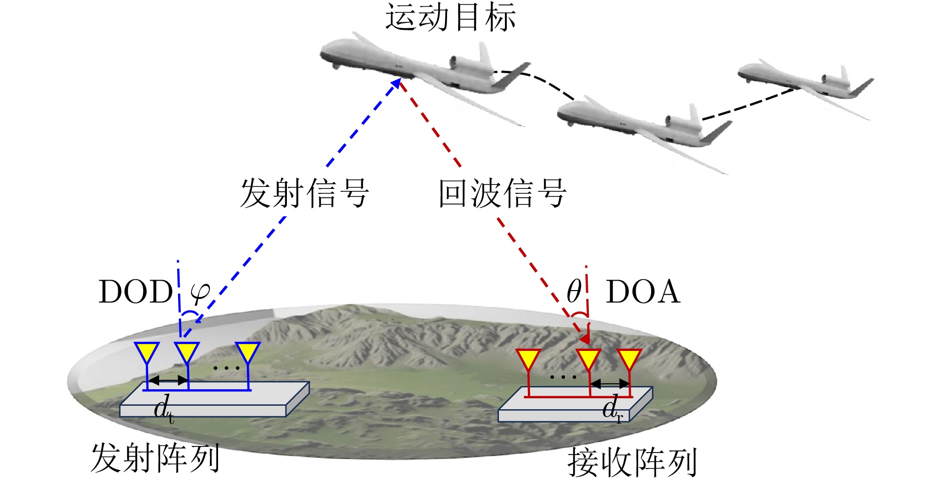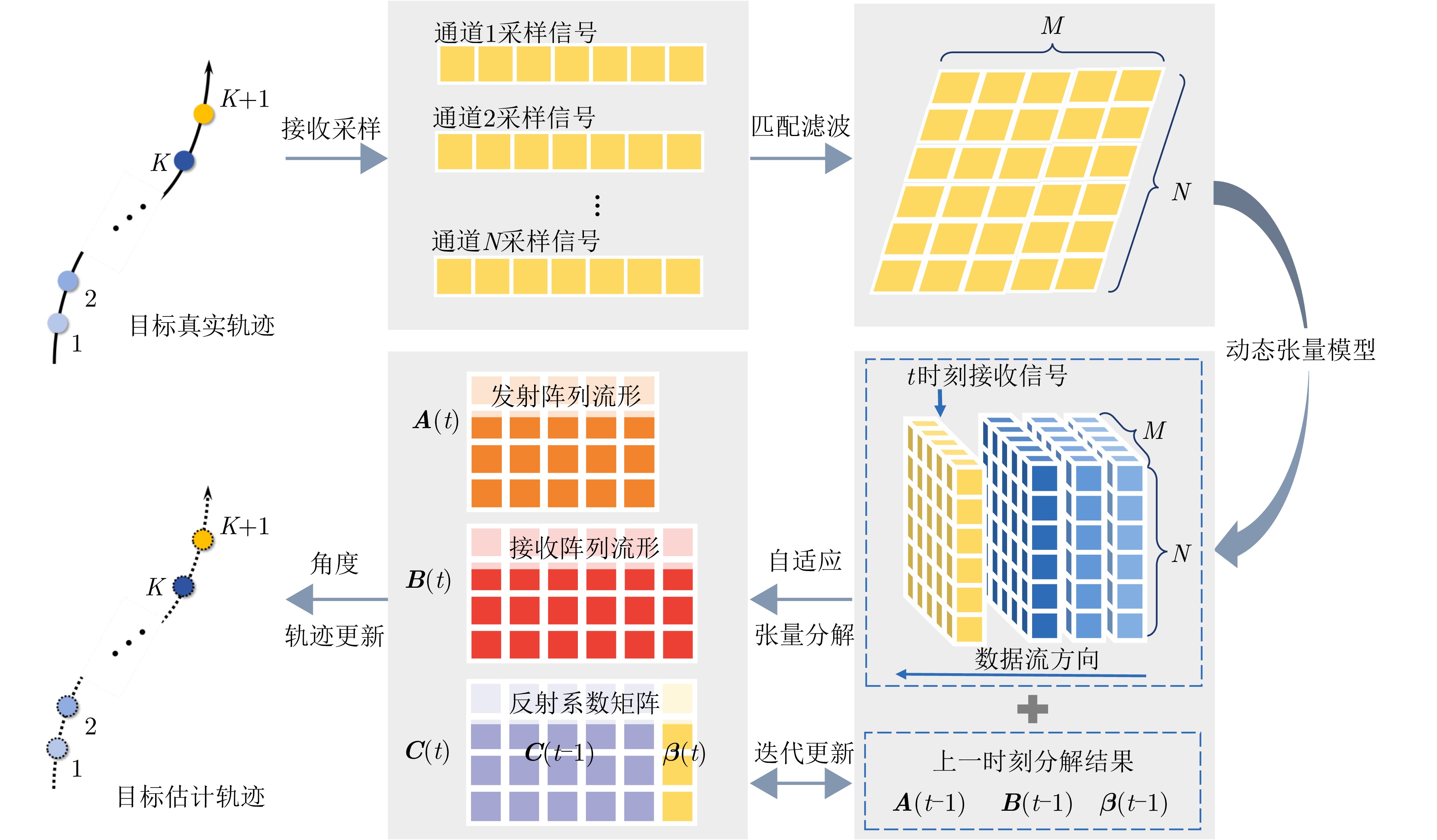 动目标跟踪是双基地多输入多输出(MIMO)雷达系统的核心任务之一,对提升系统的目标感知精度与动态响应能力具有重要意义。针对复杂场景下动目标跟踪性能易受状态变化、高维数据耦合等因素制约的问题,该文提出一种基于自适应张量分解(ATD)的动目标跟踪算法。首先建立包含运动目标波离方向(DOD)和波达方向(DOA)信息的三阶动态张量信号模型,以表征接收信号中时、空多维数据的时变结构。基于所建立动态张量模型,构建运动目标空间位置与张量因子矩阵间的映射关系,采用矩阵随机降维策略设计自适应因子矩阵更新机制,迭代分解包含目标状态信息的阵列流形矩阵,以实现对目标方向的实时稳健跟踪。最后,通过仿真实验分析所提算法的跟踪性能。仿真结果表明,所提算法在低信噪比(SNR)场景下可实现动目标轨迹的持续稳定跟踪。与传统动目标跟踪算法相比,所提算法在保证跟踪精度的同时降低了计算复杂度,跟踪运算时长可缩短1~2个数量级,满足双基地MIMO雷达系统对动目标的实时跟踪需求。