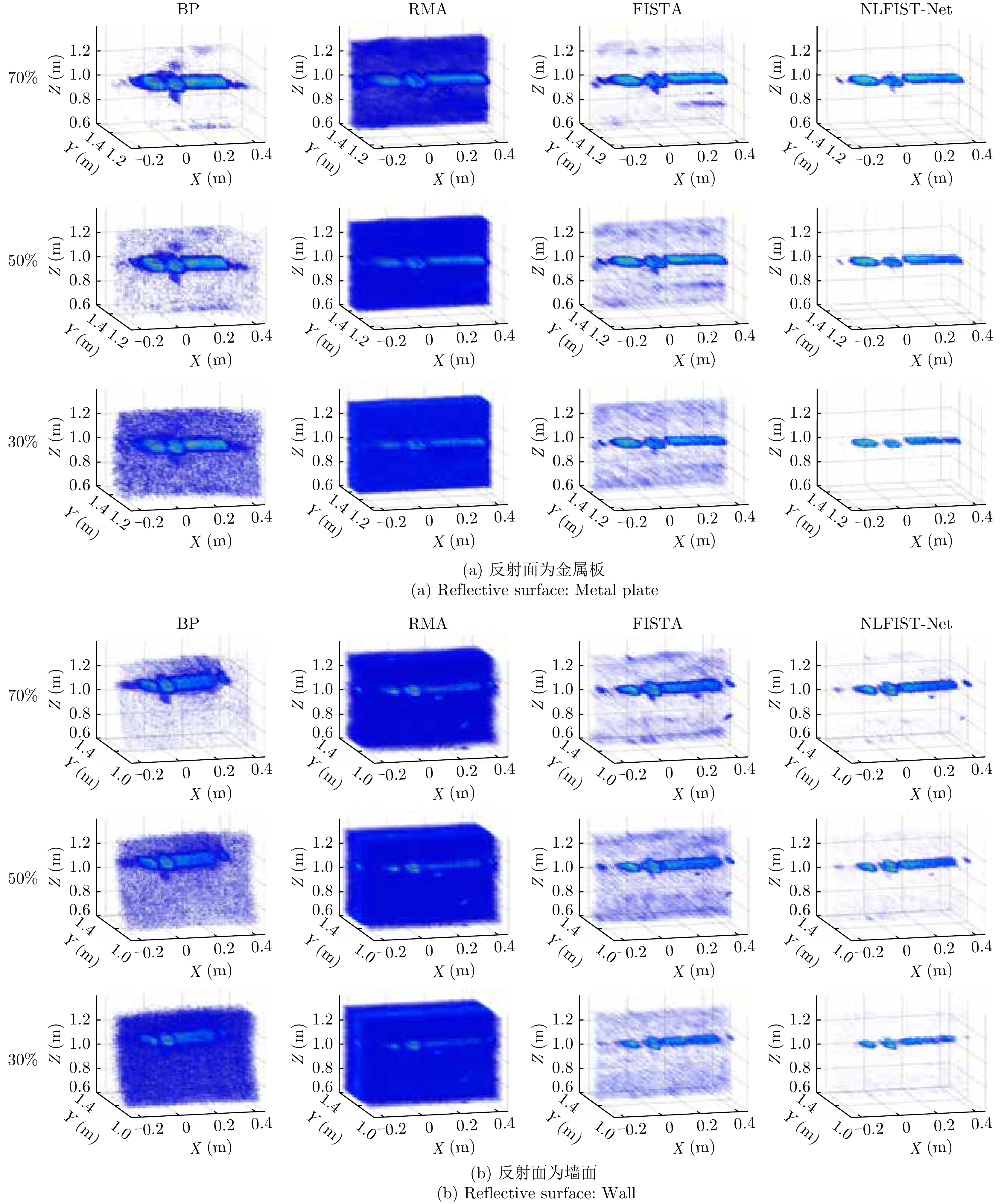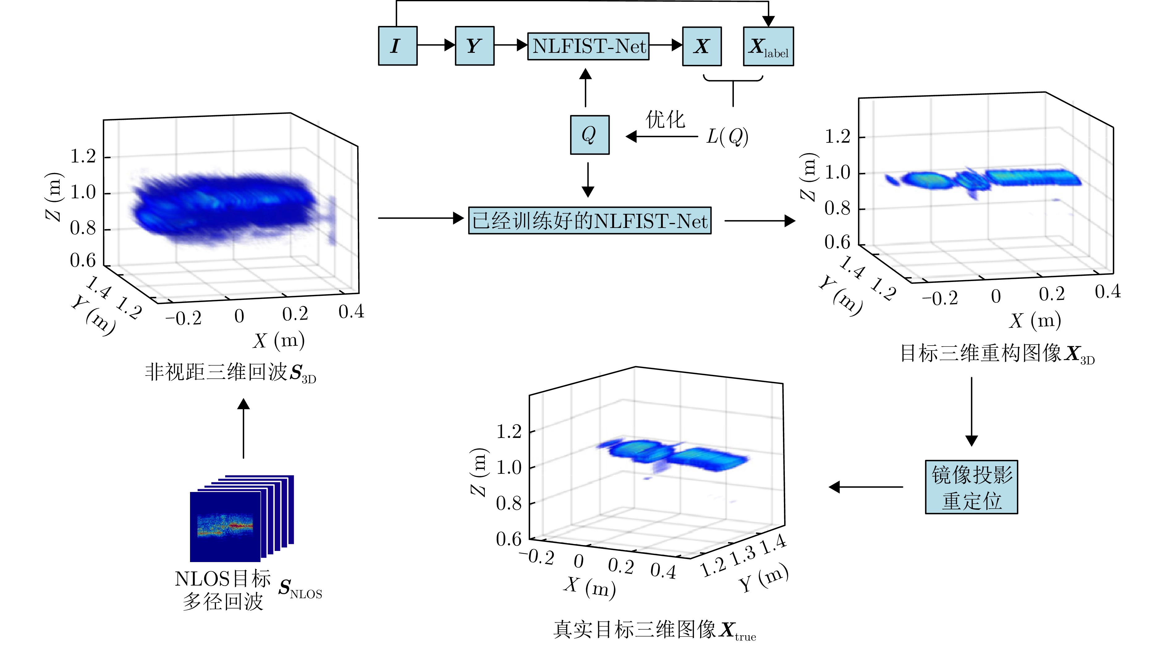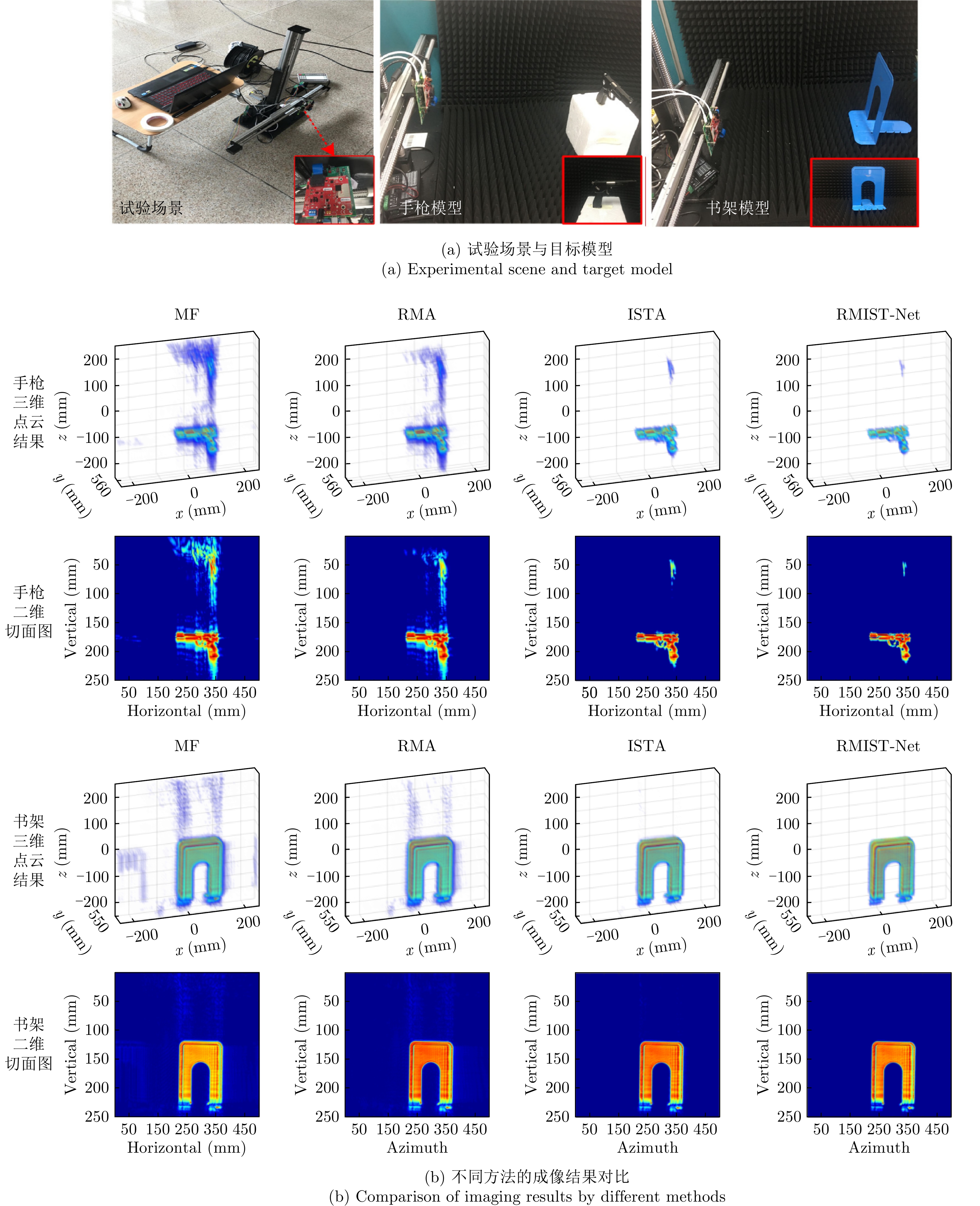 非视距(NLOS)毫米波雷达三维成像利用电磁波反射、衍射、散射、穿透等传播特性,实现对隐蔽环境目标的探测、定位和成像,在无人驾驶、灾害救援、城市作战等领域具有重要应用潜力。然而,受实际非视距场景中反射面、遮挡面等不确定性引入的相位误差、孔径遮蔽、多径效应影响,雷达成像出现分辨率差、伪影增多等问题。针对上述问题,结合深度展开网络和环境先验感知,该文提出了一种基于距离徙动(RM)算子学习驱动的非视距毫米波雷达三维成像方法。首先,建立了拐角(LAC)场景下非视距毫米波雷达三维成像模型,引入RM核算子提高成像效率,降低计算复杂度;其次,构建了一种基于快速迭代收缩阈值(FISTA)框架的高精度非视距三维成像网络,利用非视距场景特性,将算法参数设计为网络权重的函数,实现非视距目标高精度、高效率三维重构;最后,搭建了近场非视距毫米波雷达成像平台,完成了理想与非理想反射面场景下金属字母“O”“S”以及埃菲尔铁塔模型、人造卫星模型等目标的实验验证,结果表明所提方法在提升三维成像精度的同时,运行速度较传统稀疏成像算法提升了两个数量级。