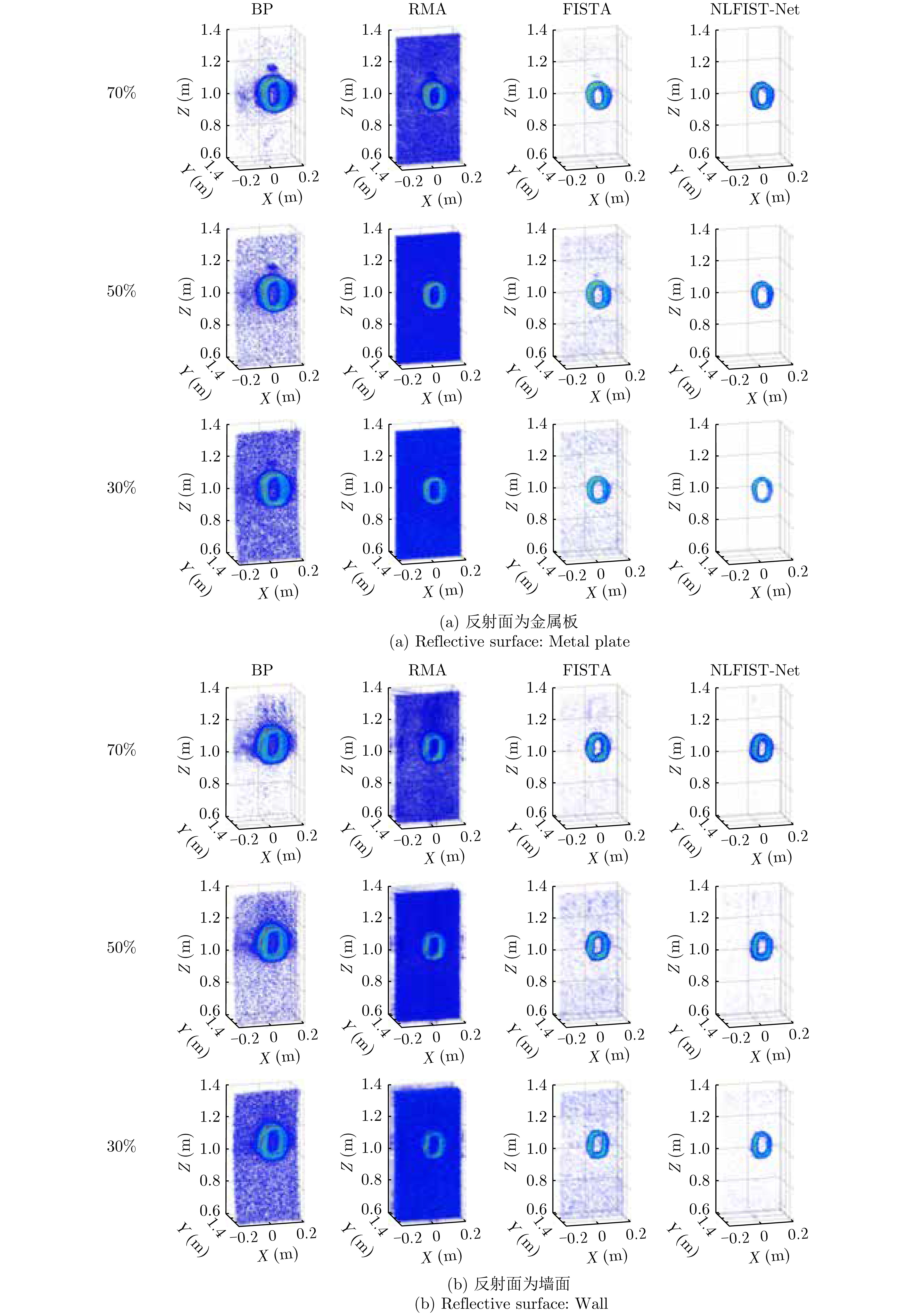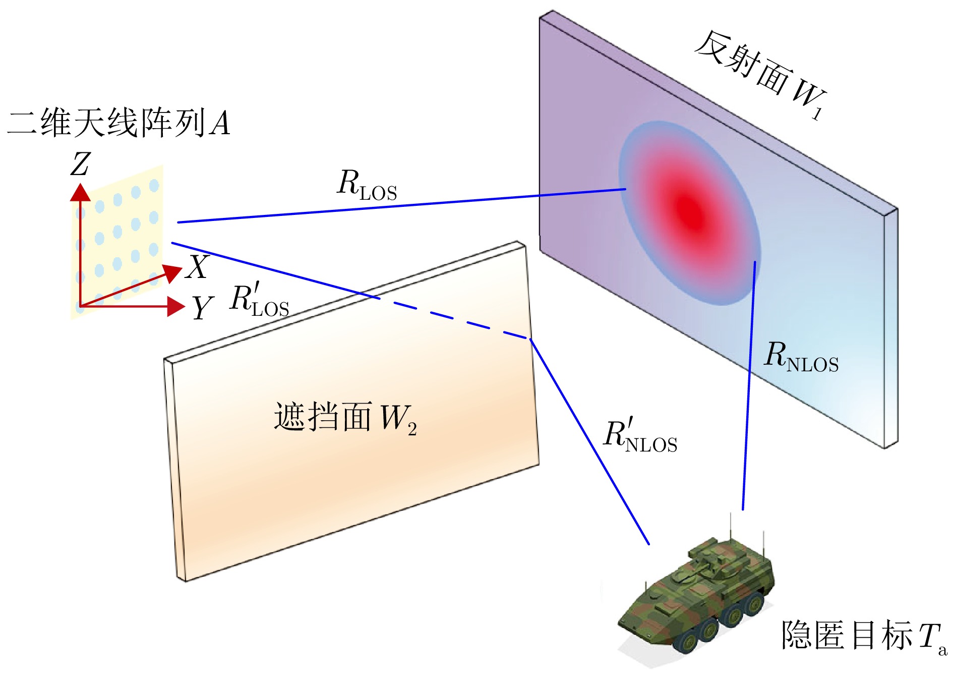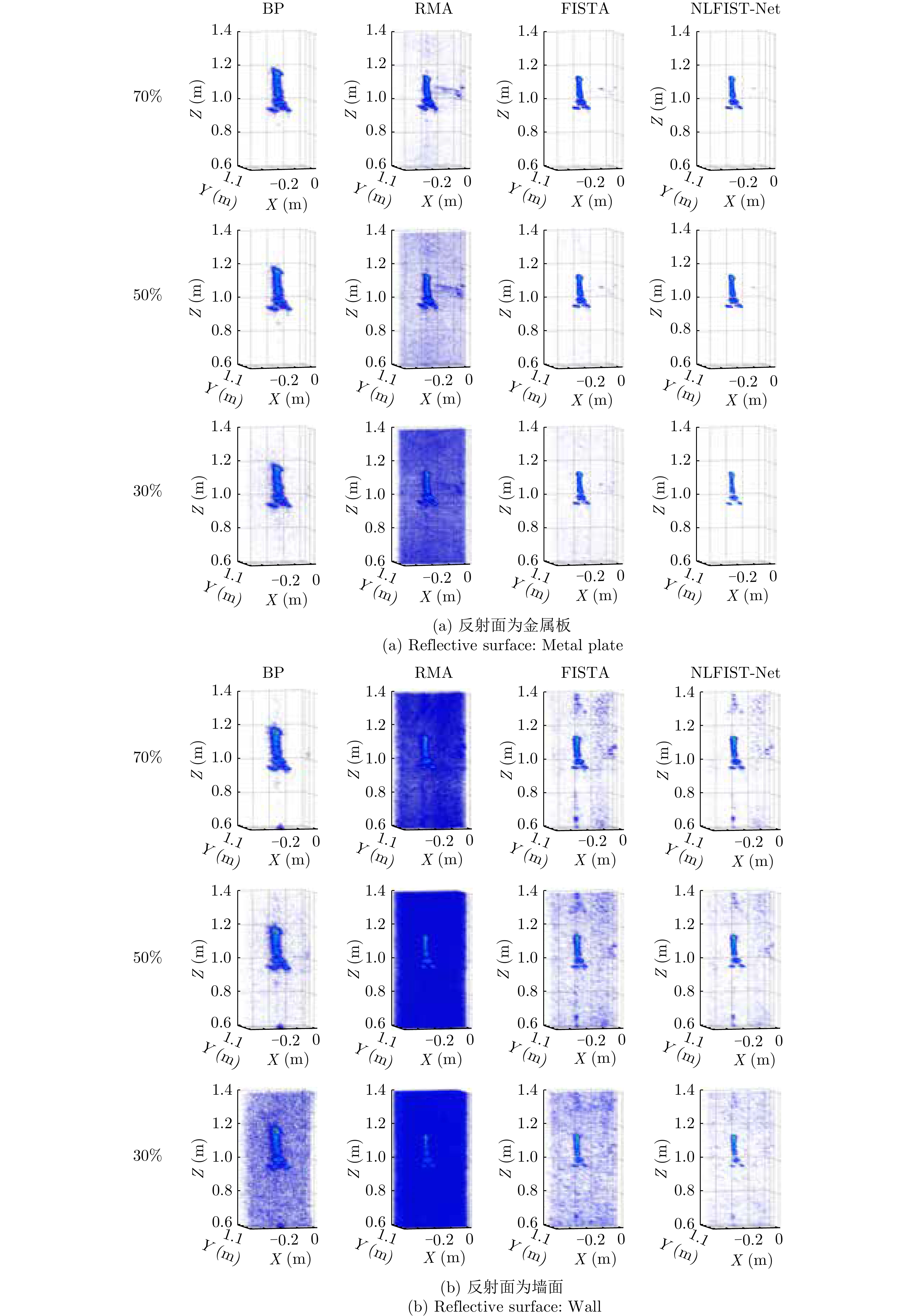 非视距(NLOS)毫米波雷达三维成像利用电磁波反射、衍射、散射、穿透等传播特性,实现对隐蔽环境目标的探测、定位和成像,在无人驾驶、灾害救援、城市作战等领域具有重要应用潜力。然而,受实际非视距场景中反射面、遮挡面等不确定性引入的相位误差、孔径遮蔽、多径效应影响,雷达成像出现分辨率差、伪影增多等问题。针对上述问题,结合深度展开网络和环境先验感知,该文提出了一种基于距离徙动(RM)算子学习驱动的非视距毫米波雷达三维成像方法。首先,建立了拐角(LAC)场景下非视距毫米波雷达三维成像模型,引入RM核算子提高成像效率,降低计算复杂度;其次,构建了一种基于快速迭代收缩阈值(FISTA)框架的高精度非视距三维成像网络,利用非视距场景特性,将算法参数设计为网络权重的函数,实现非视距目标高精度、高效率三维重构;最后,搭建了近场非视距毫米波雷达成像平台,完成了理想与非理想反射面场景下金属字母“O”“S”以及埃菲尔铁塔模型、人造卫星模型等目标的实验验证,结果表明所提方法在提升三维成像精度的同时,运行速度较传统稀疏成像算法提升了两个数量级。