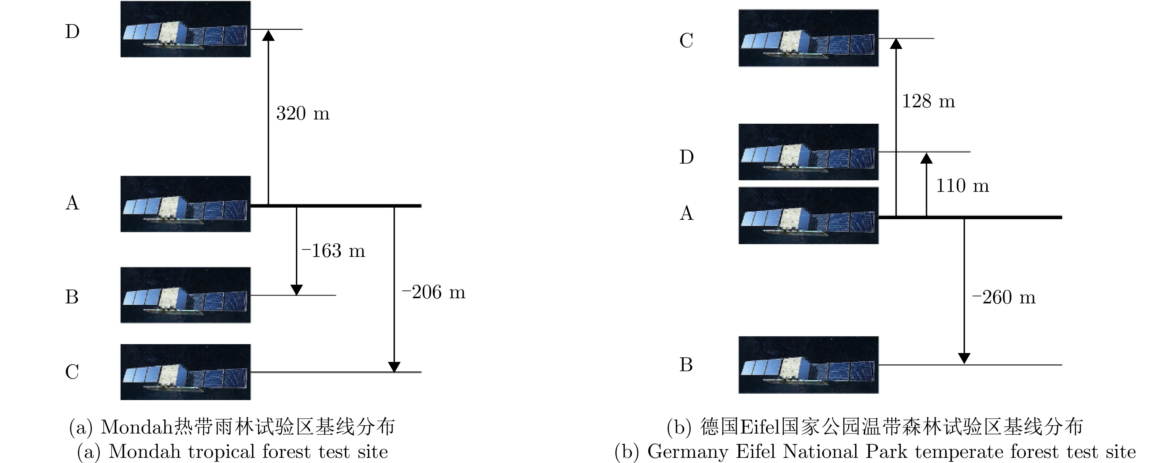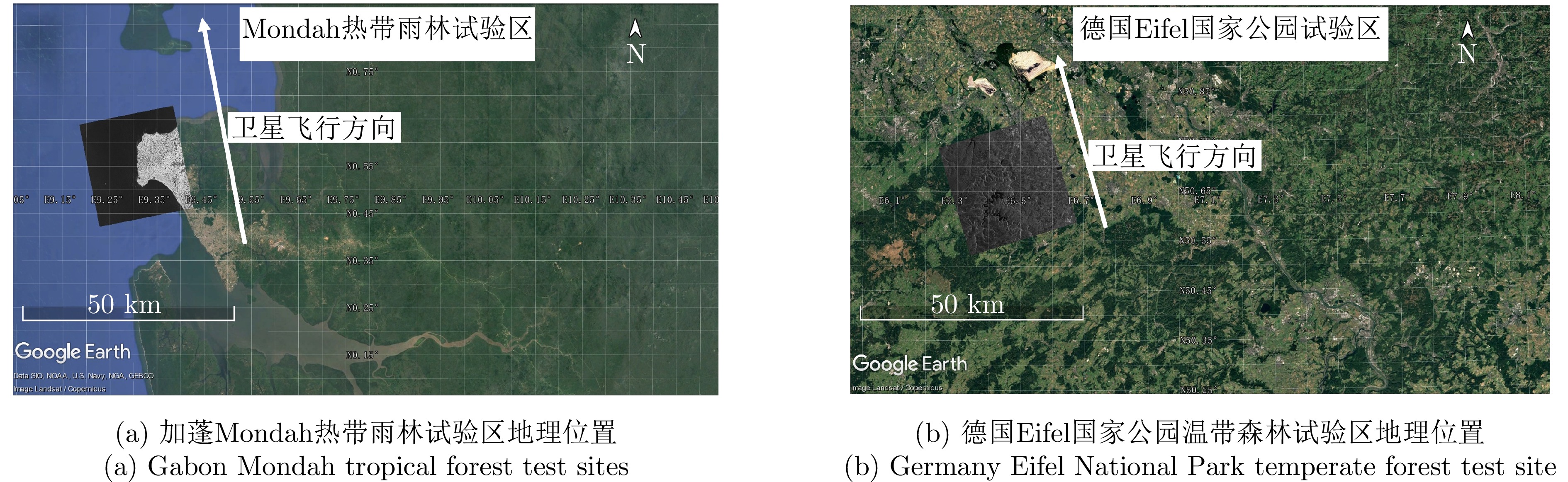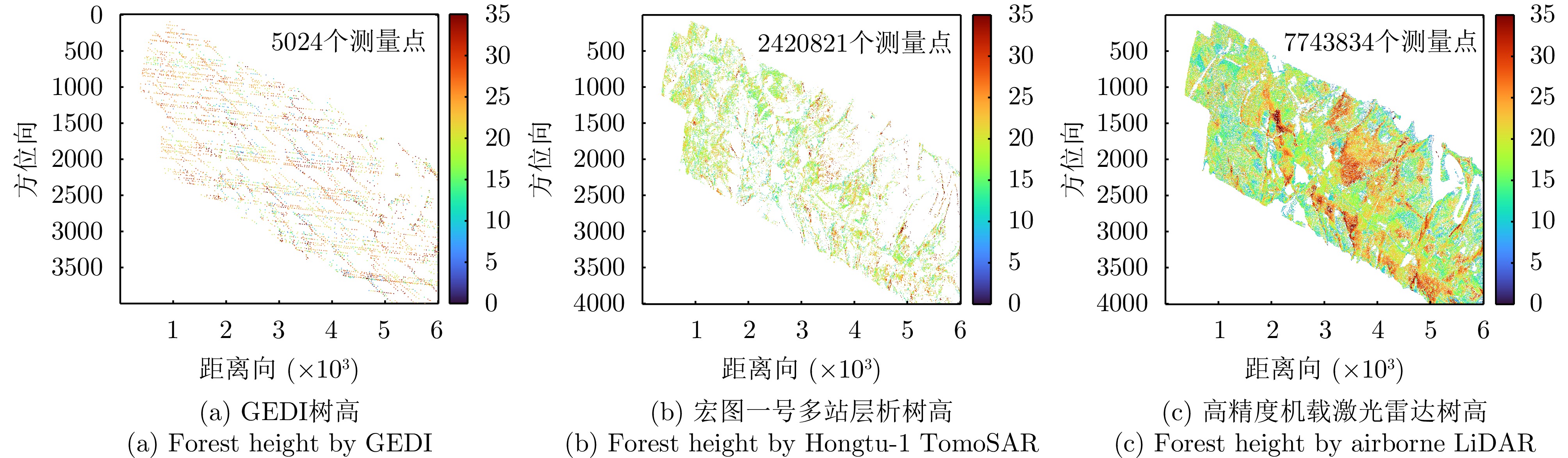 层析SAR (TomoSAR)技术凭借其三维分辨能力,能够对森林、冰川和积雪等场景的三维结构进行研究。但目前的星载层析SAR主要依靠重复轨道观测来实现。重轨层析SAR观测体制带来两大难题,一是时间去相干,二是对流层或电离层等导致的信号传播延时。严重的时间去相干和对流层、电离层传播延迟会使得层析成像出现散焦,导致无法进行场景三维结构重建。与重轨观测层析SAR体制不同,多站层析SAR所有图像在同一时刻获得,不存在时间去相干,信号传播延迟也能完全抵消,这使得多站层析SAR用于三维重建优势明显。航天宏图信息技术股份有限公司在2023年发射了世界首个X波段四星多站体制雷达星座—宏图一号,该文利用宏图一号星座的四星雷达数据,开展了星载多站层析SAR森林高度反演数据实验。通过对热带雨林和温带森林开展实验,发现宏图一号X波段雷达信号基本无法穿透茂密的热带雨林到达地面,但是能够穿透植被密度较小的温带森林,这表明宏图一号具备对温带森林进行森林高度反演的潜力。通过TomoSAR对温带森林进行树高反演,并以高精度机载激光雷达测得的树高为参考,与GEDI星载激光雷达测量结果做对比验证,发现在该文所采用的测试场景中,星载多站TomoSAR的测量结果比GEDI星载激光雷达具有更高的精度(提升约35%),更多的测量点数和更高的空间分辨率,验证了使用宏图一号数据进行层析SAR森林高度反演的可行性和优势。