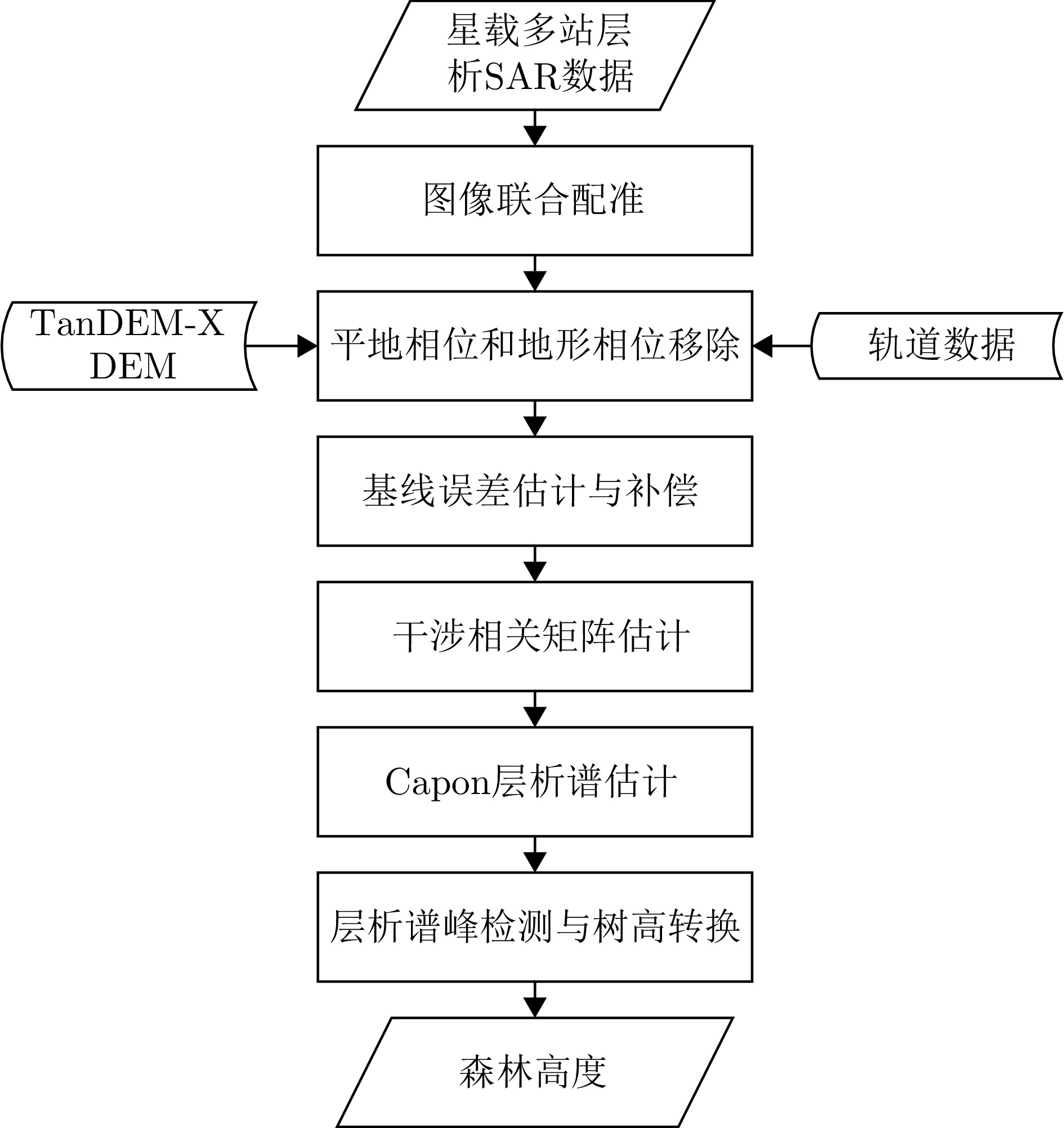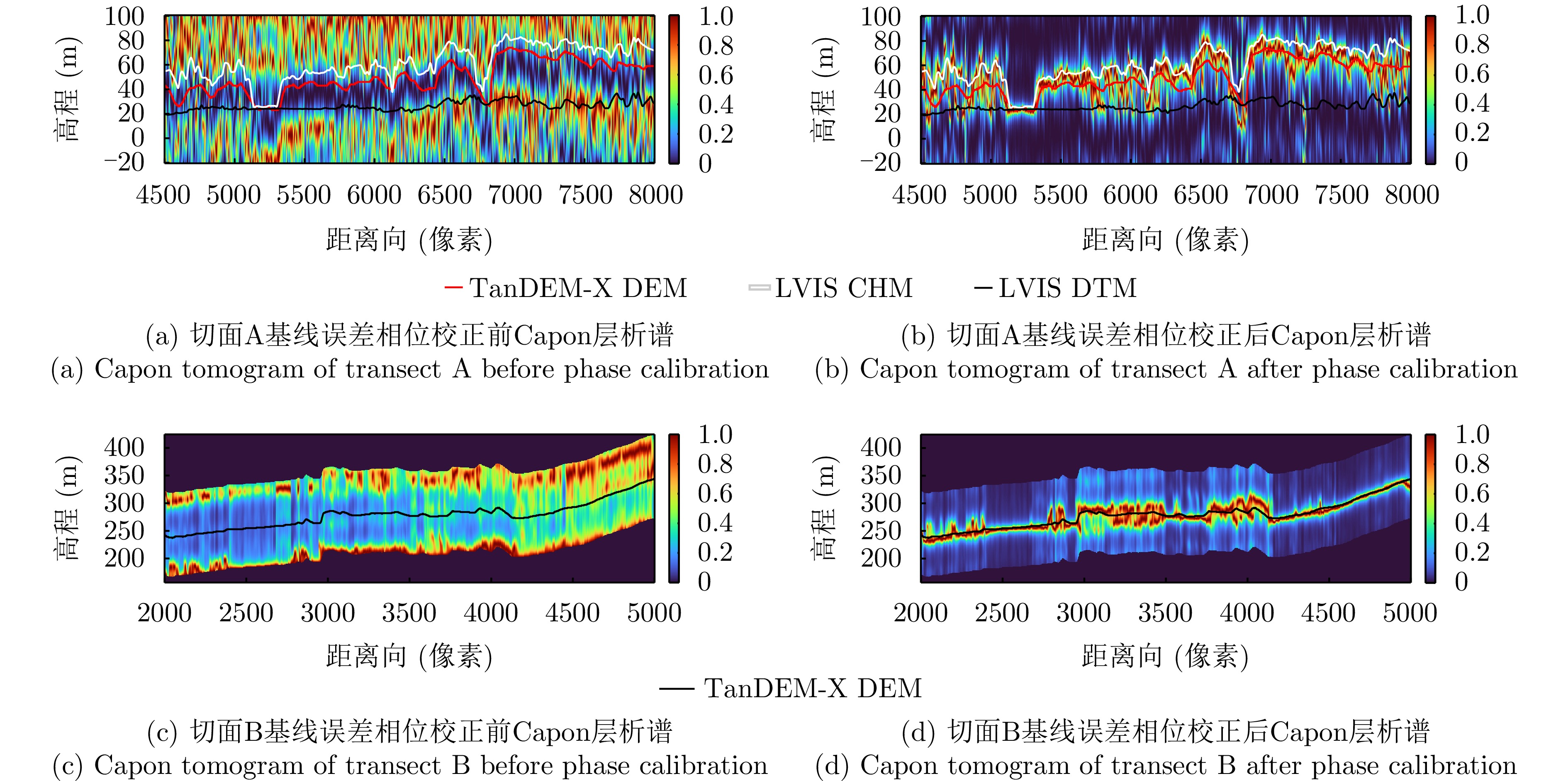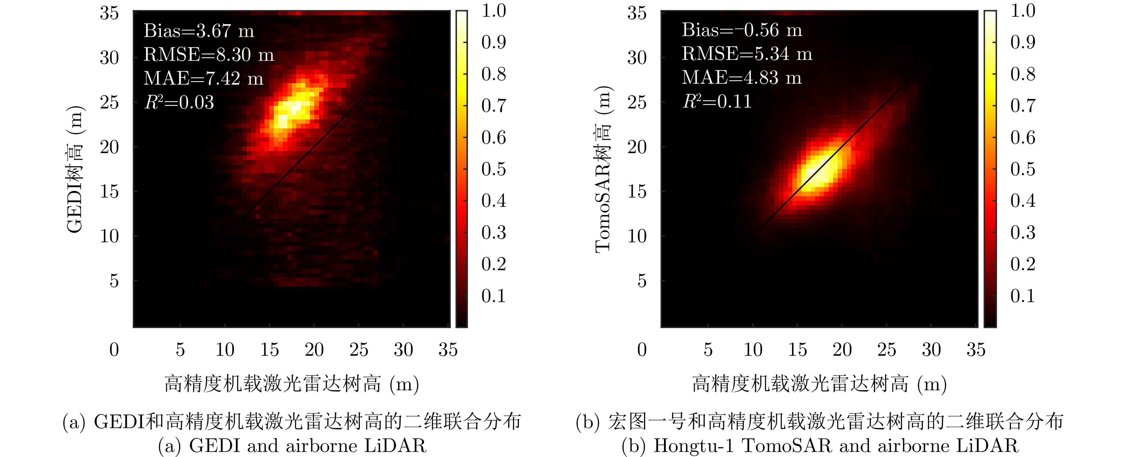 层析SAR (TomoSAR)技术凭借其三维分辨能力,能够对森林、冰川和积雪等场景的三维结构进行研究。但目前的星载层析SAR主要依靠重复轨道观测来实现。重轨层析SAR观测体制带来两大难题,一是时间去相干,二是对流层或电离层等导致的信号传播延时。严重的时间去相干和对流层、电离层传播延迟会使得层析成像出现散焦,导致无法进行场景三维结构重建。与重轨观测层析SAR体制不同,多站层析SAR所有图像在同一时刻获得,不存在时间去相干,信号传播延迟也能完全抵消,这使得多站层析SAR用于三维重建优势明显。航天宏图信息技术股份有限公司在2023年发射了世界首个X波段四星多站体制雷达星座—宏图一号,该文利用宏图一号星座的四星雷达数据,开展了星载多站层析SAR森林高度反演数据实验。通过对热带雨林和温带森林开展实验,发现宏图一号X波段雷达信号基本无法穿透茂密的热带雨林到达地面,但是能够穿透植被密度较小的温带森林,这表明宏图一号具备对温带森林进行森林高度反演的潜力。通过TomoSAR对温带森林进行树高反演,并以高精度机载激光雷达测得的树高为参考,与GEDI星载激光雷达测量结果做对比验证,发现在该文所采用的测试场景中,星载多站TomoSAR的测量结果比GEDI星载激光雷达具有更高的精度(提升约35%),更多的测量点数和更高的空间分辨率,验证了使用宏图一号数据进行层析SAR森林高度反演的可行性和优势。