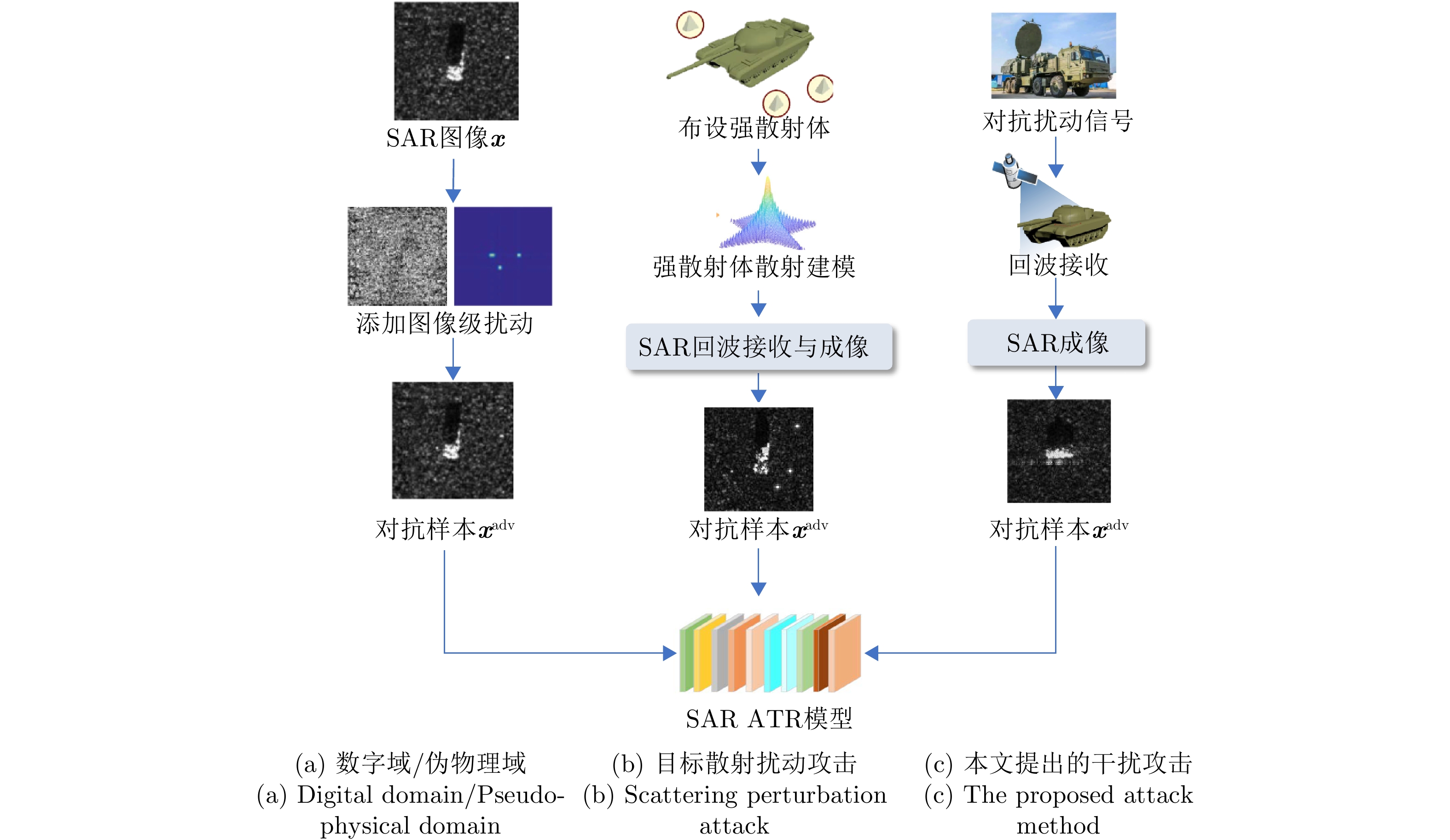 合理利用SAR对抗样本可以使得特定目标在智能探测技术下实现遥感隐身,从而避免被敌方探测或识别。数字域的SAR对抗方法仅在图像域进行攻击,缺乏物理可实现性,现有物理域对抗方法通过在目标周围布置角反射器、超表面,借助电磁计算模拟对抗样本,但由于散射估计精度低,实际保护效能受限。为解决上述问题,该文将SAR有源干扰技术与对抗攻击方法相结合,提出了基于有源干扰机的SAR智能识别对抗方法,在信号域扰动目标回波信号以生成对抗样本。首先,选择基于余弦幅度加权的多相位分段调制干扰技术,通过扰动分量的设计,实现对抗扰动信号的参数化控制;然后,基于SAR成像链路,将有源干扰机生成的对抗扰动信号与目标的回波信号融合,经成像处理得到具有物理意义的SAR对抗样本;最后,引入差分进化算法,动态调整多相位分段调制干扰的能量分布与空间覆盖范围等参数,进而优化SAR对抗样本,在干扰强度较小的情况下取得最佳攻击成功率。实验结果表明,所提方法在MSTAR数据集上实现平均90.88%的攻击成功率,并对5种SAR ATR模型具有较强的可转移性,其中最高可达75.57%。该方法实现了更具物理可实现性的对抗样本生成,为遥感探测中特定目标的安全防护开辟新的解决思路,并为真实场景下有源干扰信号的应用提供智能化指导。