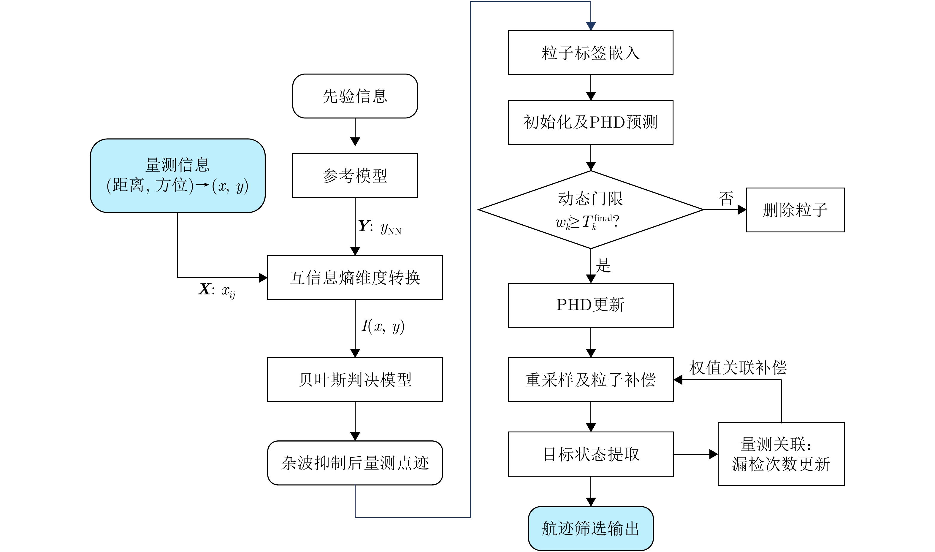 针对非合作双基地雷达目标跟踪时主要面临的高杂波率、低检测概率等问题,该文提出了一种基于互信息熵和改进PHD滤波器的目标跟踪协同处理框架,首先将目标点和杂波点与参考模型间不同的统计相关程度量化为互信息熵值,基于互信息熵维特征完成杂波点迹筛除;其次通过动态权值补偿对经典PHD滤波器进行改进,减缓粒子权值归零过程的同时减少目标误删现象,解决低检测概率下点迹不连续且间隔随机给目标跟踪带来的点迹断联、目标丢失等问题。通过仿真实验验证了所提算法框架的有效性与性能,外场实测数据验证了所提方法在实际应用中可取得良好的目标跟踪结果。