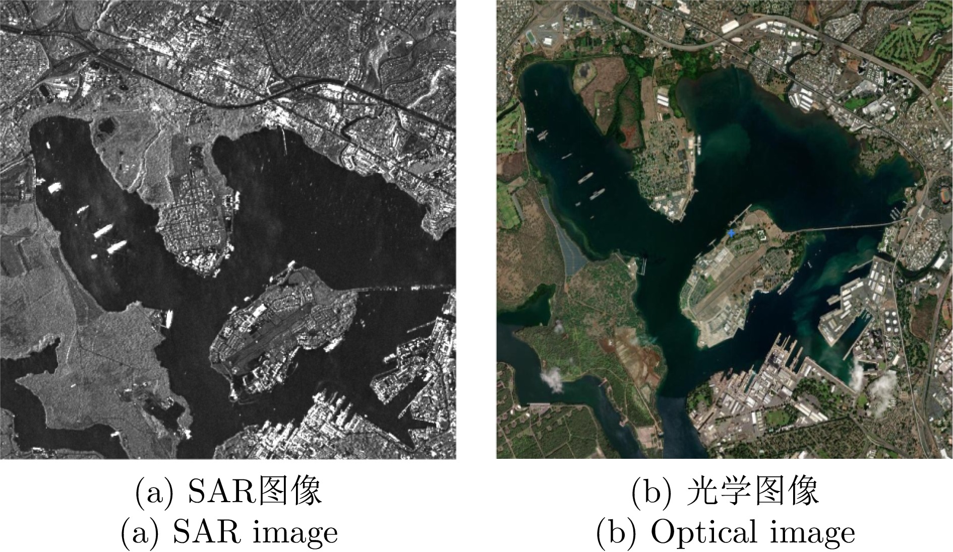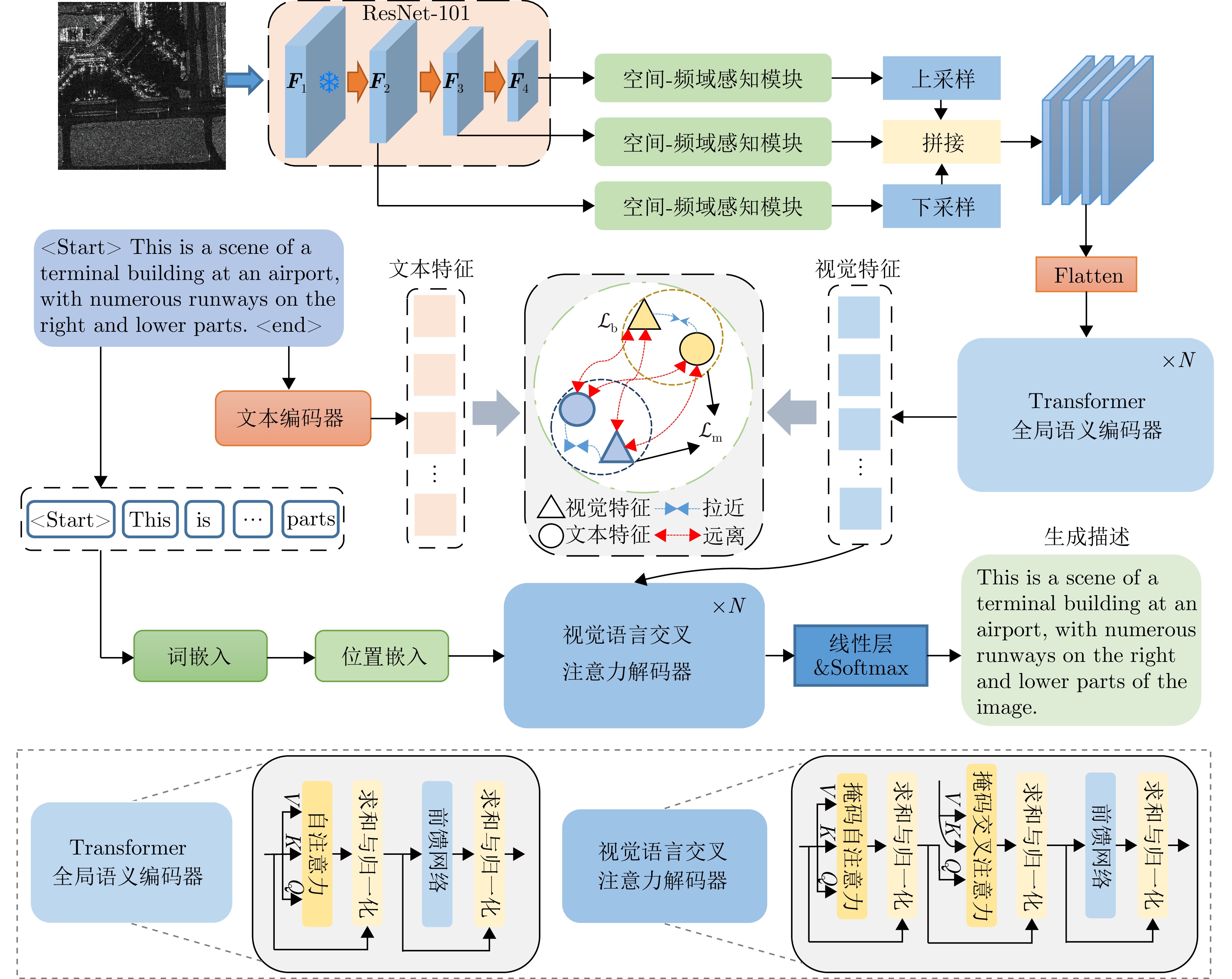 合成孔径雷达(SAR)作为一种主动微波遥感系统,具有“全天时、全天候”的观测能力,在灾害监测、城市管理及军事侦察等领域发挥着重要应用价值。尽管深度学习技术已推动SAR图像解译取得了显著进展,但现有目标识别与检测方法多聚焦于局部特征提取与单一目标判别,难以全面刻画复杂场景的整体语义结构与多目标关系,且解译流程仍高度依赖专业人员,自动化水平有限。SAR图像描述旨在将视觉信息转化为自然语言,是从“感知目标”向“认知场景”跨越的关键技术,对于提升SAR图像解译的自动化与智能化水平具有重要意义。然而,SAR图像固有的相干斑噪声干扰、纹理细节匮乏、语义鸿沟显著进一步加剧了跨模态理解的难度。针对上述问题,该文提出一种基于空间-频率感知的SAR图像描述方法(DGS-CapNet)。首先,构建空间-频域感知模块,利用离散余弦变换(DCT)掩码注意力机制对频谱成分加权以抑制噪声并强化结构特征,同时结合Gabor多尺度纹理增强模块提升对方向与边缘细节的感知能力;其次,设计跨模态语义增强损失函数,通过双向对比损失与最大互信息损失,有效缩减视觉特征与自然语言间的语义鸿沟。此外,我们还构建了包含72400 条高质量图文对的大规模细粒度SAR图像描述数据集FSAR-Cap。实验结果表明,该方法在SARLANG和FSAR-Cap数据集上的CIDEr指标分别达到151.00和95.14。定性分析表明,该模型有效抑制了幻觉,并准确捕捉了细粒度的空间纹理细节,显著优于主流方法。