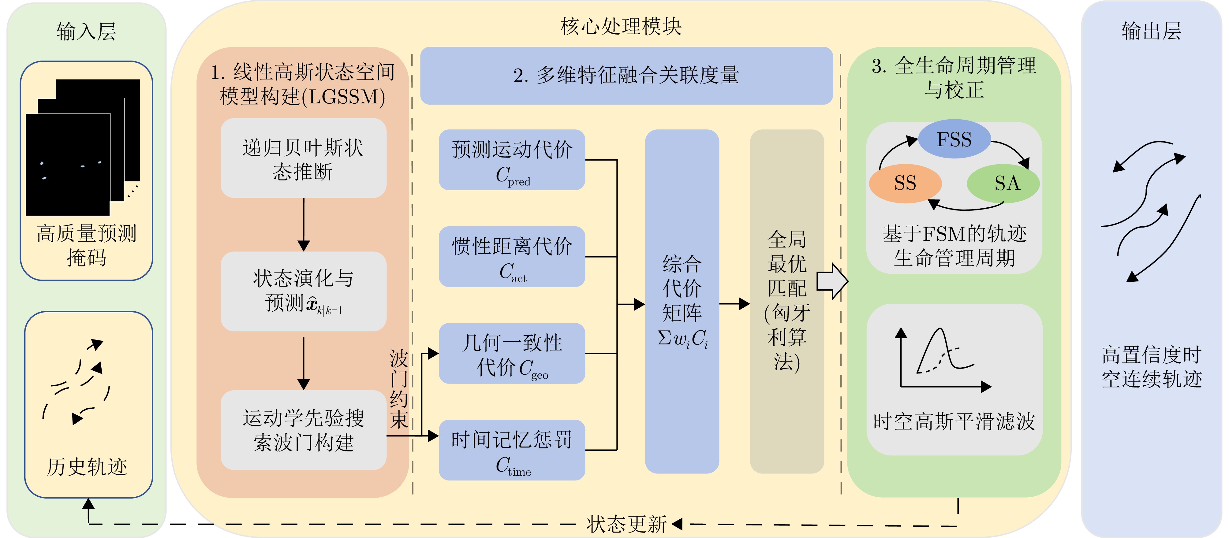 针对视频合成孔径雷达(Video SAR)动目标阴影跟踪任务中面临的强相干斑噪声、显著非刚性形变及有监督训练样本稀缺等挑战,该文提出一种融合物理感知频空注意力与运动学约束的半监督跟踪方法。在检测阶段,构建基于UniMatchV2架构改进的半监督特征增强网络,通过在解码器高层特征嵌入所设计的物理感知混合频空注意力(PA-HSSA)模块,利用其频域分支实现对特征域宽带高频干扰的全局抑制,并借助空域分支对阴影几何结构进行局部锚定,同时引入动态权重生成器以自适应融合双域特征,从而在极低标注率条件下生成高质量的预测掩码。在跟踪阶段,提出一种面向半监督不确定性的时空关联框架,首先基于线性高斯状态空间模型(LGSSM)构建运动学先验波门以平滑检测结果的边缘抖动,进而设计融合运动学残差与几何一致性约束的多维代价矩阵,有效缓解因目标机动与形变引起的关联模糊问题。基于桑迪亚国家实验室(SNL)实测数据的实验结果表明,在仅使用1/32有标签数据的情况下,所提方法的多目标跟踪准确率(MOTA)达到64.19%,较基准方法提升6.73%,显著提升了强杂波背景下弱小阴影目标的稳健跟踪性能。