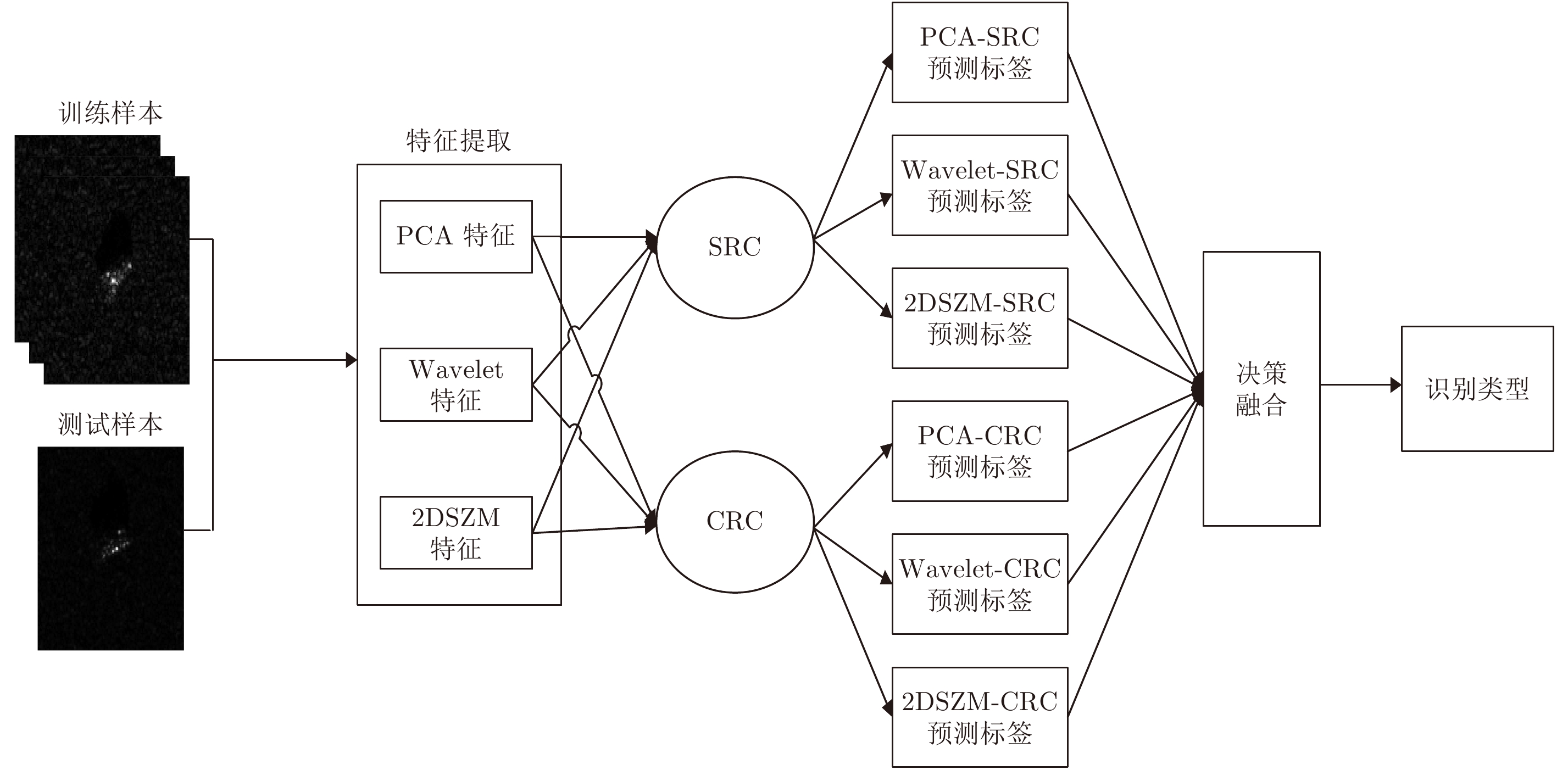 摘要: 针对合成孔径雷达(Synthetic Aperture Radar, SAR)图像目标识别问题,该文提出了一种基于多特征-多表示学习分类器融合的识别算法。首先,该算法提取了SAR图像3种特征,包括主成分(Principle Component Analysis, PCA)特征,小波变换特征和2维切片Zernike矩(2-Dimension Slice Zernike Moments, 2DSZM)特征。然后,将测试样本的3类特征分别输入稀疏表示分类器和协同表示分类器进行预分类,得到6个预测标签。对6个预测标签进行分类器融合,得到最终的识别决策。实验中研究了3种不同的分类器融合算法,实验结果表明利用贝叶斯决策融合得到了最佳的识别性能。基于多特征-多表示学习分类器融合的方法集成了多特征的鉴别能力,也融合了稀疏和协同表示的分类性能,实现优势互补,有效提高了识别精度。基于Moving and Stationary Target Acquisition and Recognition (MSTAR)公开发布的SAR目标数据库的实验验证了该方法的有效性。Abstract: In this paper, we present a Synthetic Aperture Radar (SAR) image target recognition algorithm based on multi-feature multiple representation learning classifier fusion. First, it extracts three features from the SAR images, namely principal component analysis, wavelet transform, and Two-Dimensional Slice Zernike Moments (2DSZM) features. Second, we harness the sparse representation classifier and the cooperative representation classifier with the above-mentioned features to get six predictive labels. Finally, we adopt classifier fusion to obtain the final recognition decision. We researched three different classifier fusion algorithms in our experiments, and the results demonstrate thatusing Bayesian decision fusion gives thebest recognition performance. The method based on multi-feature multiple representation learning classifier fusion integrates the discrimination of multi-features and combines the sparse and cooperative representation classification performance to gain complementary advantages and to improve recognition accuracy. The experiments are based on the Moving and Stationary Target Acquisition and Recognition (MSTAR) database,and they demonstrate the effectiveness of the proposed approach.