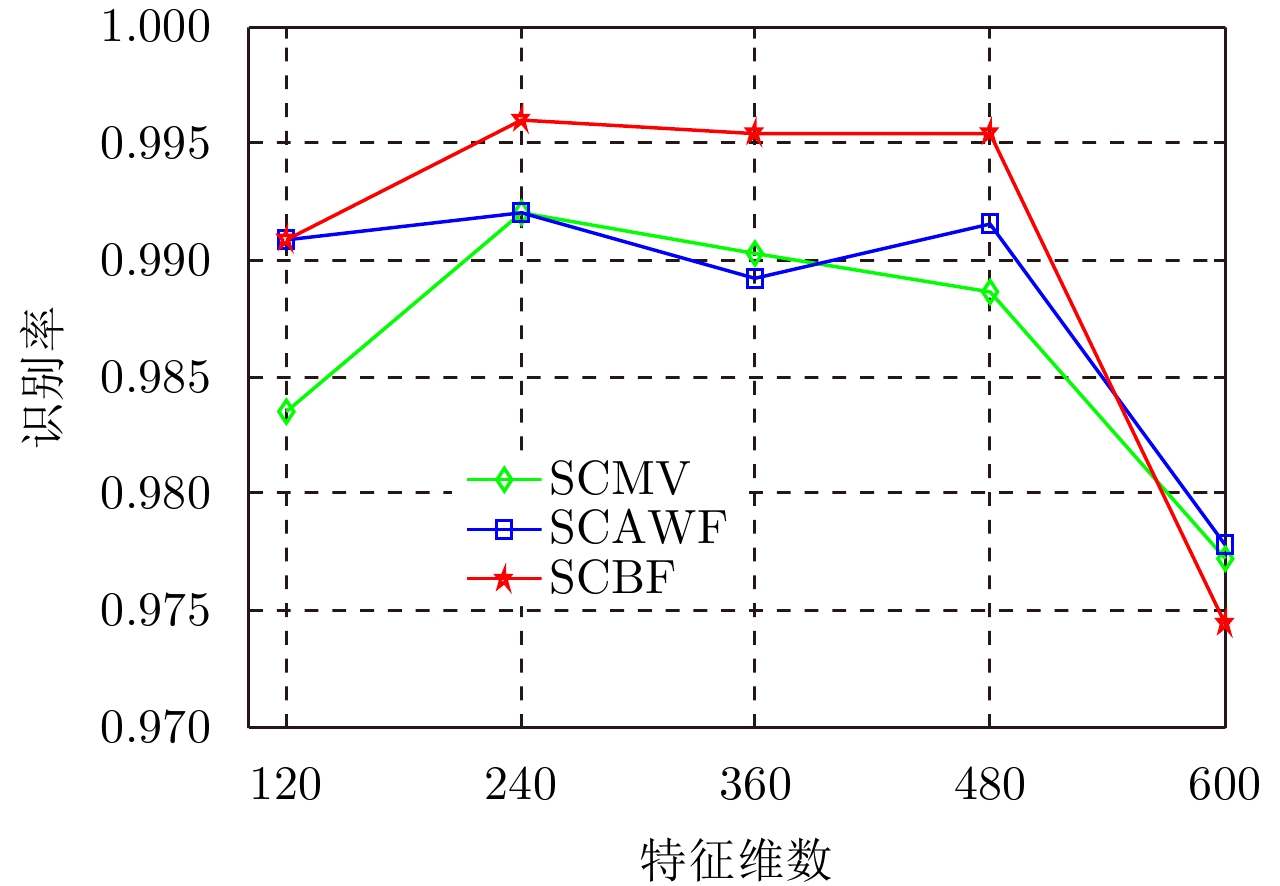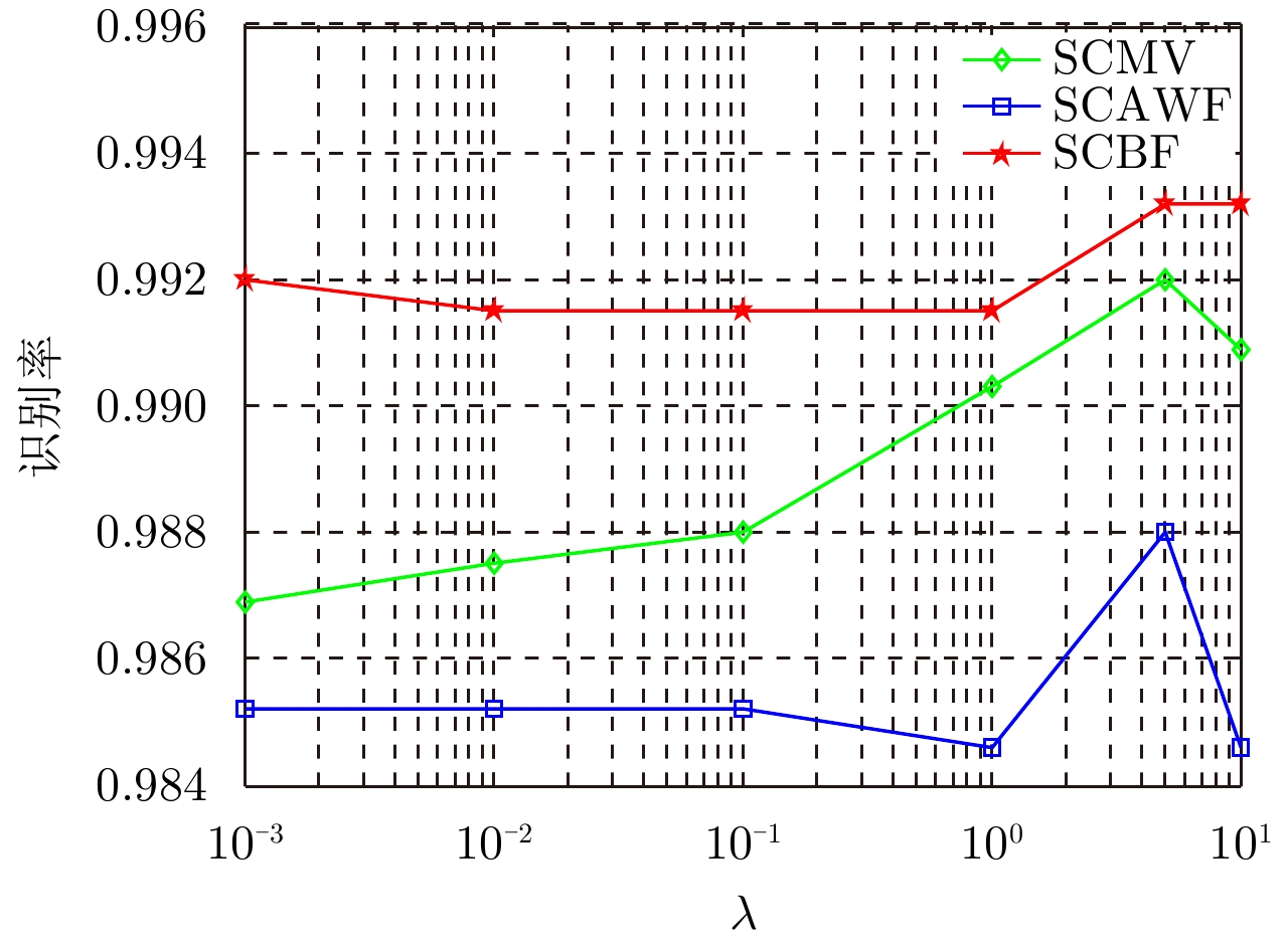 特征维数 方法 SCBF SCMV SCAWF 120 99.09 99.03 99.09 240 99.60 99.20 99.20 360 99.54 90.03 98.92 480 99.54 98.86 99.15 600 97.44 97.72 97.78 表 3 3种算法随规则化参数 $ λ $的识别率(%)