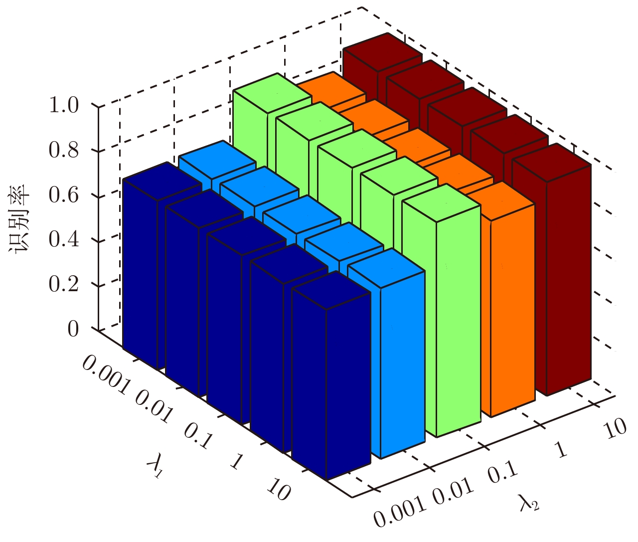 $ λ $ 识别结果 目标类型 BMP2 BTR70 T72 10–3 BMP2 580 4 3 BTR70 4 584 0 T72 3 0 579 10–2 BMP2 580 4 4 BTR70 4 584 0 T72 3 0 578 10–1 BMP2 581 5 3 BTR70 3 583 1 T72 3 0 578 1 BMP2 579 4 3 BTR70 5 584 0 T72 3 0 579 5 BMP2 579 3 1 BTR70 4 585 0 T72 4 0 581 10 BMP2 579 3 1 BTR70 4 585 0 T72 4 0 581 表 5 大俯仰角实验中使用的数据集