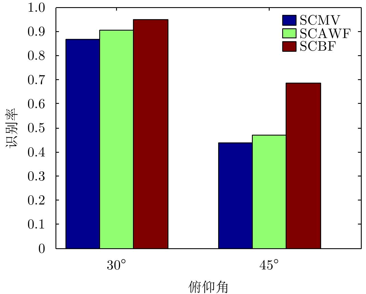 俯仰角 (°) 分类方法 SRC (PCA) SRC (小波) SRC (2DSZM) CRC (PCA) CRC (小波) CRC (2DSZM) SCMV AFWF SCBF 30 86.91 33.49 87.60 84.13 32.79 88.30 86.56 90.38 94.79 45 63.37 36.63 44.44 59.96 33.33 45.32 43.78 46.86 68.65 -