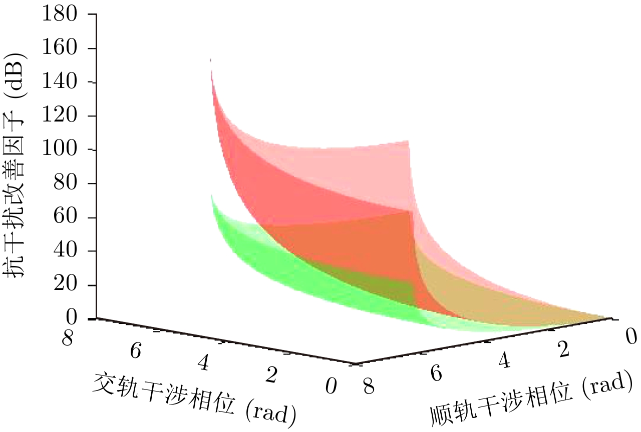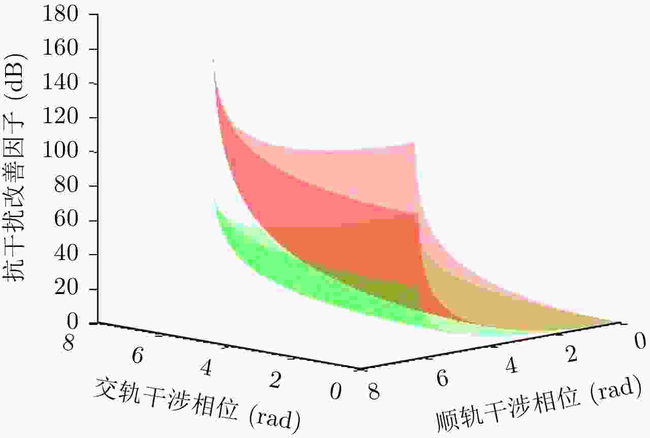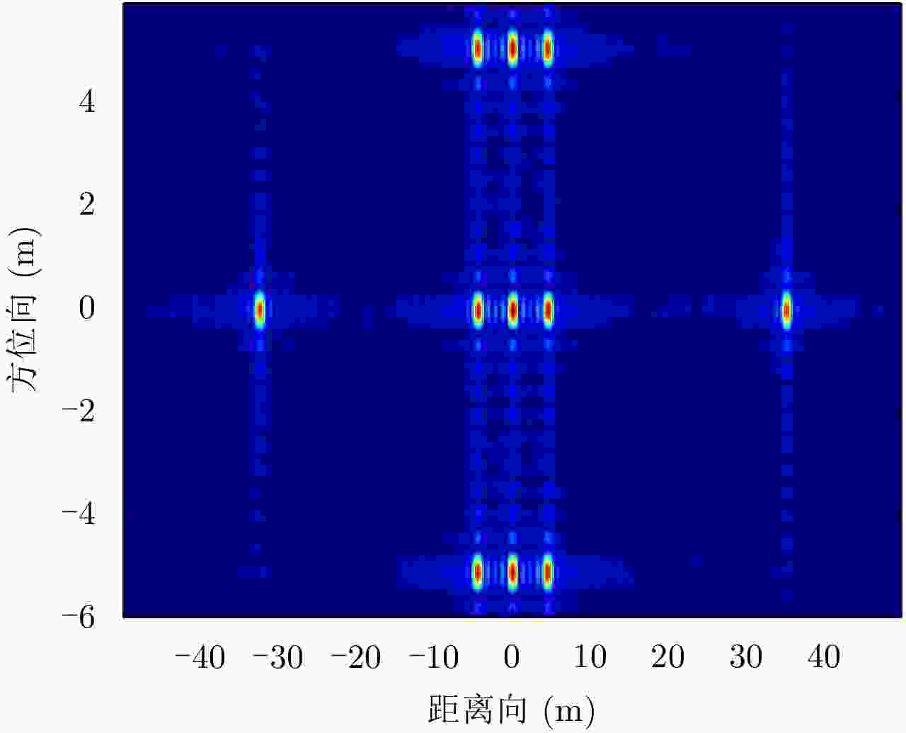 参数 数值 景中心斜距(km) 1.414 雷达有效速度(m/s) 150 发射脉冲时宽(μs) 2.5 距离调频率(Hz/s) 20 × 1012 雷达工作频率(GHz) 5.3 多普勒带宽(Hz) 80 距离采样率(MHz) 60 方位采样率(Hz) 400 回波信噪比(dB) 10 距离基线长度(m) 4 方位基线长度(m) 2 表 2 9点目标交轨干涉相位