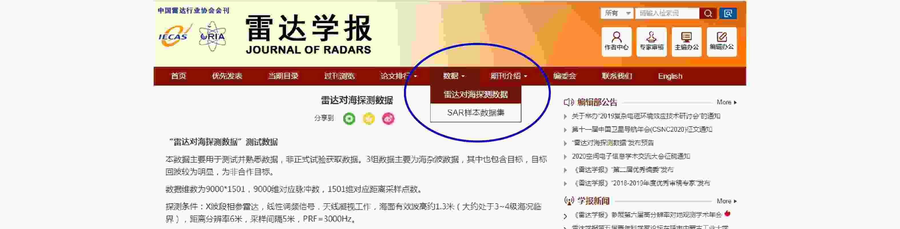 摘要: 针对雷达对海上目标探测技术研究的数据需求以及目前公开的雷达对海探测数据缺乏的问题,该文提出一项“雷达对海探测数据共享计划”,旨在利用X波段固态全相参雷达等多型雷达开展对海探测试验,获取不同海况、分辨率、擦地角条件下目标和海杂波数据,并同步获取海洋气象水文数据、目标位置与轨迹的真实数据,实现雷达实测数据的标准化、规范化管理,推进数据集公开共享,服务于海杂波特性研究,有力地支持海杂波抑制和目标检测技术研究。Abstract: To meet the radar data requirements of target detection technology research and address the lack of publicly available sea-detecting radar data, a data-sharing program for sea-detecting radar is proposed herein. The aim of the proposed data-sharing program is to conduct sea detection experiments using an X-band solidstate phase-coherent radar and other multi-type radars to obtain the target and sea clutter data under different sea conditions, resolutions, and grazing angles. Moreover, the marine meteorological and hydrological data, target position, and track data are simultaneously obtained using the proposed data-sharing program to help achieve the standardized management of radar-measured data. The proposed data-sharing program aims to promote the open sharing of data sets, serve as the basis for research on sea clutter characteristics, and facilitate the research on sea clutter suppression and target detection technology.