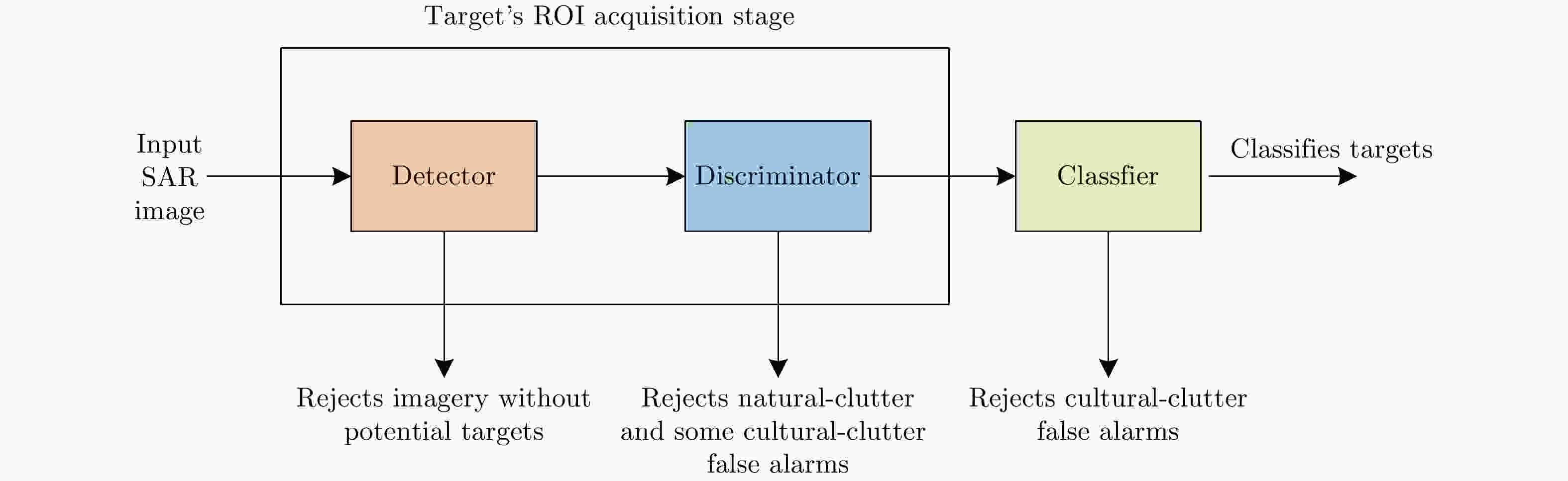 摘要: SAR作为一种主动式微波成像传感器,以其全天时、全天候、作用距离远等独特的技术优势,成为当前对地观测的主要手段之一,在军事和民用领域发挥着十分重要的作用。随着SAR遥感技术的发展,高分辨率、高质量的SAR图像不断产生,仅依靠人工手段对感兴趣的目标进行检测、识别费时费力,因此亟需发展SAR自动目标识别(ATR)技术。典型的SAR ATR系统主要包括检测、鉴别、分类/识别3个阶段,其中,检测和鉴别阶段是整个SAR ATR系统的基础,是国内外雷达界一直开展的SAR应用基础研究之一。针对单通道SAR图像,简单场景下目标检测与鉴别已经取得了不错的结果;而在复杂场景下,杂波散射强度相对高、杂波背景非均匀和目标散射强度相对弱、分布密集等情况,使得SAR目标检测和鉴别依然是一个难点。该文对近十年左右复杂场景下单通道SAR目标检测及鉴别方法的研究进展进行了归纳总结,并分析了各类方法的特点及存在的问题,展望了未来复杂场景下单通道SAR目标检测与鉴别方法的发展趋势。Abstract: As an active microwave imaging sensor, Synthetic Aperture Radar (SAR) has become one of the main means of Earth observation owing to its unique technical advantages of all-day, all-weather operation and long working distance. As such, it plays a very important role in military and civilian fields. With the development of SAR remote-sensing technology, high-resolution, high-quality SAR images are produced continuously. However, manual detection and recognition of targets of interest is time-consuming and laborious, so the development of Automatic Target Recognition (ATR) technology is a matter of urgency. The typical SAR ATR system primarily comprises three stages: detection, discrimination, and classification/recognition. The detection and discrimination stages are the basis of the SAR ATR system, and research on SAR applications in the radar field has been conducted by researchers around the world. For single-channel SAR images, target detection and discrimination from simple scenes yield good results. However, in complex scenes, the clutter scattering intensity is relatively high, the clutter background is heterogenous, the target scattering intensity is relatively weak, and the target distribution is dense. These factors continue to make accurate SAR target detection and discrimination difficult. In this paper, we summarize the recent research progress on single-channel SAR target detection and discrimination methods for complex scenes, analyze the characteristics and problems associated with various methods, and consider the future development trend of single-channel SAR target detection and discrimination methods for complex scenes.