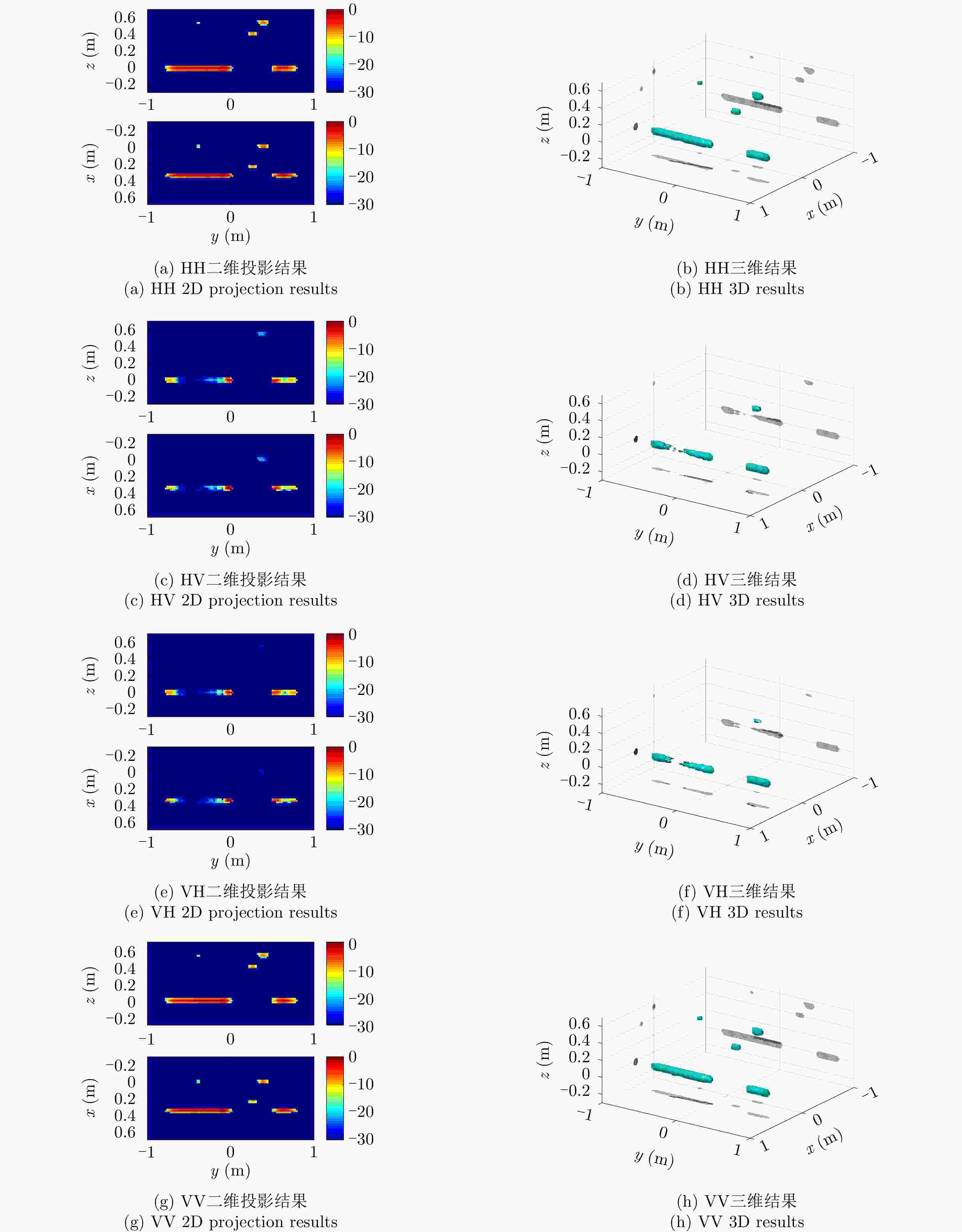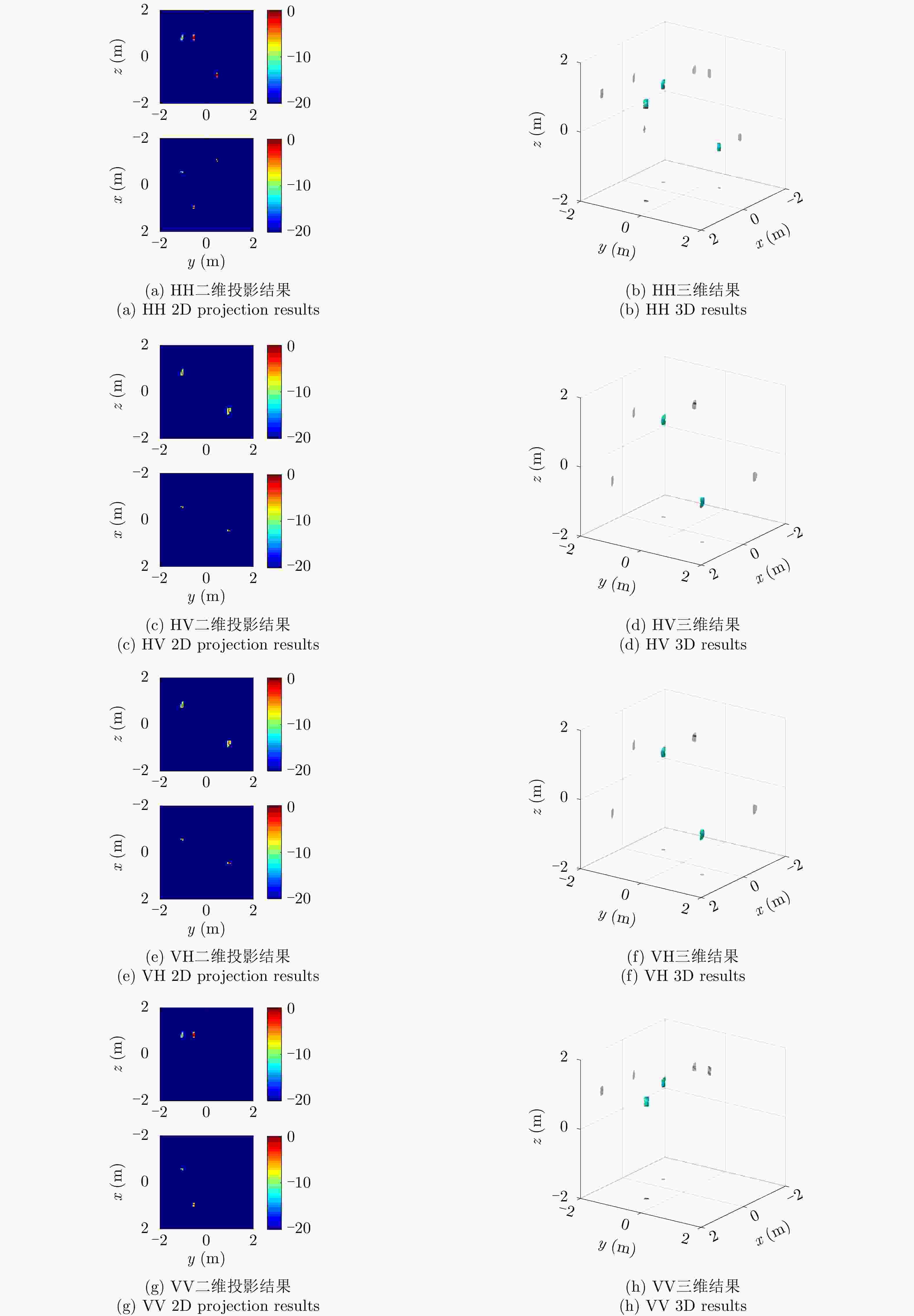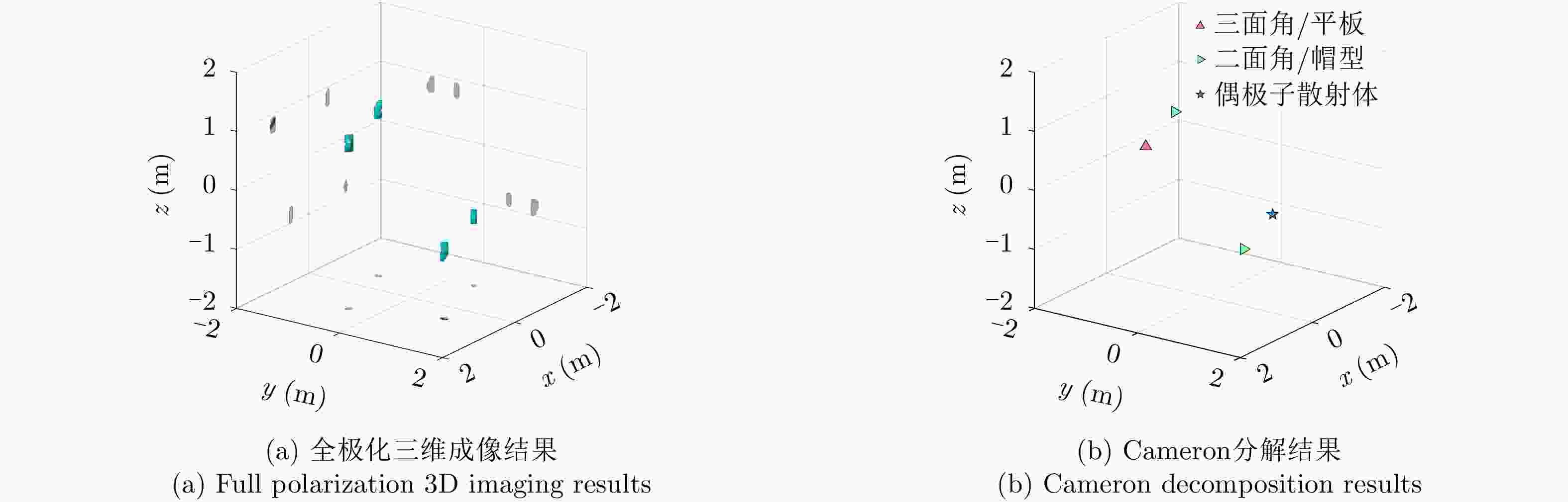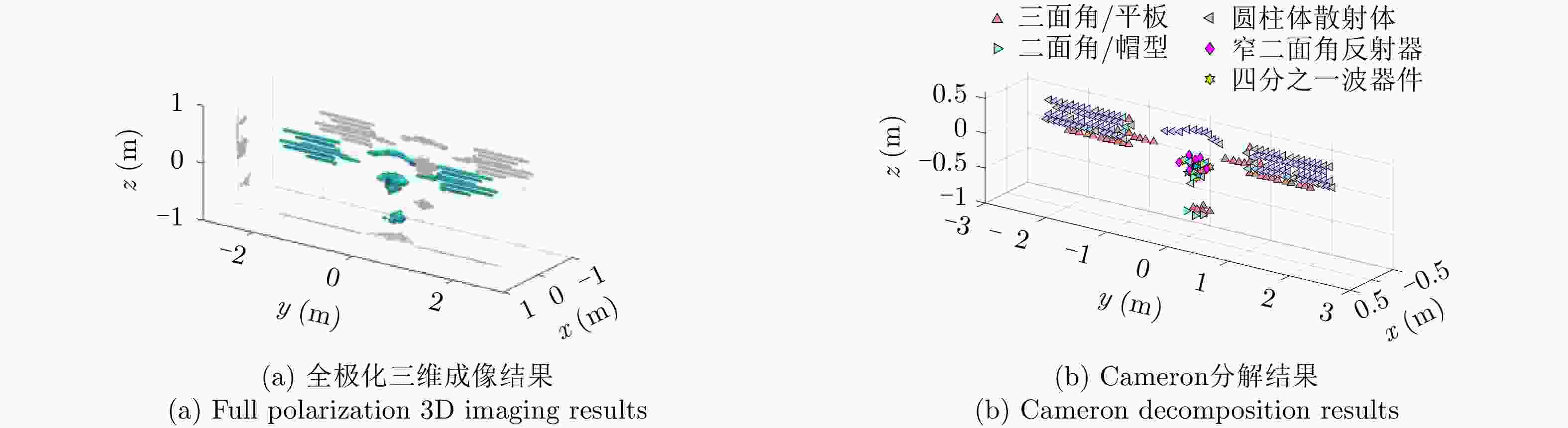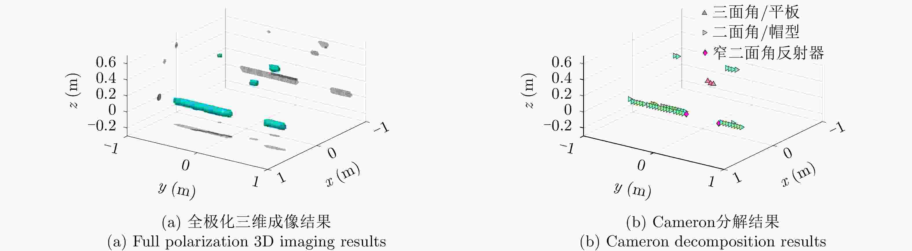 类型 散射矩阵 幅度 位置 三面角 $\left[ {\begin{array}{*{20}{c}} 1&0 \\ 0&1 \end{array}} \right]$ 1 $x = 1.0\,{\rm{m} },y = - 0.5\,{\rm{m} },z = 0.7\,{\rm{m} }$ 偶极子 $\left[ {\begin{array}{*{20}{c}} 1&0 \\ 0&0 \end{array}} \right]$ 1 $x = - 1.0\,{\rm{m} },y = 0.5\,{\rm{m} },z = - 0.7\,{\rm{m} }$ 30°二面角 $\left[ {\begin{array}{*{20}{c}} {0.5}&{0.866} \\ {0.866}&{ - 0.5} \end{array}} \right]$ 1 $x = - 0.5\,{\rm{m} },y = - 1.0\,{\rm{m} },z = 0.7\,{\rm{m} }$ 45°二面角 $\left[ {\begin{array}{*{20}{c}} 0&1 \\ 1&0 \end{array}} \right]$ 1 $x = 0.5\,{\rm{m} },y = 1.0\,{\rm{m} },z = - 0.7\,{\rm{m} }$ 表 3 目标的仿真参数