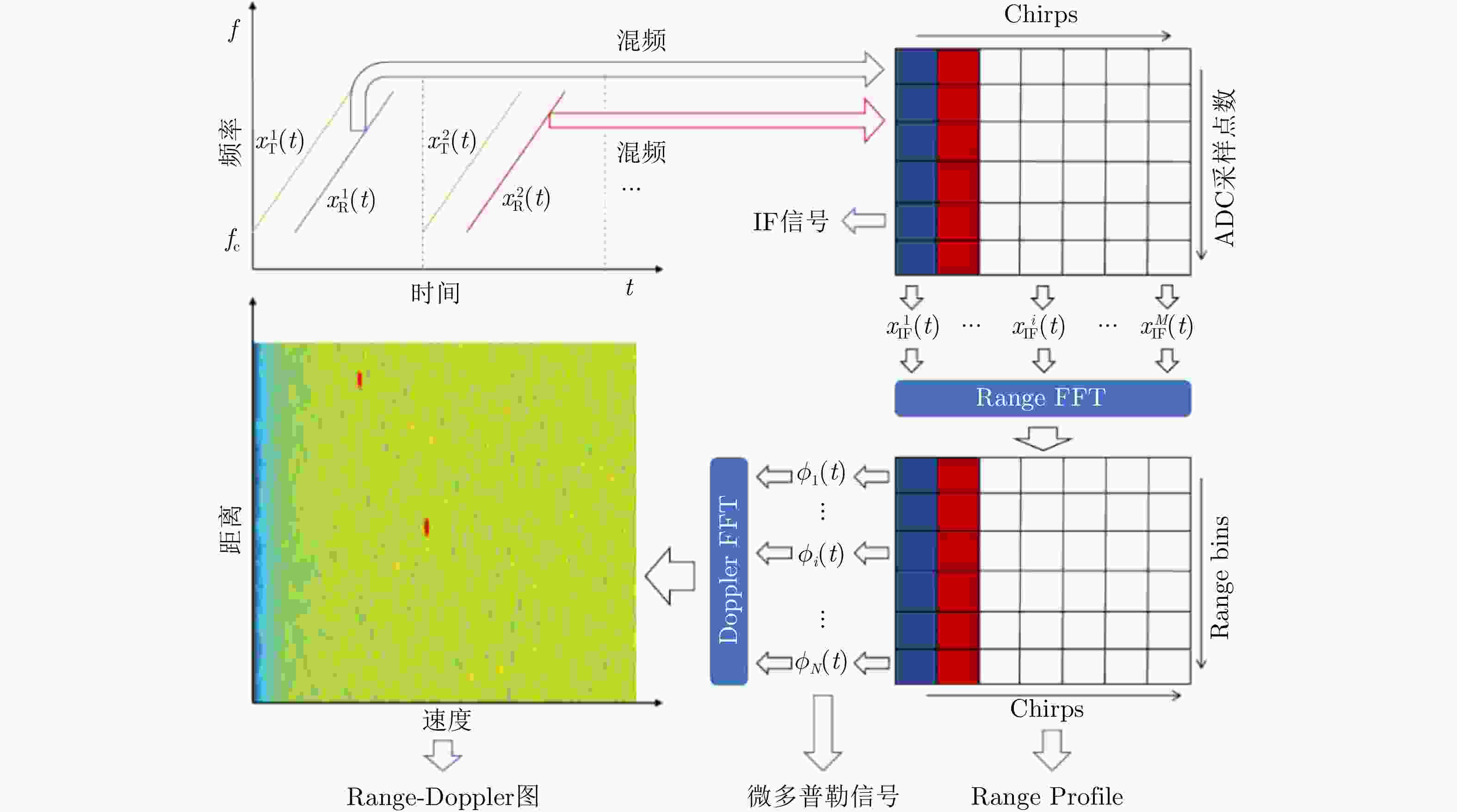 图 1 基于FMCW雷达的接收信号提取微多普勒信号与计算Range-Doppler图的信号处理流程。其中多个Chirp的IF信号经过FFT变换后得到的二维矩阵称为Range Profile