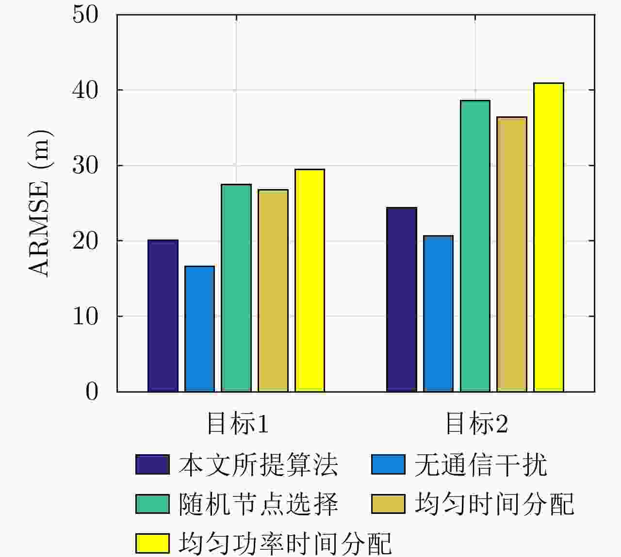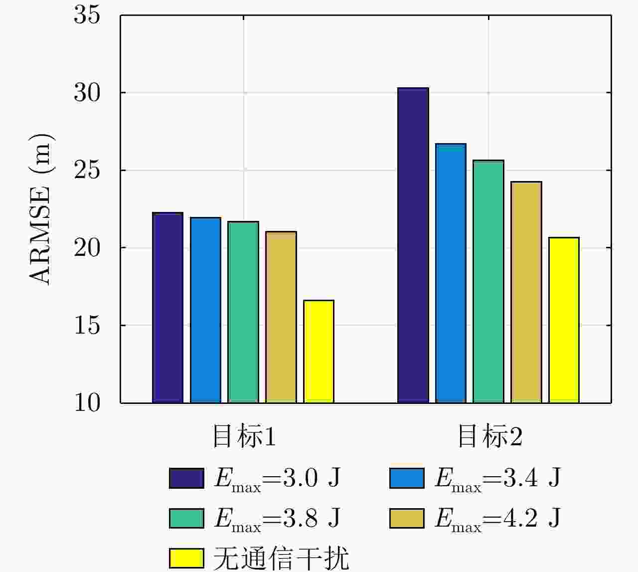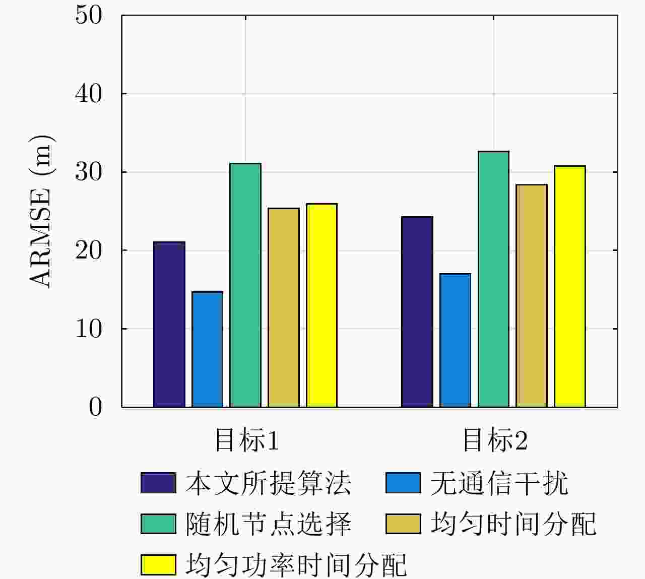 参数 数值 参数 数值 $ {G_{\text{t}}} $ $ 36{\text{ dB}} $ $ \beta $ $ 1{\text{ MHz}} $ $ {G_{\text{r}}} $ $ 35{\text{ dB}} $ $ {F_{\text{r}}} $ $ 3{\text{ dB}} $ $ {G_{{\text{RP}}}} $ $ 45 $ k $1.38 \times {10^{ - 23} }\;{ {\text{J} } \mathord{\left/ {\vphantom { {\text{J} } {\text{K} } } } \right. } {\text{K} } }$ $ {P_{\min }} $ $ 100{\text{ W}} $ $ {P_{\max }} $ $ 600{\text{ W}} $ ${T_{ {\text{min} } } }$ $ 0.01{\text{ s}} $ $ {T_{\max }} $ $ 0.08{\text{ s}} $ $ {P_{{\text{total}}}} $ $ 700{\text{ W}} $ $ {T_{{\text{total}}}} $ $ 0.1{\text{ s}} $ -