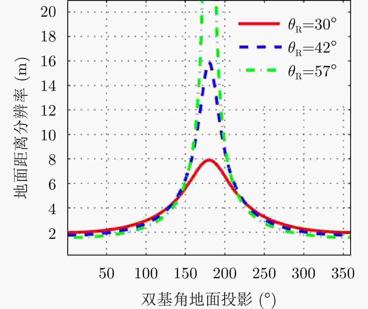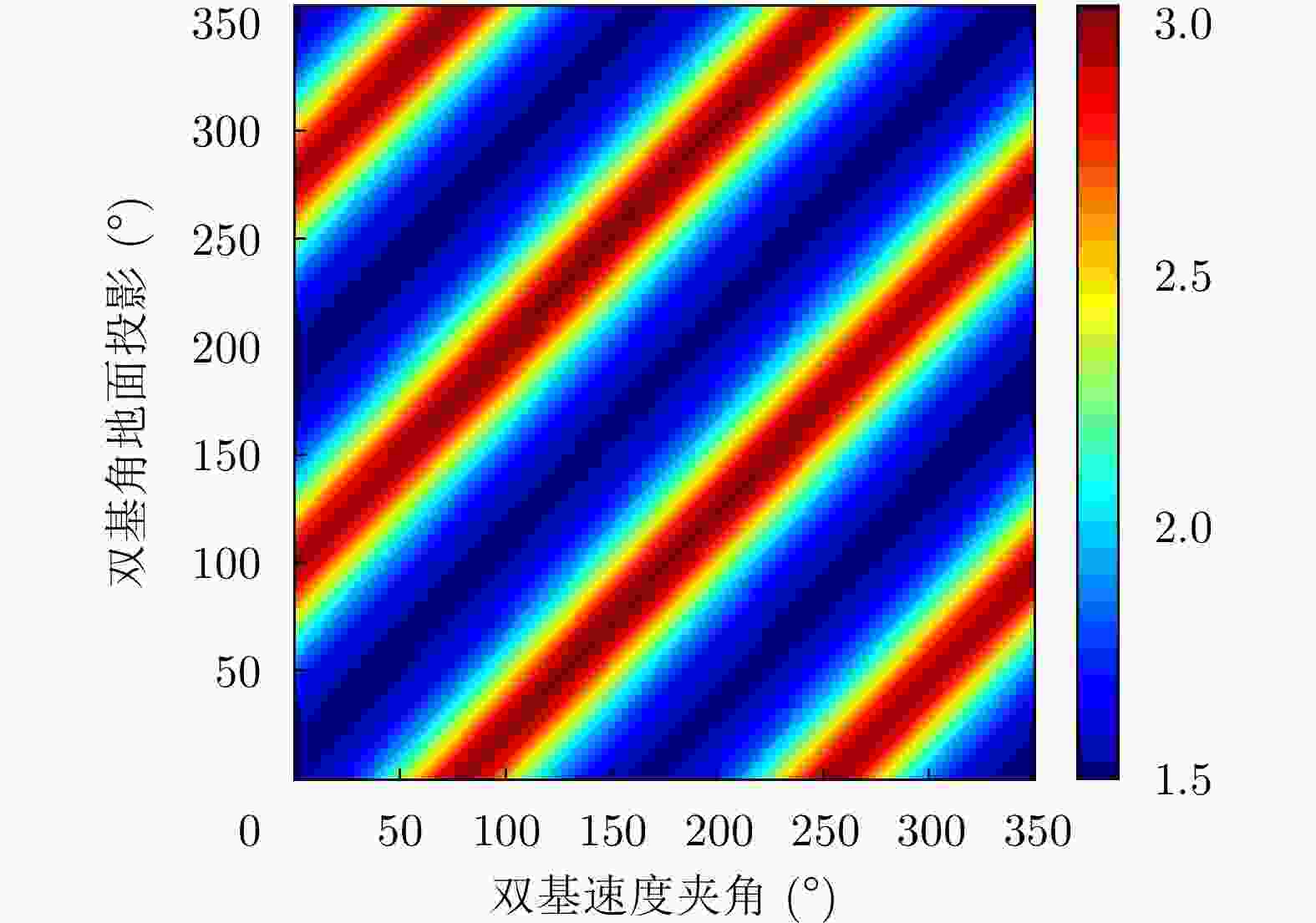 系统参数 数值 平台参数 数值 载频 1.25 GHz GEO轨道离心率 0.07 带宽 100 MHz GEO轨道倾角 53° 峰值功率 5 kW GEO半长轴长度 42164.17 km 发射天线增益 50 dB 接收站速度 200 m/s 接收天线增益 20.8 dB 接收站高度 10 km 表 2 星源照射双/多基SAR典型系统/试验介绍