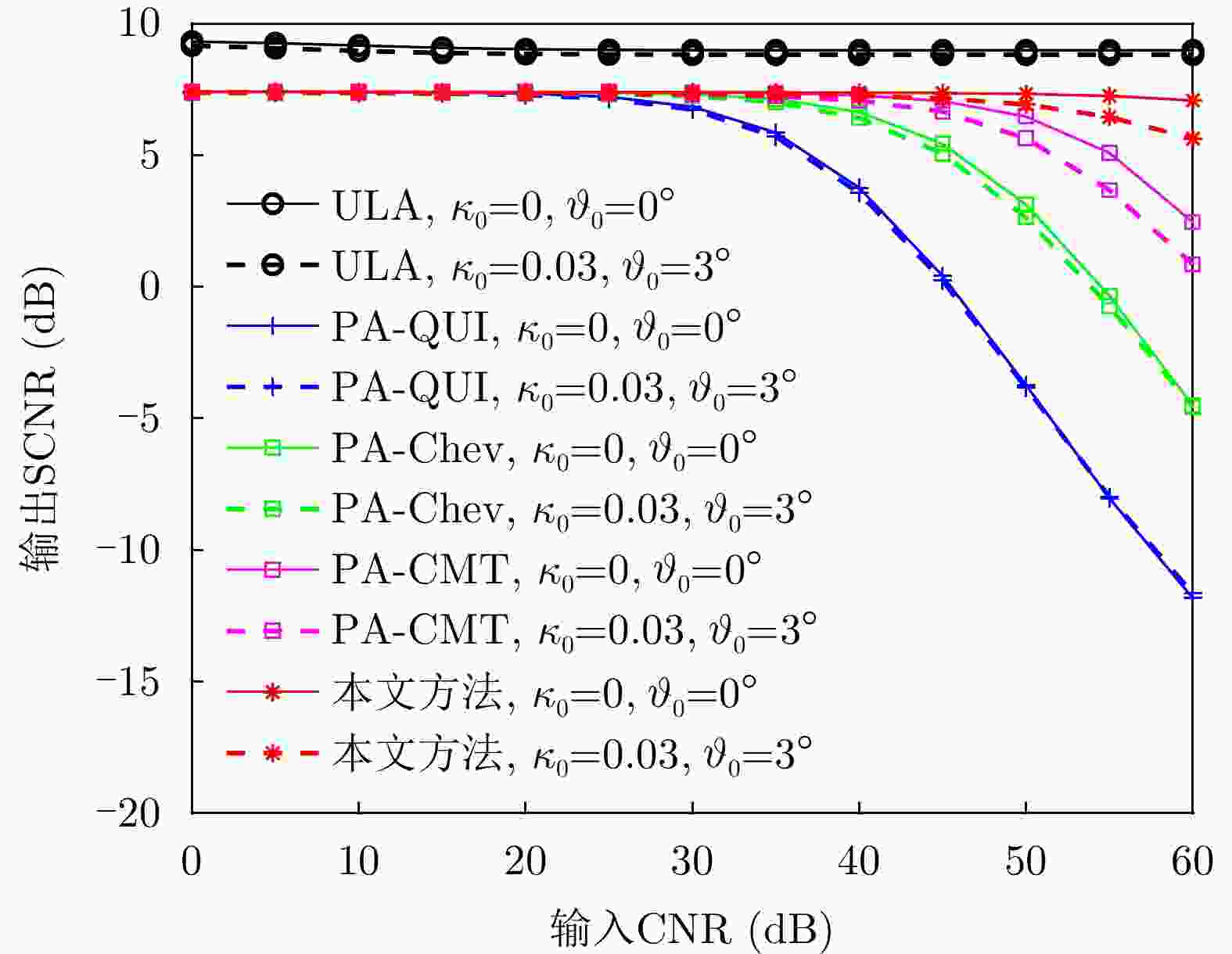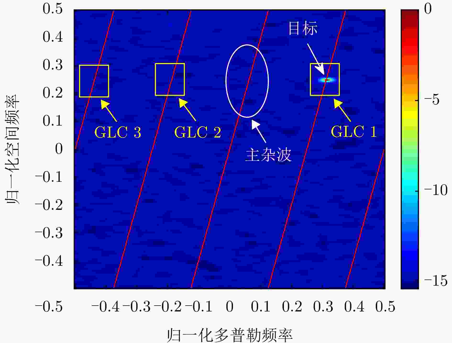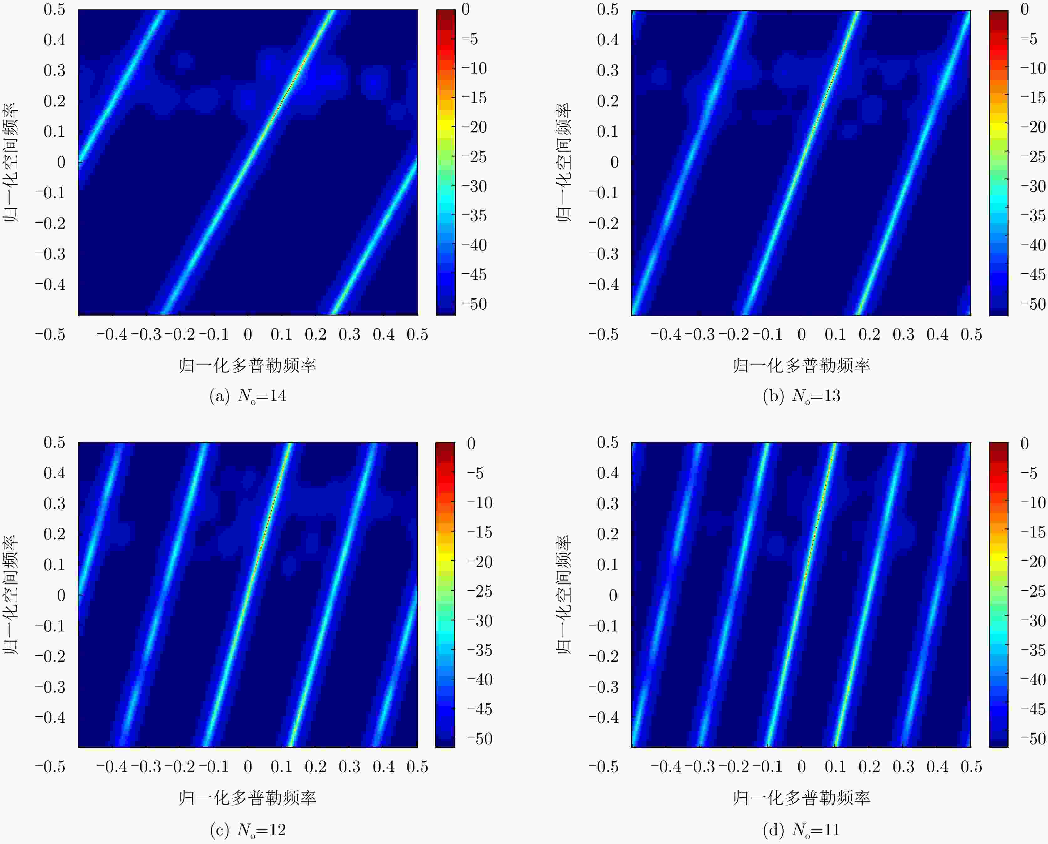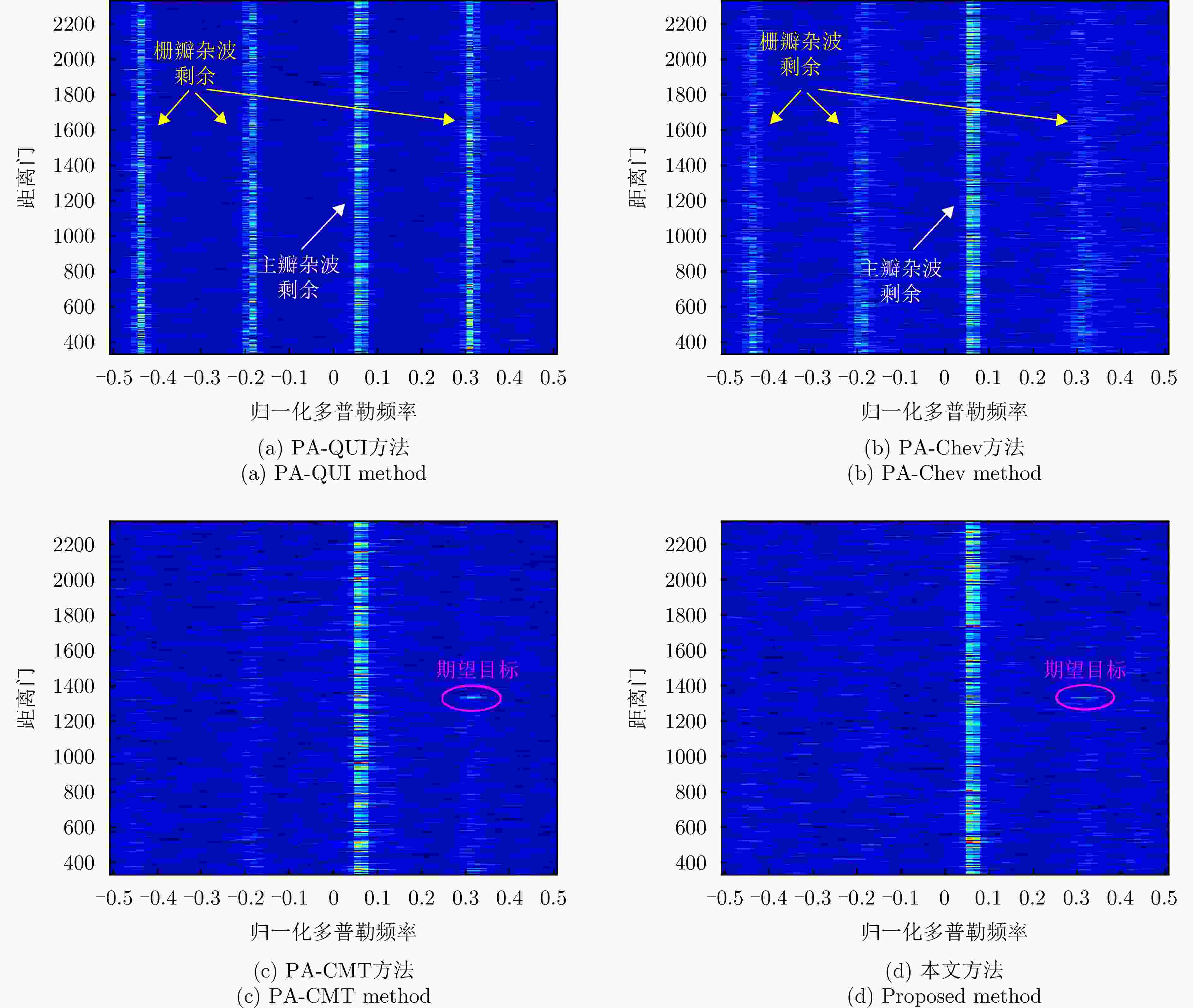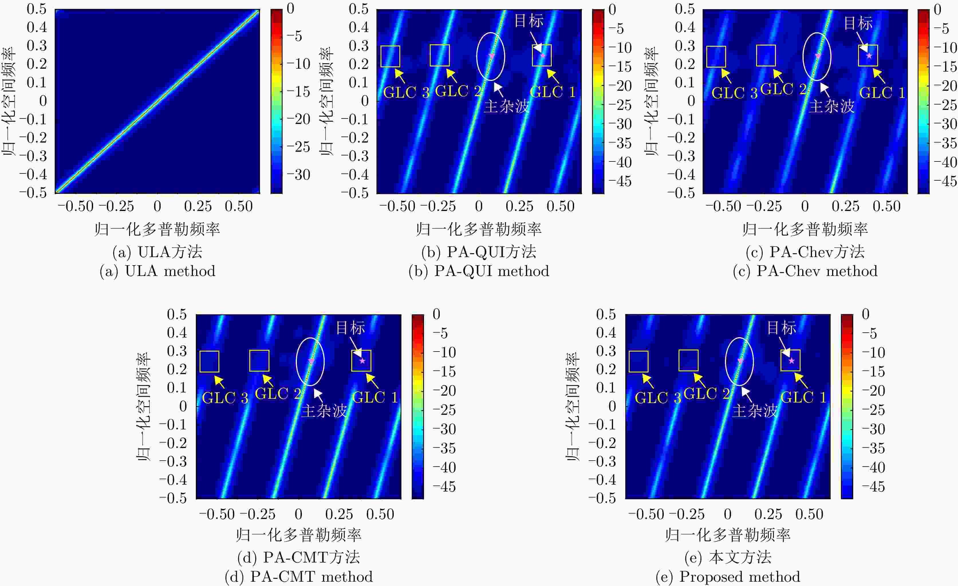 参数 数值 参数 数值 阵元总数 52 子阵数 10 子阵内阵元数 16 重叠阵元数 12 脉冲数 16 工作载频 1.2 GHz 波长 0.25 m 脉冲重频 2 kHz 信号带宽 5 MHz 平台高度 10 km 平台速度 125 m/s 目标方位角 82.79° 目标俯仰角 4.99° 目标斜距 115 km 空间频率展宽 0.1 多普勒滤波器带宽 0.06 幅度误差 0.03 相位误差 3° 信噪比 –5 dB 杂噪比 50 dB -