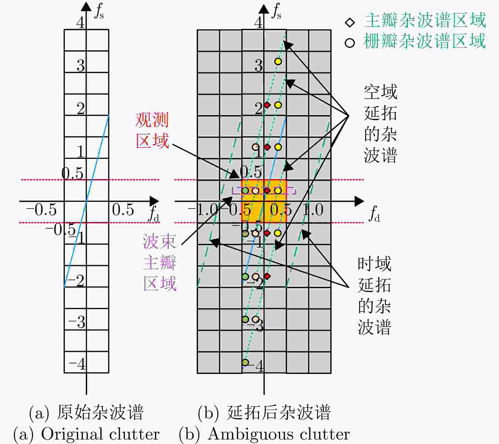 摘要: 机载雷达接收端采用子阵处理时面临栅瓣杂波导致的复杂空时耦合分布,使主瓣波束方向存在多个由栅瓣杂波导致的检测性能凹口,目标检测性能恶化严重。针对此问题,该文首先分析了子阵处理中栅瓣杂波空时谱分布特性,并在此基础上提出了基于接收子阵波束设计的空时二维杂波抑制方法。该方法采用重叠子阵构型方案,通过子阵方向图设计形成在子阵间栅瓣区域处的宽凹口,实现对子阵间栅瓣区域杂波的预滤波。进一步构建子阵级空时处理器,由于栅瓣杂波已经在子阵内完成预滤波,避免了栅瓣杂波在空时二维平面上的耦合扩散,从而提高了杂波抑制和动目标检测性能。仿真结果表明,所提方法显著改善了栅瓣杂波区的输出信杂噪比损失性能。Abstract: Airborne radar receivers that utilize subarray processing face challenges owing to the complex space-time coupling distribution caused by grating-lobe clutter. This results in multiple performance notches in the main beam, which severely affects target detection performance. To address this issue, we analyze the characteristics of grating-lobe clutter distribution in subarray processing and propose an approach for space-time clutter suppression based on the design of a receiving subarray beam pattern. Our approach leverages an overlapping subarray scheme to form wide nulls in the regions between subarrays where grating-lobe clutter is prevalent through beam pattern design. This design facilitates grating-lobe clutter pre-filtering between subarrays. Furthermore, we develop a subarray-level space-time processor that avoids the grating-lobe clutter coupling diffusion in the space-time two-dimensional plane by performing clutter pre-filtering within each subarray. This strategy enhances clutter suppression and moving-target-detection capabilities. Simulation results verify that the proposed method can remarkably improve the output signal to clutter plus noise ratio loss performance in grating-lobe clutter regions.