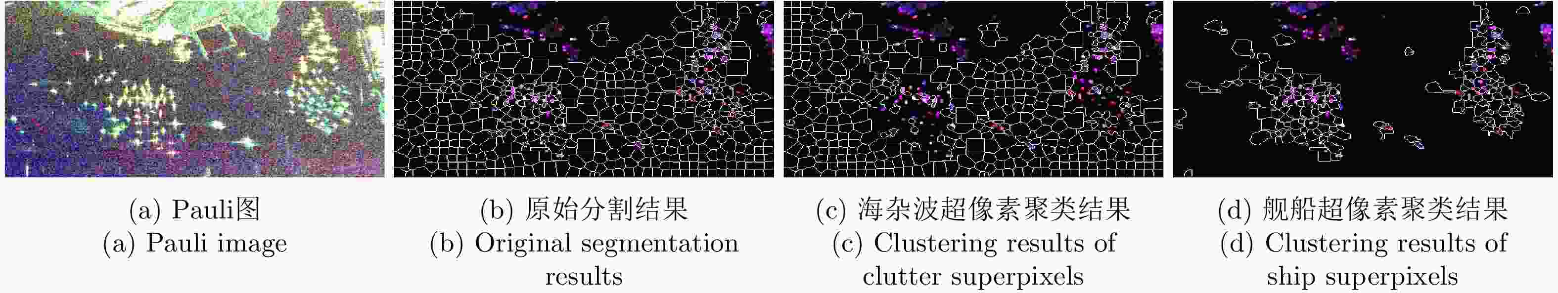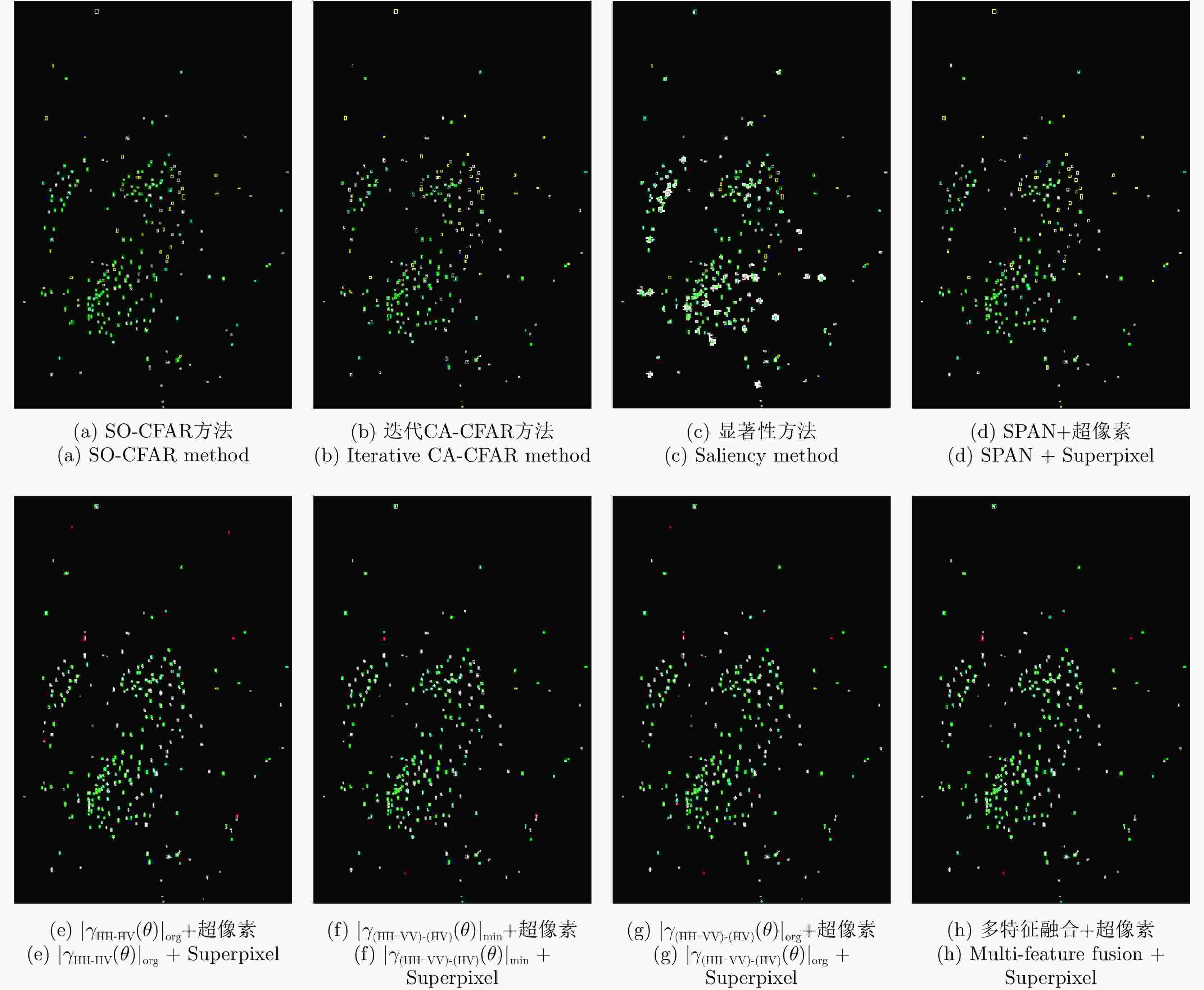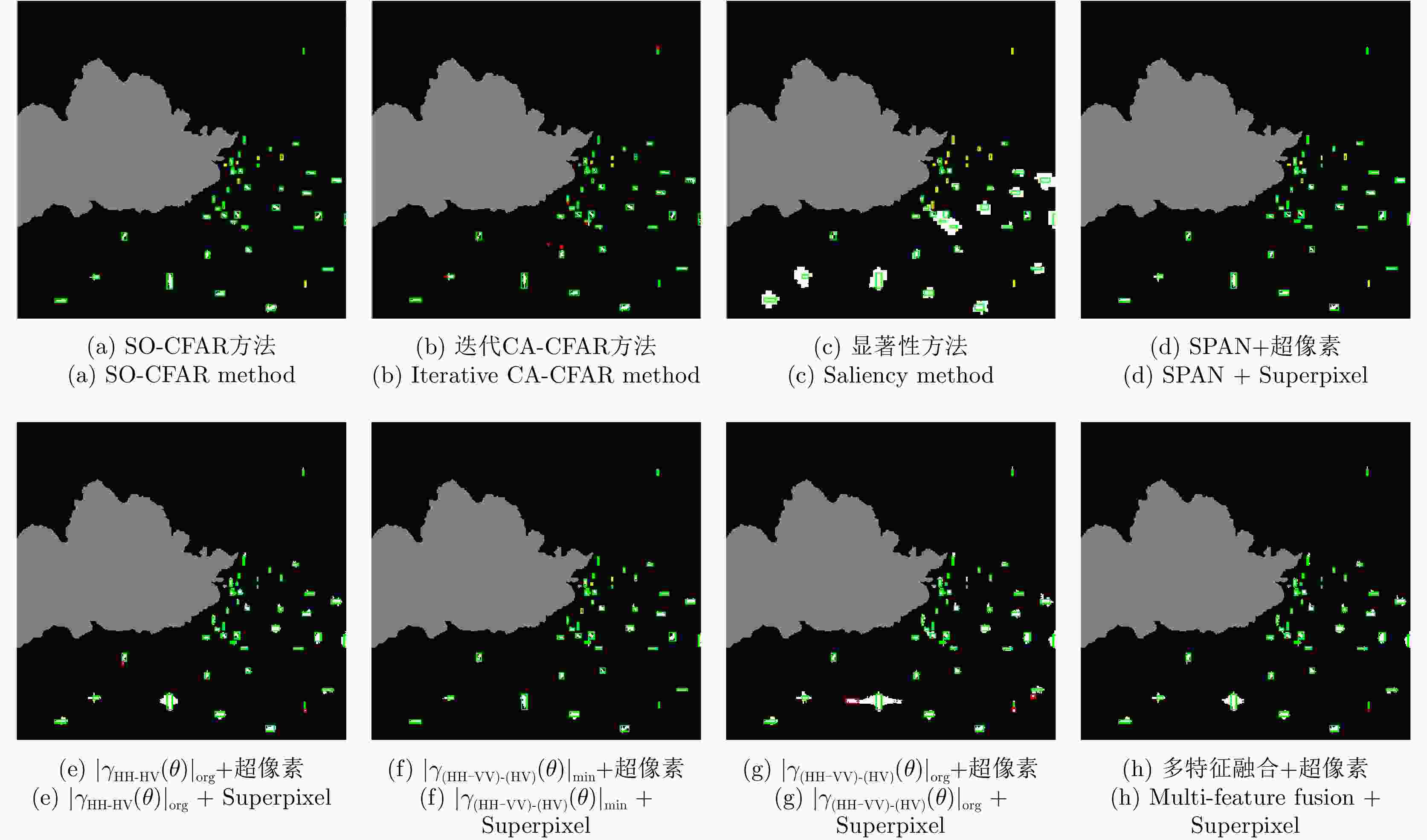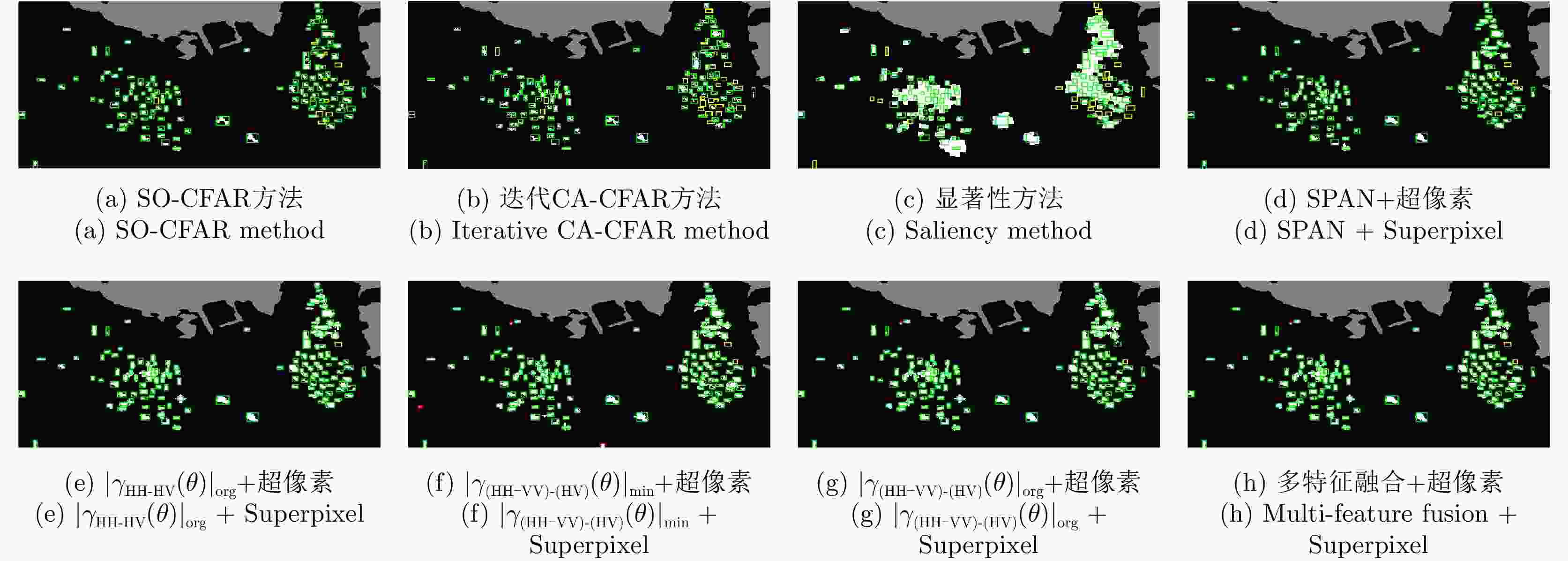 方法 ${N_{\rm{C}}}$ ${N_{\rm{M}}}$ ${N_{{\rm{FA}}}}$ FoM (%) SO-CFAR方法[38] 38 6 1 84.44 迭代CA-CFAR方法[40] 41 3 6 82.00 显著性方法[12] 31 13 0 70.45 SPAN+超像素 38 6 0 86.36 ${\left| { {\gamma _{ {\rm{HH\text{-}HV} } } }(\theta )} \right|_{ {\rm{org} } } }$+超像素 44 0 2 95.65 ${\left| { {\gamma _{ {\rm{(HH-VV)\text{-}(HV)} } } }(\theta )} \right|_{ {\rm{min} } } }$+超像素 41 3 0 93.18 ${\left| { {\gamma _{ {\rm{(HH-VV) \text{-}(HV)} } } }(\theta )} \right|_{ {\rm{org} } } }$+超像素 43 1 3 91.49 多特征融合+超像素 44 0 1 97.78 -