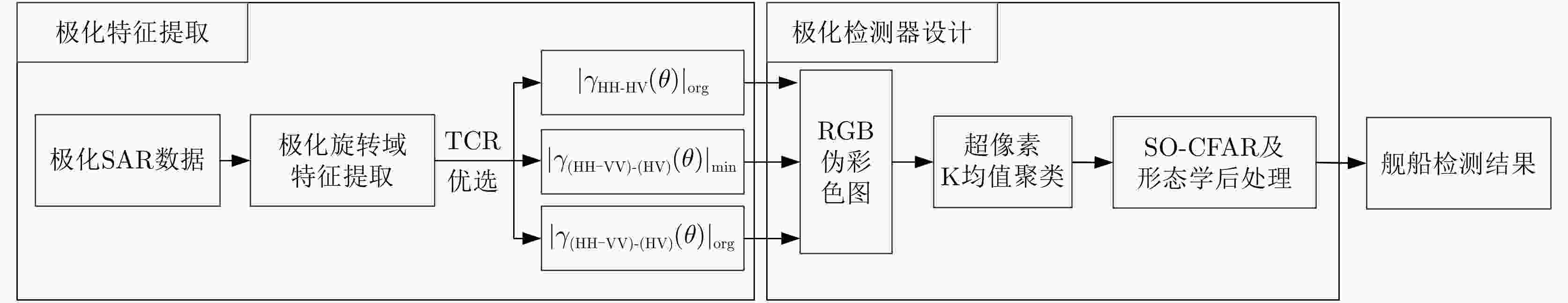 摘要: 对海监视是极化SAR的重要应用,密集区域的舰船目标检测是当前面临的主要挑战之一。舰船密集区域受多目标串扰,传统的恒虚警率(CFAR)检测滑窗难以选取纯净的海杂波样本用于确定检测门限,将导致检测性能下降。针对这一问题,该文从特征提取和检测器设计两方面出发,提出一种融合极化旋转域特征和超像素技术的极化SAR舰船检测方法。在特征提取方面,雷达目标的后向散射敏感于目标姿态与雷达视线的相对几何关系,由此带来的散射多样性隐含信息可通过极化旋转域分析进行挖掘。该文利用极化相关方向图及导出的一系列极化旋转域特征,根据目标杂波比(TCR)分析,优选TCR最高的3个极化特征量用于构建目标检测器。在此基础上,该文在检测器设计方面提出了一种基于K均值聚类的杂波超像素筛选方法,有效避免了密集区域舰船目标对邻近杂波的影响,基于筛选的杂波像素点得到舰船目标CFAR检测结果。基于Radarsat-2和高分三号星载全极化SAR数据的对比实验表明,所提方法能有效实现密集区域舰船目标检测,检测品质因数达到95%。Abstract: Sea surveillance is an important application of polarimetric Synthetic Aperture Radar (SAR), but ship detection in dense areas remains a major challenge. Due to the crosstalk of multiple targets in dense ship areas, it can be difficult to collect pure sea clutter samples for threshold determination when using the traditional Constant False Alarm Rate (CFAR) moving window, which decreases the detection performance. To address this issue, in this paper, a polarimetric SAR ship detection method is proposed based on polarimetric rotation domain features and superpixel technique, with consideration of both feature selection and detector design. For feature selection, the backscattering of radar targets is sensitive to the relative geometry between the target orientations and the radar line of sight. The information hidden in this scattering diversity can be mined using polarimetric rotation domain analysis, from which the polarimetric correlation pattern and a set of polarimetric rotation domain features are obtained. Target-to-Clutter Ratio (TCR) analysis is conducted, and the three polarimetric features with the highest TCR values are selected for successive target detection. On this basis, a clutter superpixel selection method is developed for detector design based on K-means clustering, which effectively circumvents the influence of dense ship targets on near sea clutter. CFAR ship detection results can be obtained based on the selected clutter samples. Experimental studies on spaceborne Radarsat-2 and GaoFen-3 full polarimetric SAR datasets indicate that, the proposed method can effectively detect dense ship targets with 95% higher figures of merit.