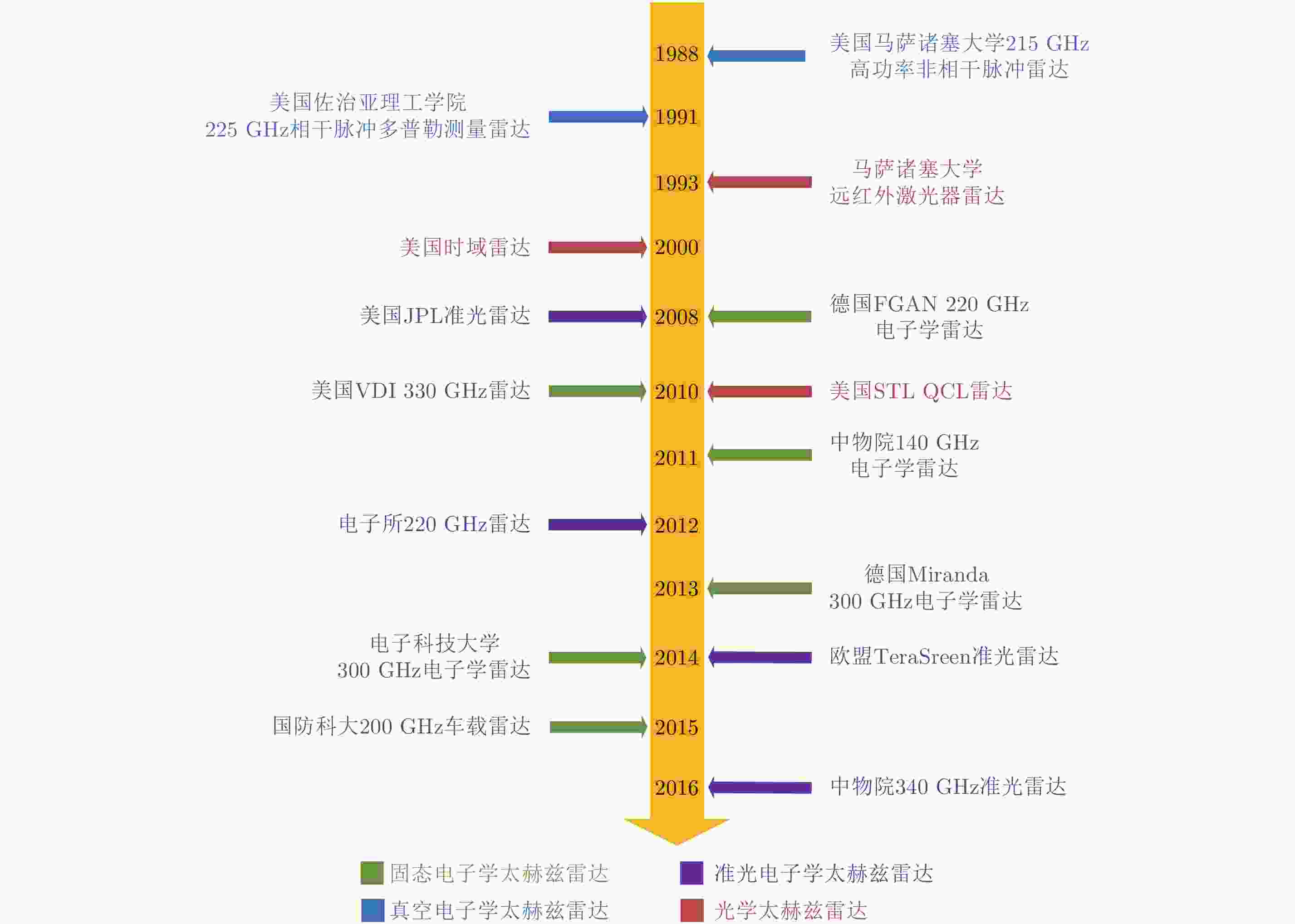 Abstract: Terahertz radar has unique advantages, including large bandwidth, high resolution, Doppler sensitivity, and anti-interference; it is a significant development in the field of target detection. Herein, the history of electronic and optical terahertz radar systems is introduced, and the current situation and latest progress pertaining to these systems are reviewed. The target characteristics of terahertz radar are summarized based on its mechanism, calculation, and measurement. Moreover, the current research status of terahertz SAR, ISAR, array, and aperture encoding imaging are discussed, and the applications of terahertz radar, such as early warning detection and security anti-terrorism systems, are briefly introduced. Finally, the development direction of terahertz radar technology is forecast.-