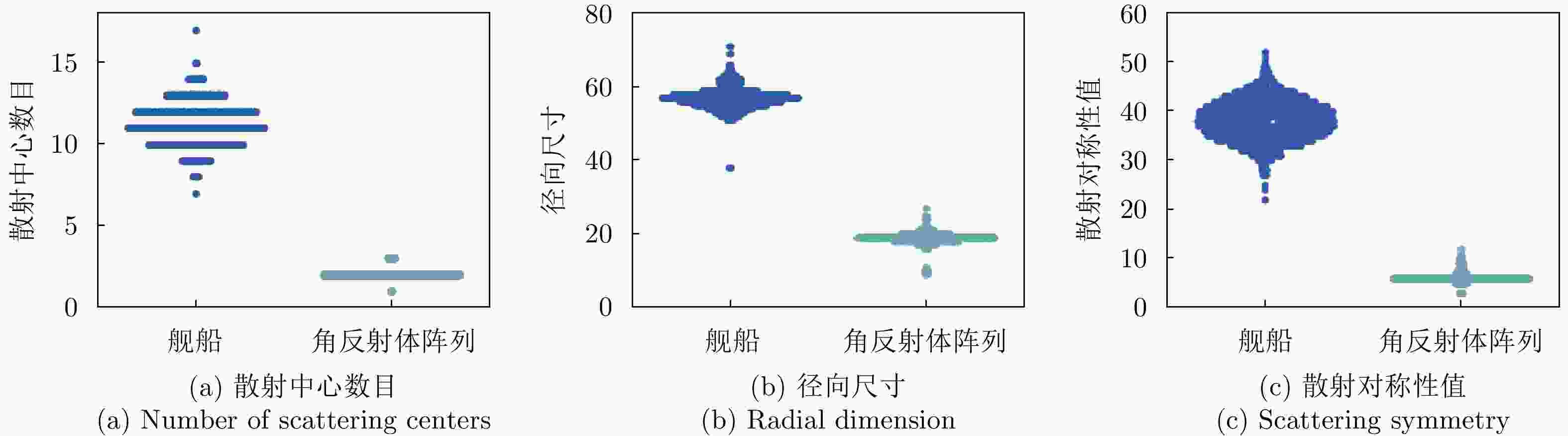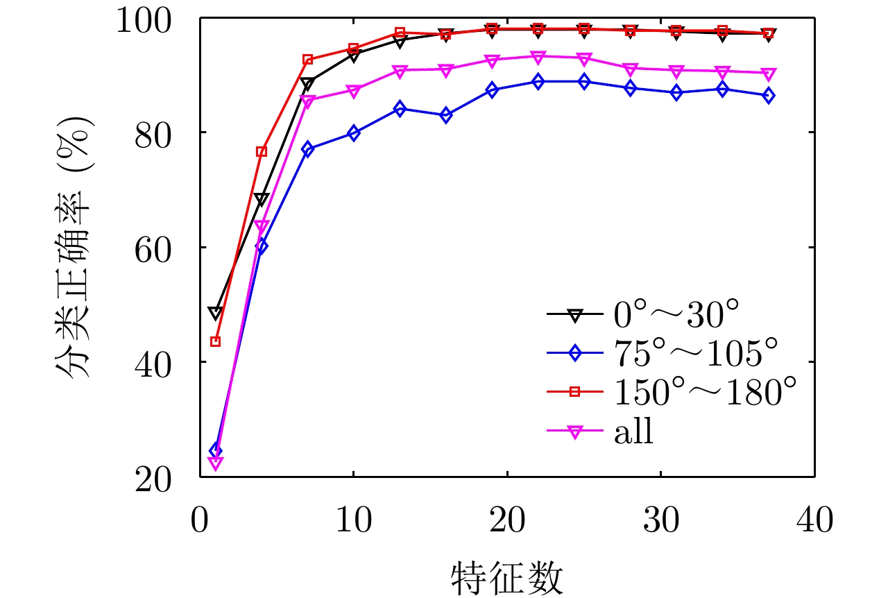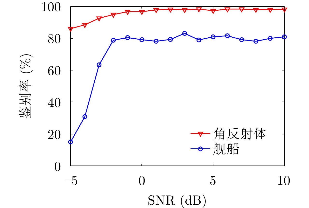 最前端的距离$ {\text{DEP}} = \Delta d \cdot ({m_1} - {n_1}) $ / 散射中心幅值分布熵 ${\text{EA} } = - \displaystyle\sum\limits_{i = 1}^{{\rm{NP}}} { {p_{ {m_i} } } \cdot \ln {p_{ {m_i} } } }$ $ {p_{{m_i}}} $为序号$ {m_i} $的强散射中心幅值 散射中心位置分布熵 ${\text{EP} } = - \displaystyle\sum\limits_{i = 1}^{ {\rm{NP} } } { { m'_i} \cdot \ln { m'_i} }$ $ {m'_i} = {{\left( {{m_i} - {n_1}} \right)} \mathord{\left/ {\vphantom {{\left( {{m_i} - {n_1}} \right)} {\left( {{n_2} - {n_1}} \right)}}} \right. } {\left( {{n_2} - {n_1}} \right)}} $ 散射对称性值 $ {{{\text{SYM}} = \displaystyle\sum\limits_{n = {n_1}}^{{n_0}} {{{\left| {x(n)} \right|}^2}} } \mathord{\left/ {\vphantom {{{\text{SYM}} = \displaystyle\sum\limits_{n = {n_1}}^{{n_0}} {{{\left| {x(n)} \right|}^2}} } {\displaystyle\sum\limits_{n = {n_0}}^{{n_2}} {{{\left| {x(n)} \right|}^2}} }}} \right. } {\displaystyle\sum\limits_{n = {n_0}}^{{n_2}} {{{\left| {x(n)} \right|}^2}} }} $ $ {n_0} = {{({n_1} + {n_2})} \mathord{\left/ {\vphantom {{({n_1} + {n_2})} 2}} \right. } 2} $ 表 2 用于角反射体雷达鉴别的极化特征归纳表