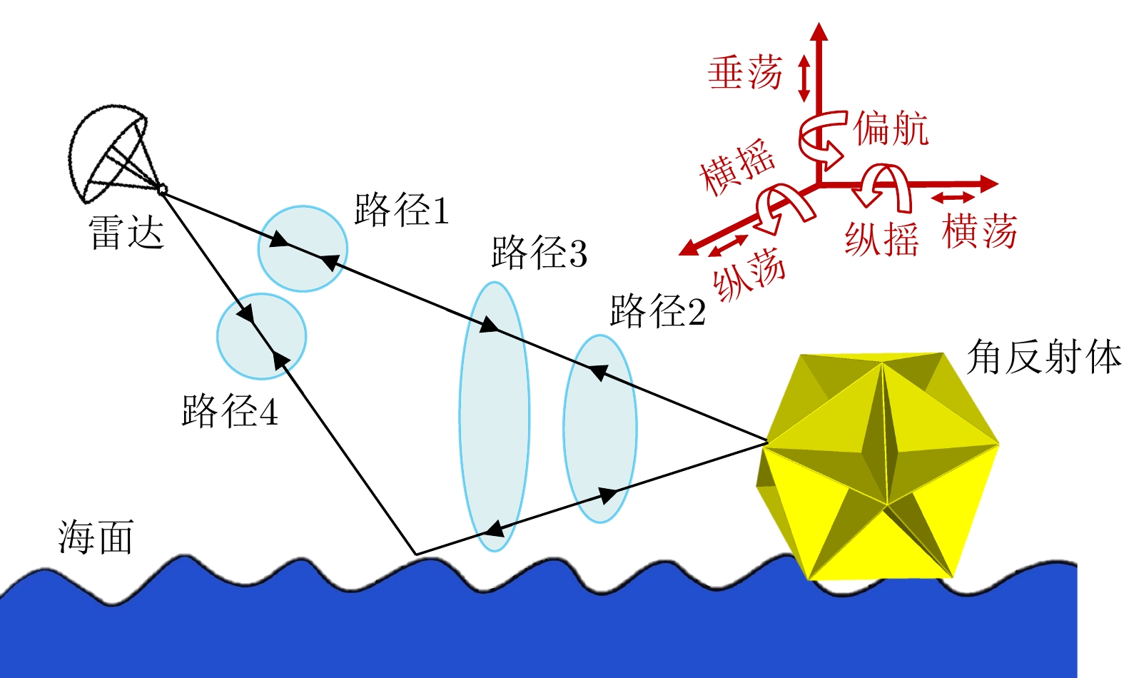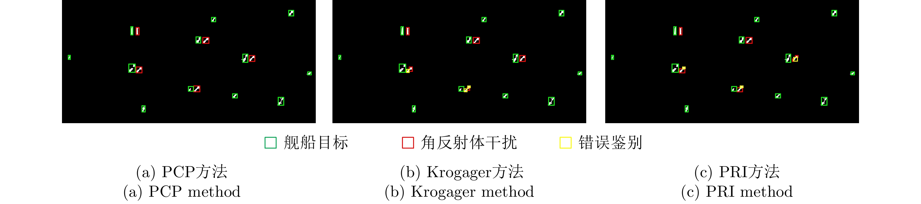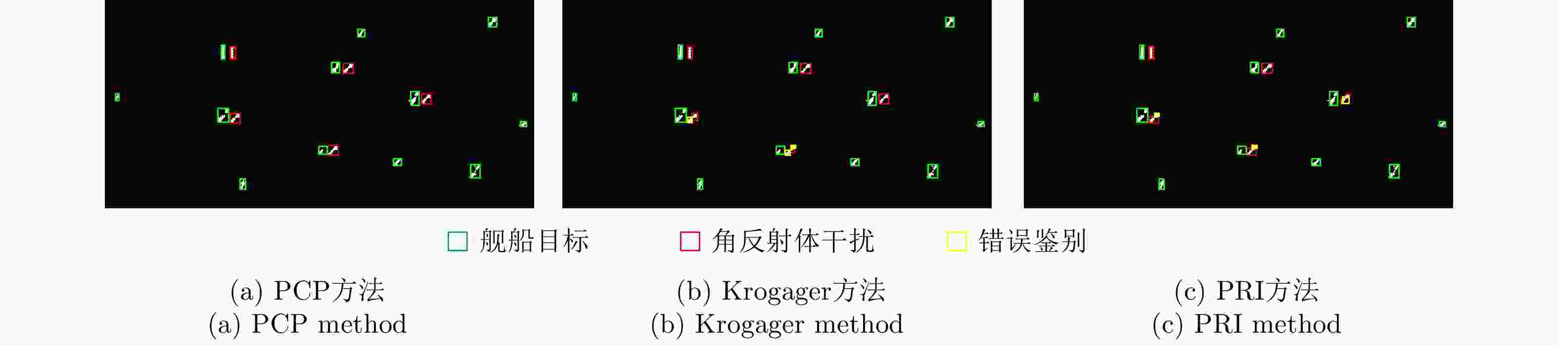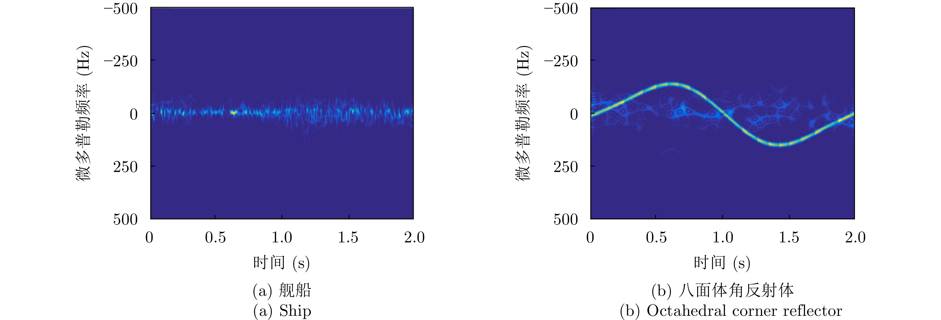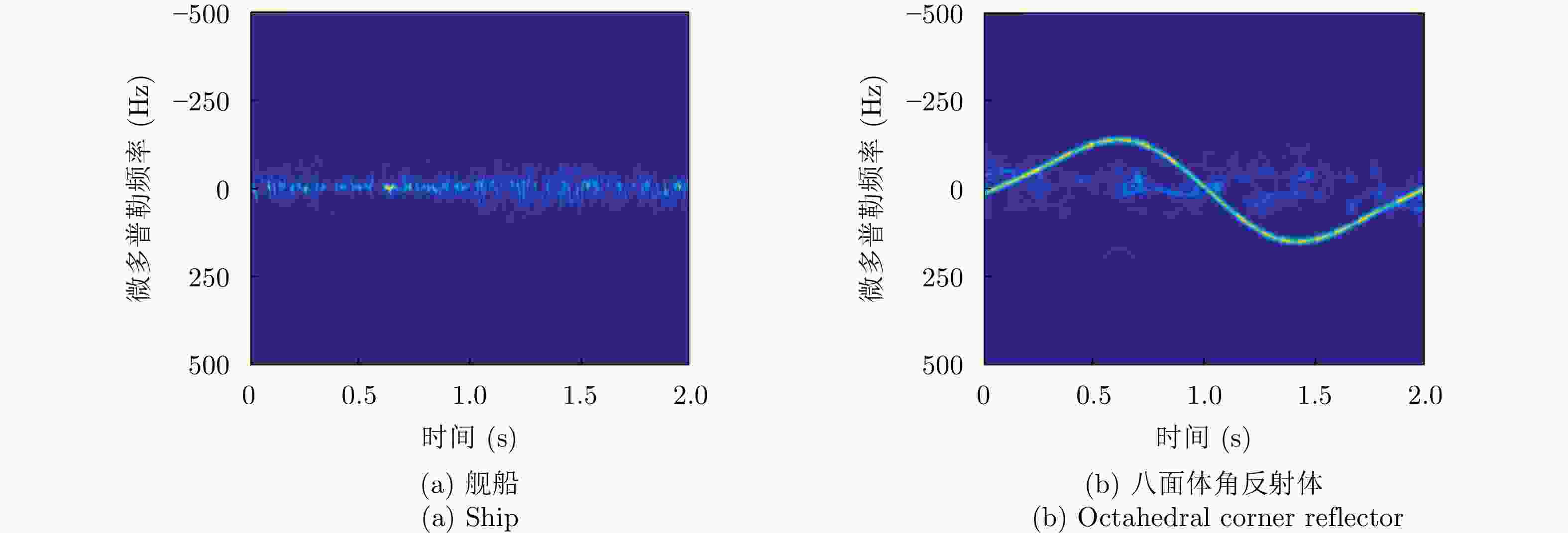 角反鉴别冲淡干扰[37,91] 海面目标和角反射体由于结构和尺寸不同,在微动特征上存在较大差异 对海面强杂波与目标运动变化敏感,对目标微多普勒的观测本身需要的条件苛刻 极化