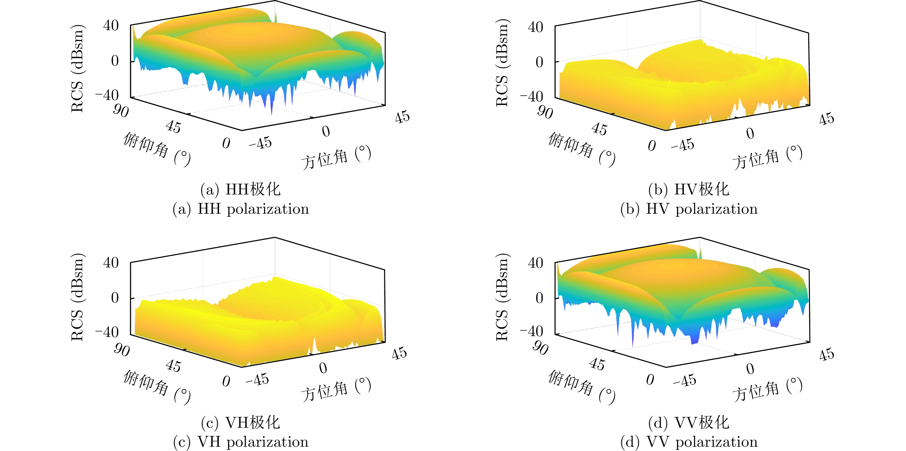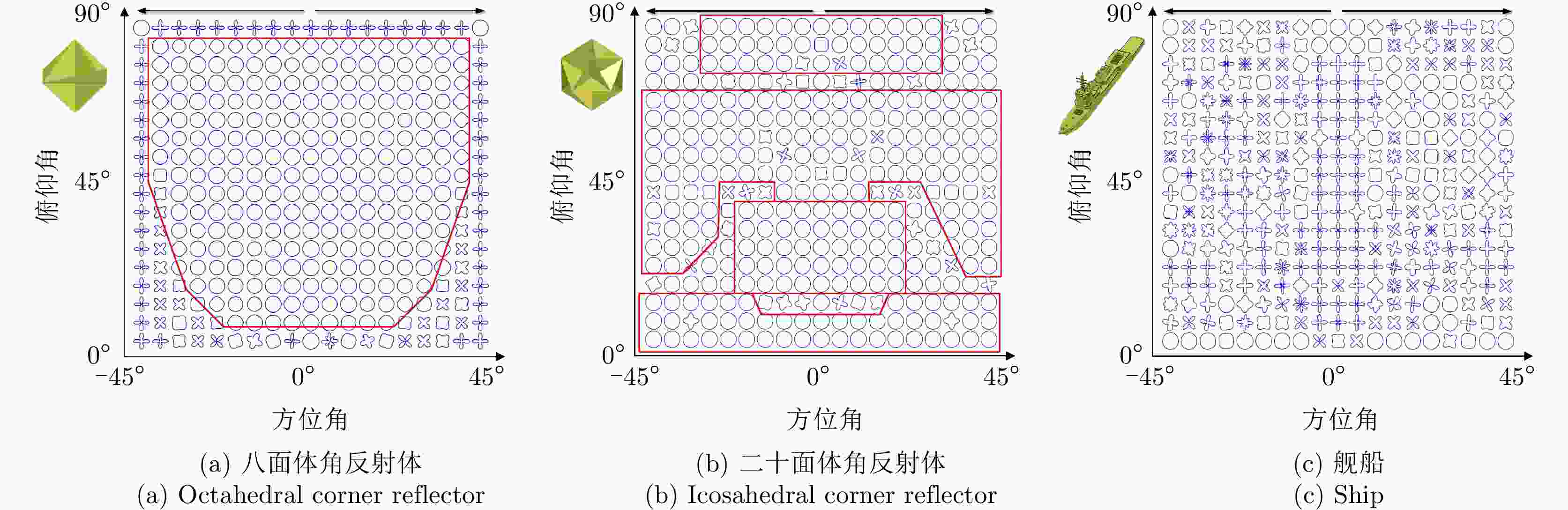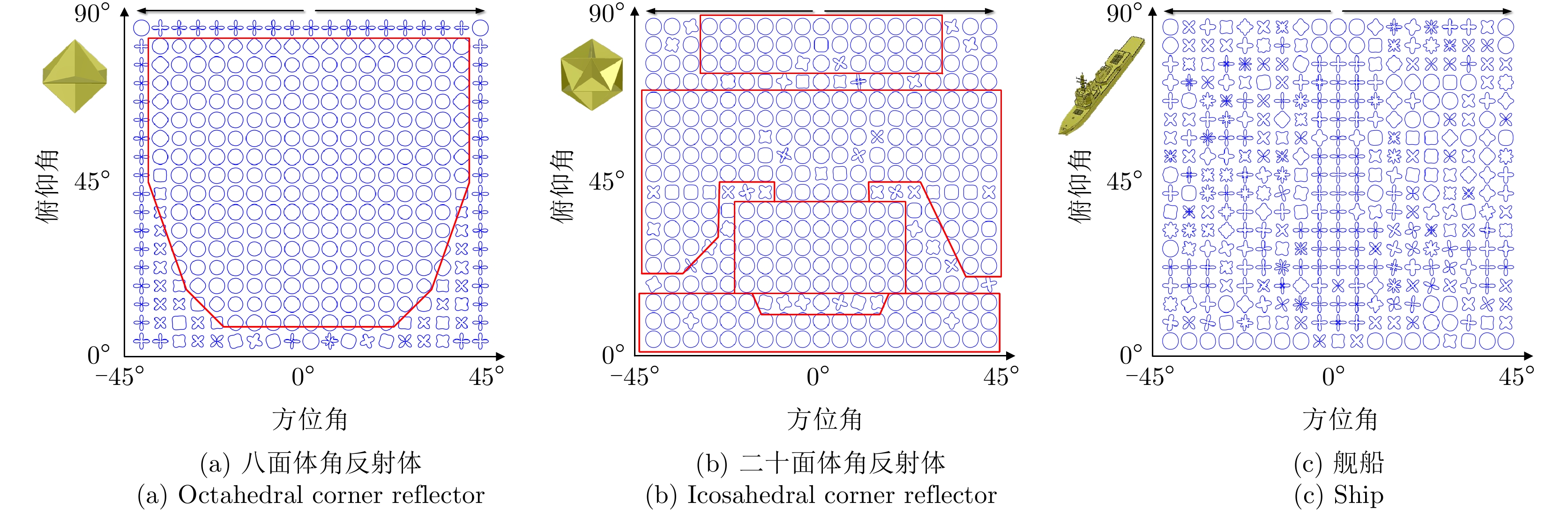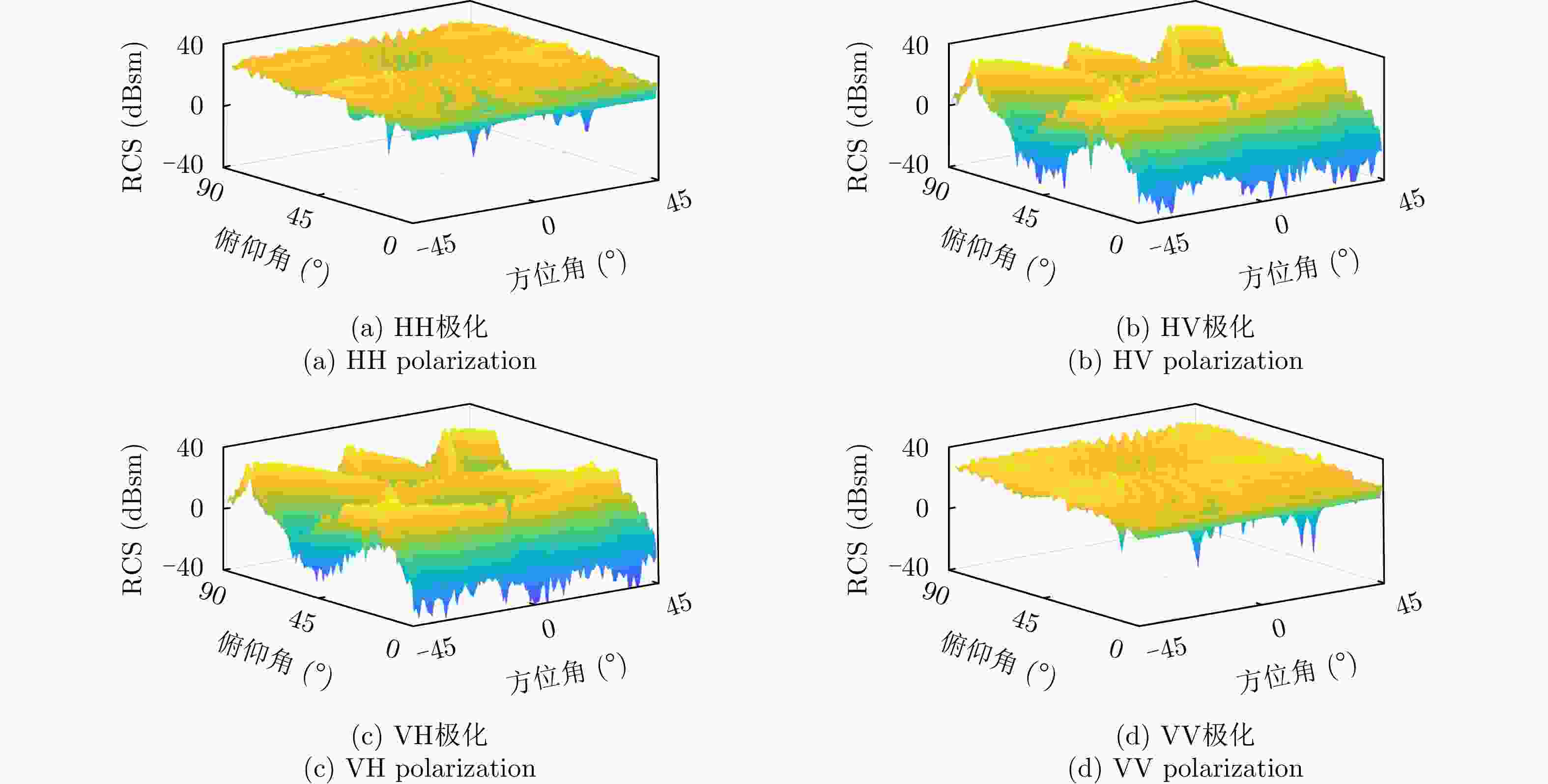 $ {\lambda _i} $为特征值行列式模 $\left| \varDelta \right| = \left| { {S_{ {\text{HH} } } }{S_{ {\text{VV} } } } - {S_{ {\text{HV} } } }{S_{ {\text{VH} } } } } \right|$ / 极化总功率 ${\text{SPAN}} = {\left| {{S_{{\text{HH}}}}} \right|^2} + {\left| {{S_{{\text{HV}}}}} \right|^2} + {\left| {{S_{{\text{VH}}}}} \right|^2} + {\left| {{S_{{\text{VV}}}}} \right|^2}$ / 去极化因子 $ D = 1 - \dfrac{{{{\left| {{S_{{\text{HH}}}} + {S_{{\text{VV}}}}} \right|}^2}}}{{2\left( {{{\left| {{S_{{\text{HH}}}}} \right|}^2} + {{\left| {{S_{{\text{HV}}}}} \right|}^2} + {{\left| {{S_{{\text{VH}}}}} \right|}^2} + {{\left| {{S_{{\text{VV}}}}} \right|}^2}} \right)}} $ / 本征极化方位角 ${\theta _{\rm{d}}} = \dfrac{1}{2}\arctan \dfrac{ {2{{\rm{Re}}} \left( {\tilde S_1^*{ {\tilde S}_{12} } } \right)} }{ { {{\rm{Re}}} \left( {\tilde S_1^*{ {\tilde S}_2} } \right)} }$ $ {\tilde S_1} = {S_{{\text{HH}}}} + {S_{{\text{VV}}}} $, $ {\tilde S_2} = {S_{{\text{HH}}}} - {S_{{\text{VV}}}} $, $ {\tilde S_{12}} = {S_{{\text{HV}}}} $ 本征极化椭圆度 ${\alpha _{\rm{d}}} = \dfrac{1}{2}\arctan \dfrac{ {{\rm{j}}2\tilde S_{12}^\prime } }{ { {S_{ {\text{HH} } } } + {S_{ {\text{VV} } } } } }$ $\tilde S_{12}^\prime = {\tilde S_{12} }\cos \left( {2{\theta _{\rm{d}}} } \right) - \dfrac{1}{2}{\tilde S_2}\sin \left( {2{\theta _{\rm{d}}} } \right)$ 目标纵横比 $\eta = \dfrac{{{{\left| {{S_{{\text{HH}}}}} \right|}^2} + {{\left| {{S_{{\text{HV}}}}} \right|}^2} + {{\left| {{S_{{\text{VH}}}}} \right|}^2} + {{\left| {{S_{{\text{VV}}}}} \right|}^2}}}{{\left| {{S_{{\text{HH}}}}{S_{{\text{VV}}}} - {S_{{\text{HV}}}}{S_{{\text{VH}}}}} \right|}}$ / 目标极化形状因子 $ \gamma = \dfrac{{\left| {{S_{{\text{VV}}}}S_{{\text{HH}}}^* - {S_{{\text{VH}}}}S_{{\text{HV}}}^*} \right|}}{{{{\left| {{S_{{\text{HH}}}}} \right|}^2} + {{\left| {{S_{{\text{HV}}}}} \right|}^2} + {{\left| {{S_{{\text{VH}}}}} \right|}^2} + {{\left| {{S_{{\text{VV}}}}} \right|}^2}}} $ / 极化相关度 ${\left| { { {\overset{\lower0.5em\hbox{$\smash{\scriptscriptstyle\frown}$} }{\gamma } }_{ {\text{HH} } {\text{-}} {\text{VV} } } }\left( \theta \right)} \right|_{ {\text{mean} } } } = {\text{mean} }\left\{ {\left| { { {\overset{\lower0.5em\hbox{$\smash{\scriptscriptstyle\frown}$} }{\gamma } }_{ {\text{HH} } {\text{-}} {\text{VV} } } }\left( \theta \right)} \right|} \right\}$ $\left| { { {\overset{\lower0.5em\hbox{$\smash{\scriptscriptstyle\frown}$} }{\gamma } }_{ {\text{HH} } {\text{-}} {\text{VV} } } }\left( \theta \right)} \right|$为极化相关方向图,$ {\text{mean}}\left\{ \cdot \right\} $为求均值 极化相关特征最小值 ${\left| { { {\overset{\lower0.5em\hbox{$\smash{\scriptscriptstyle\frown}$} }{\gamma } }_{ {\text{HH} } {\text{-}} {\text{VV} } } }\left( \theta \right)} \right|_{ {\text{min} } } } = {\text{min} }\left\{ {\left| { { {\overset{\lower0.5em\hbox{$\smash{\scriptscriptstyle\frown}$} }{\gamma } }_{ {\text{HH} } {\text{-}} {\text{VV} } } }\left( \theta \right)} \right|} \right\}$ $ {\text{min}}\left\{ \cdot \right\} $为求最小值 极化相关对比度 ${\left| { { {\overset{\lower0.5em\hbox{$\smash{\scriptscriptstyle\frown}$} }{\gamma } }_{ {\text{HH} } {\text{-}} {\text{VV} } } }\left( \theta \right)} \right|_{ {\text{contrast} } } } = {\left| { { {\overset{\lower0.5em\hbox{$\smash{\scriptscriptstyle\frown}$} }{\gamma } }_{ {\text{HH} } {\text{-}} {\text{VV} } } }\left( \theta \right)} \right|_{ {\text{max} } } } - {\left| { { {\overset{\lower0.5em\hbox{$\smash{\scriptscriptstyle\frown}$} }{\gamma } }_{ {\text{HH} } {\text{-}} {\text{VV} } } }\left( \theta \right)} \right|_{ {\text{min} } } }$ ${\left| { { {\overset{\lower0.5em\hbox{$\smash{\scriptscriptstyle\frown}$} }{\gamma } }_{ {\text{HH} } {\text{-}} {\text{VV} } } }\left( \theta \right)} \right|_{ {\text{max} } } }$为极化相关特征最大值 极化相关特征反熵 ${\left| { { {\overset{\lower0.5em\hbox{$\smash{\scriptscriptstyle\frown}$} }{\gamma } }_{ {\text{HH} } {\text{-}} {\text{VV} } } }\left( \theta \right)} \right|_{\text{A} } } = \dfrac{ { { {\left| { { {\overset{\lower0.5em\hbox{$\smash{\scriptscriptstyle\frown}$} }{\gamma } }_{ {\text{HH} } {\text{-}} {\text{VV} } } }\left( \theta \right)} \right|}_{ {\text{max} } } } - { {\left| { { {\overset{\lower0.5em\hbox{$\smash{\scriptscriptstyle\frown}$} }{\gamma } }_{ {\text{HH} } {\text{-}} {\text{VV} } } }\left( \theta \right)} \right|}_{ {\text{min} } } } } }{ { { {\left| { { {\overset{\lower0.5em\hbox{$\smash{\scriptscriptstyle\frown}$} }{\gamma } }_{ {\text{HH} } {\text{-}} {\text{VV} } } }\left( \theta \right)} \right|}_{ {\text{max} } } } + { {\left| { { {\overset{\lower0.5em\hbox{$\smash{\scriptscriptstyle\frown}$} }{\gamma } }_{ {\text{HH} } {\text{-}} {\text{VV} } } }\left( \theta \right)} \right|}_{ {\text{min} } } } } }$ / 极化相关起伏度 ${\left| { { {\overset{\lower0.5em\hbox{$\smash{\scriptscriptstyle\frown}$} }{\gamma } }_{ {\text{HH} } {\text{-}} {\text{VV} } } }\left( \theta \right)} \right|_{ {\text{std} } } } = {\text{std} }\left\{ {\left| { { {\overset{\lower0.5em\hbox{$\smash{\scriptscriptstyle\frown}$} }{\gamma } }_{ {\text{HH} } {\text{-}} {\text{VV} } } }\left( \theta \right)} \right|} \right\}$ $ {\text{std}}\left\{ \cdot \right\} $为求标准差 表 3 角反射体雷达鉴别方法适用场景和优缺点总结