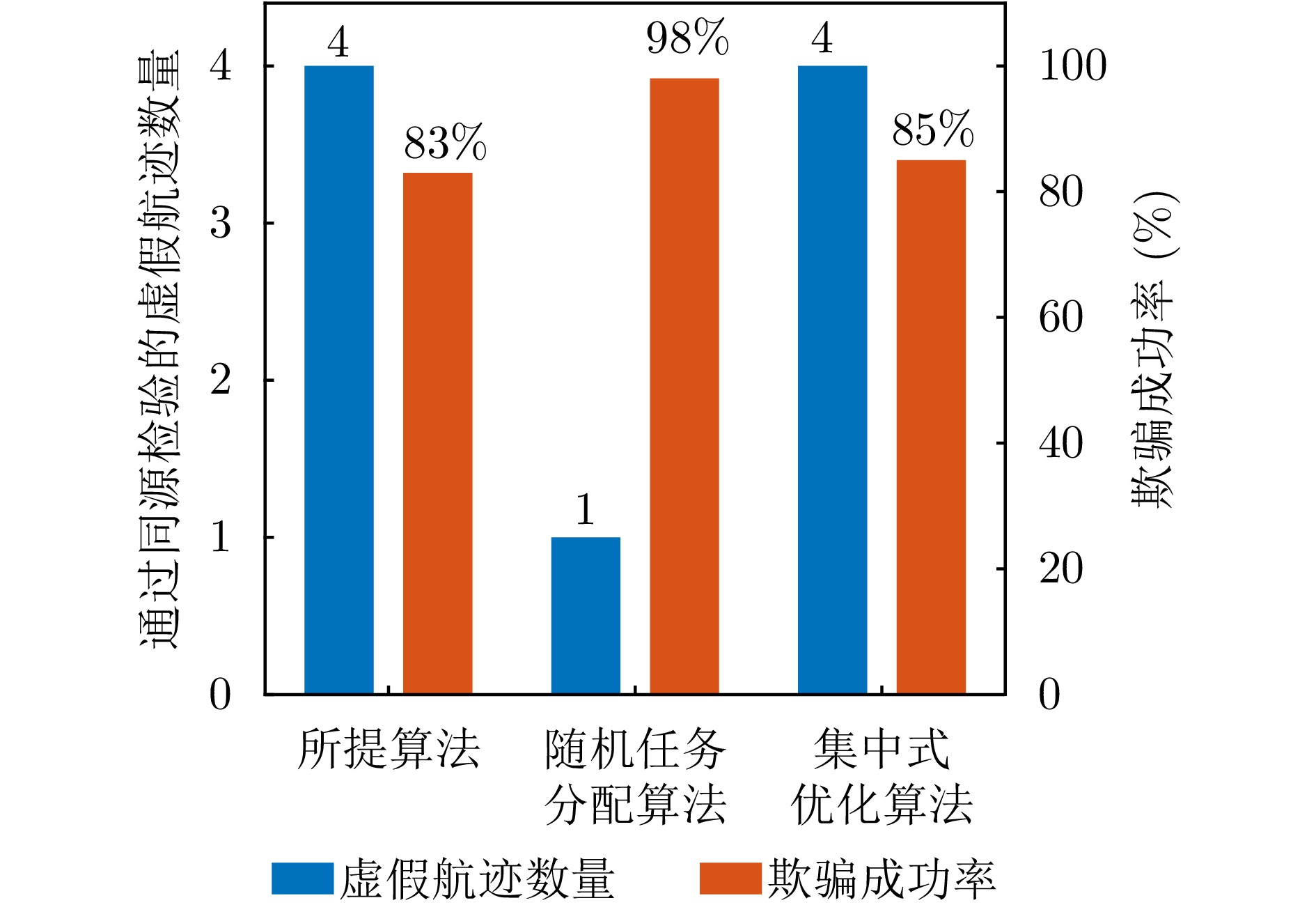针对无人机集群对组网雷达实施航迹欺骗过程中因平台故障、损毁等导致生成虚假航迹中断的问题,提出面向航迹欺骗的无人机集群任务分配与飞行路径联合博弈优化算法。首先,基于去中心化的集群协作机制,构建针对组网雷达的无人机集群航迹欺骗合作博弈模型。在此基础上,根据组网雷达同源检验准则,以最大化无人机集群航迹欺骗博弈效用函数为优化目标,以满足集群动力学性能与任务分配限制为约束条件,建立无人机集群航迹欺骗博弈优化模型,并通过严格势博弈理论证明纳什均衡解的存在性与收敛性。针对上述非凸、非线性混合整数优化问题,采用基于分布式联盟博弈和遗传算法的迭代算法进行求解。仿真结果表明,与现有算法相比,所提算法能够在平台故障、损毁等情况下,对无人机集群欺骗干扰任务和飞行路径进行联合重规划,提升针对组网雷达生成虚假航迹的连续性和航迹欺骗效果。