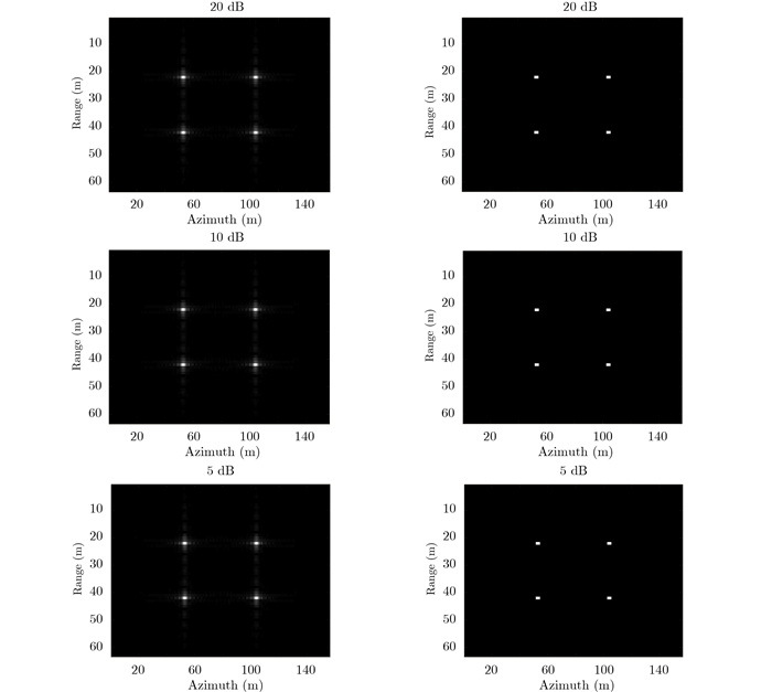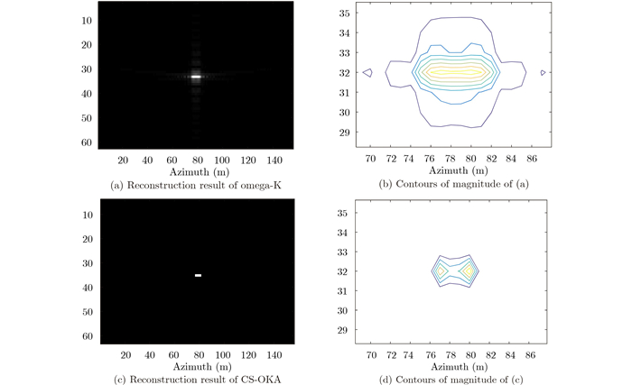很多文献已经证明压缩感知应用在SAR成像中的有效性.现有的CS-SAR成像算法非常耗时, 尤其是对于高分辨率的图像来说更甚.该文针对稀疏场景提出了一种基于omega-K算法, 精确且高效的CS-SAR成像算法——CS-OKA算法.我们首先推导出了omega-K算法的逆算子, 可不通过发射信号和场景的卷积来直接得到回波信号.在此基础上我们将SAR成像问题建立为一个稀疏优化问题, 并用迭代阈值的方法来求解.仿真结果表明, 当场景稀疏时该文的方法可以在远低于Nyquist采样率的前提下有效地恢复出原始场景, 并且时耗和存储量都显著降低. 很多文献已经证明压缩感知应用在SAR成像中的有效性.现有的CS-SAR成像算法非常耗时, 尤其是对于高分辨率的图像来说更甚.该文针对稀疏场景提出了一种基于omega-K算法, 精确且高效的CS-SAR成像算法——CS-OKA算法.我们首先推导出了omega-K算法的逆算子, 可不通过发射信号和场景的卷积来直接得到回波信号.在此基础上我们将SAR成像问题建立为一个稀疏优化问题, 并用迭代阈值的方法来求解.仿真结果表明, 当场景稀疏时该文的方法可以在远低于Nyquist采样率的前提下有效地恢复出原始场景, 并且时耗和存储量都显著降低.