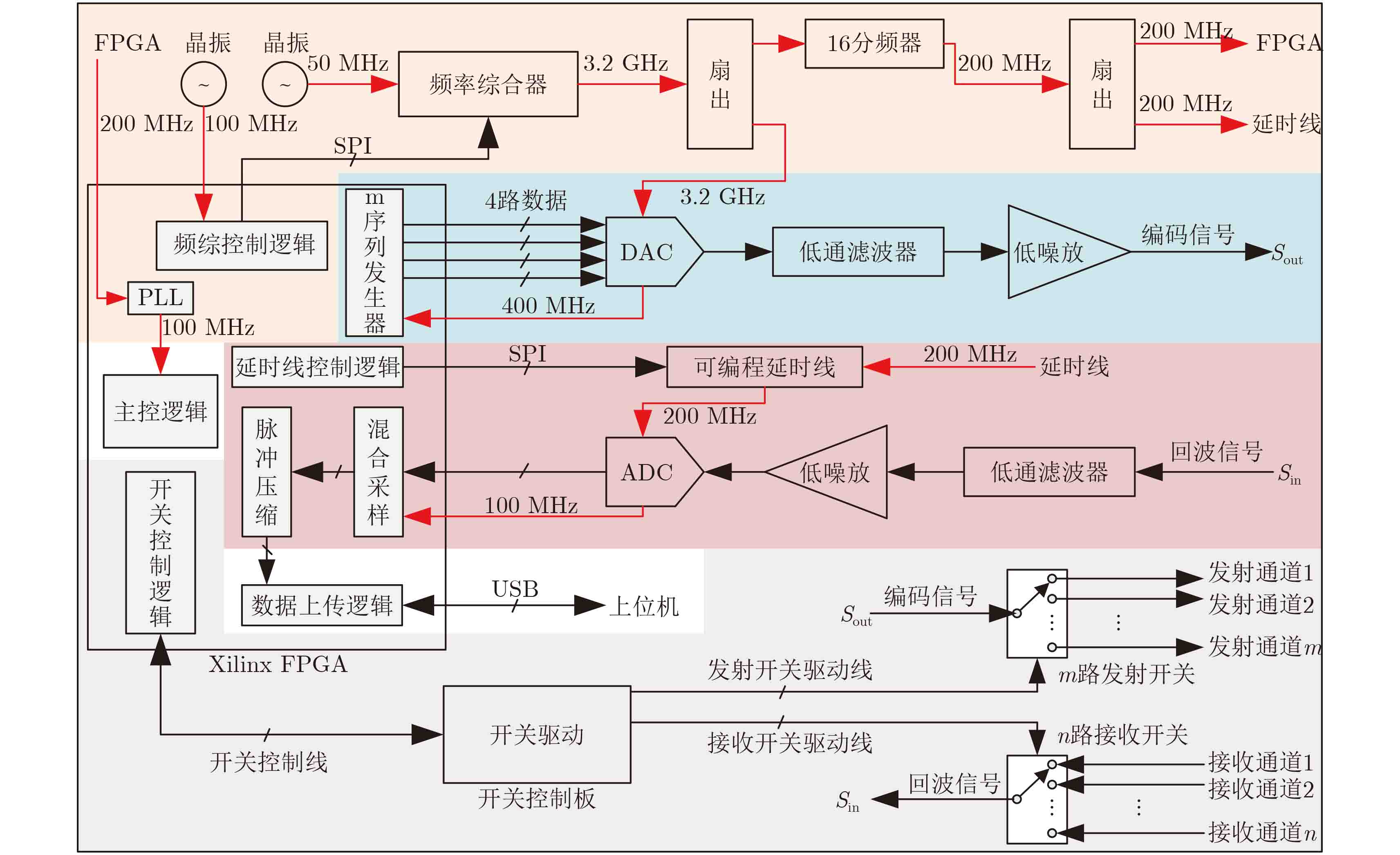 多发多收超宽带雷达能实时探测到目标的距离向和方位向信息,在地质勘测、生命救援、穿墙目标跟踪等领域具有重要的应用价值。该文提出一种基于射频开关切换的伪随机编码超宽带多发多收雷达设计方法,研制出一套伪随机编码超宽带MIMO雷达系统。为了降低系统的成本和复杂性,采用射频开关切换的方法来实现多发多收。由于射频开关的耐压值有限,采用峰值功率为18 dBm的伪随机编码信号作为雷达发射信号。最后通过混合采样方法实现超宽带信号的采样接收,并且调用FPGA内部的DSP硬核来进行实时脉冲压缩,以缓解后续数据处理运算量大的问题。实验结果表明,该雷达系统能实时探测到目标的方位向和距离向信息。 多发多收超宽带雷达能实时探测到目标的距离向和方位向信息,在地质勘测、生命救援、穿墙目标跟踪等领域具有重要的应用价值。该文提出一种基于射频开关切换的伪随机编码超宽带多发多收雷达设计方法,研制出一套伪随机编码超宽带MIMO雷达系统。为了降低系统的成本和复杂性,采用射频开关切换的方法来实现多发多收。由于射频开关的耐压值有限,采用峰值功率为18 dBm的伪随机编码信号作为雷达发射信号。最后通过混合采样方法实现超宽带信号的采样接收,并且调用FPGA内部的DSP硬核来进行实时脉冲压缩,以缓解后续数据处理运算量大的问题。实验结果表明,该雷达系统能实时探测到目标的方位向和距离向信息。